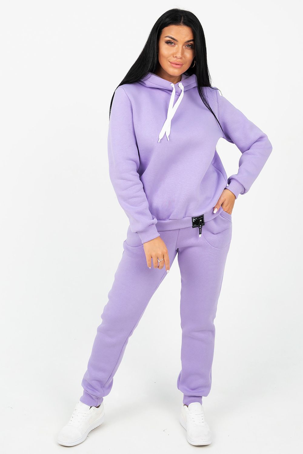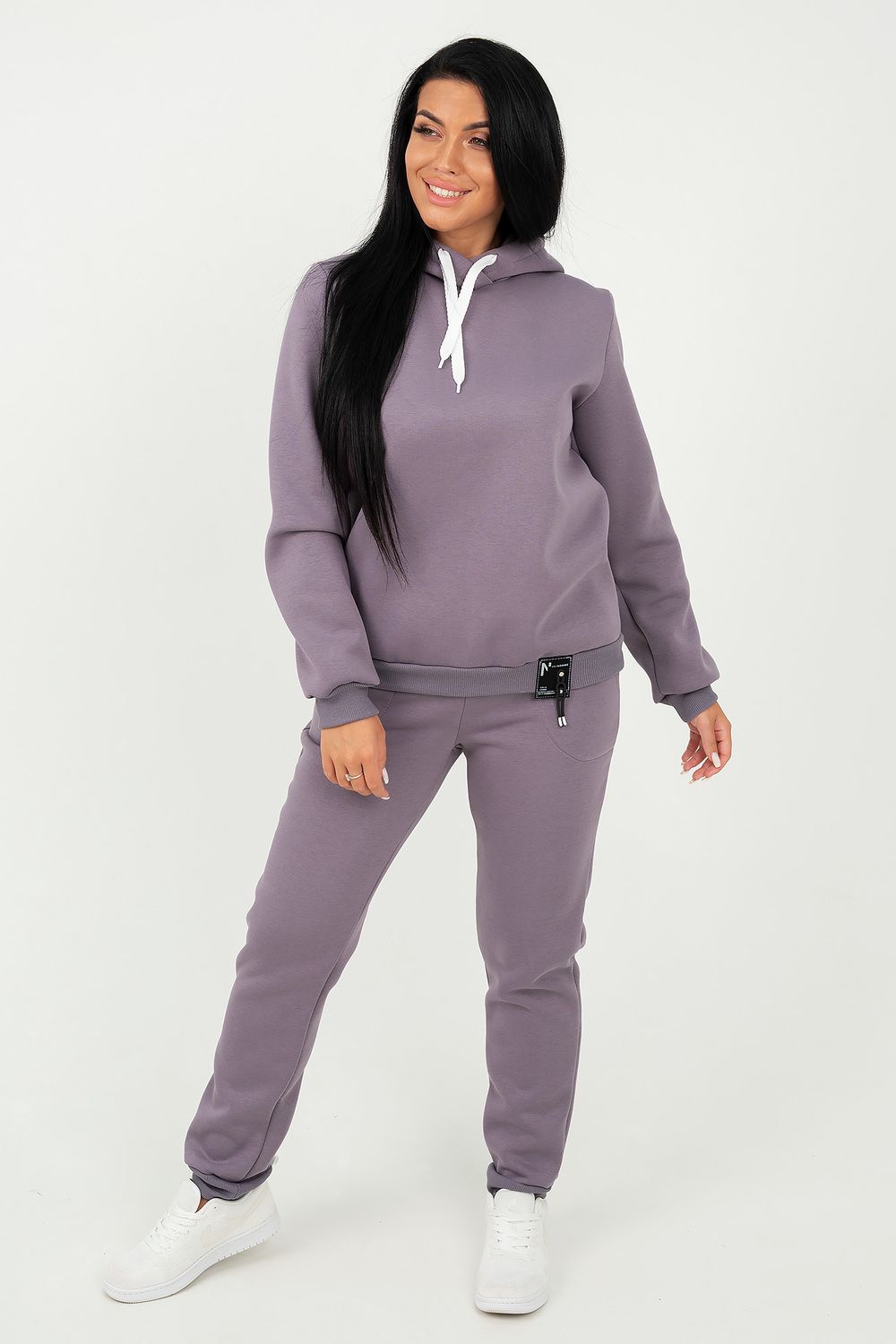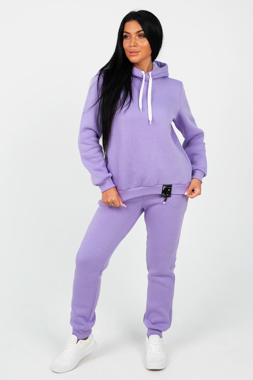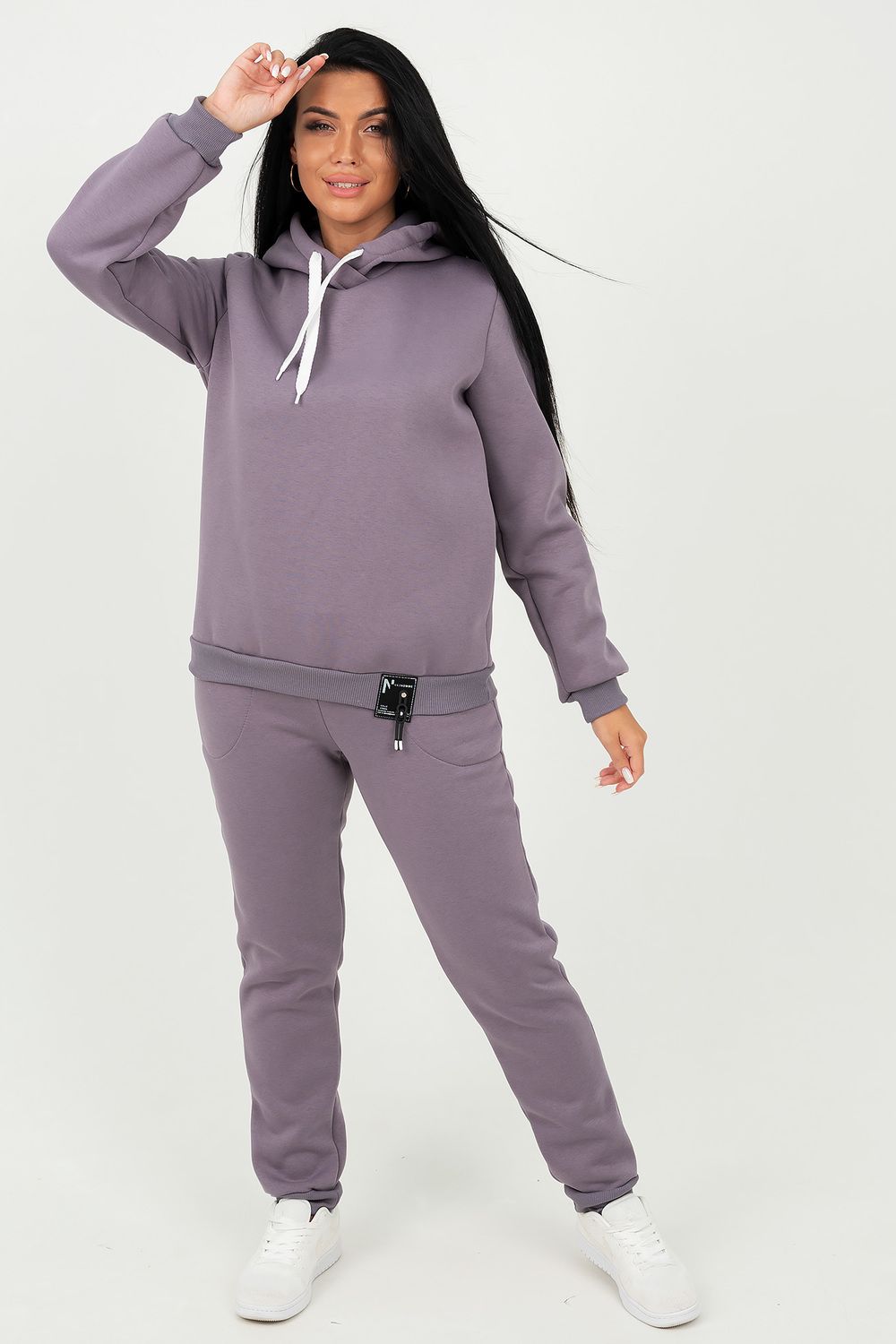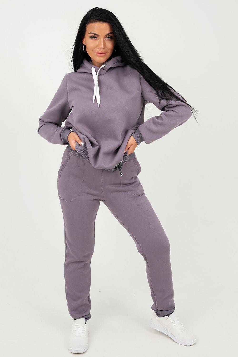 Костюм состоит из толстовки с капюшоном и брюк, выполненных их плотного хлопкового трикотажа - футер 3х-нитка с начесом. Капюшон фиксируется шнуром. Пояс и манжет рукава толстовки выполнен из кашкорсе. Низ декорирован шевроном. Брюки с высокой посадкой, на резинке, с боковыми карманами, манжеты из кашкорсе. Отличный вариант для домашнего гардероба, спортивного, повседневного образа. Такая модель особенно удобна и комфортна в прохладное время года. Футер 3-х нитка с начесом очень приятен и мягок на ощупь.