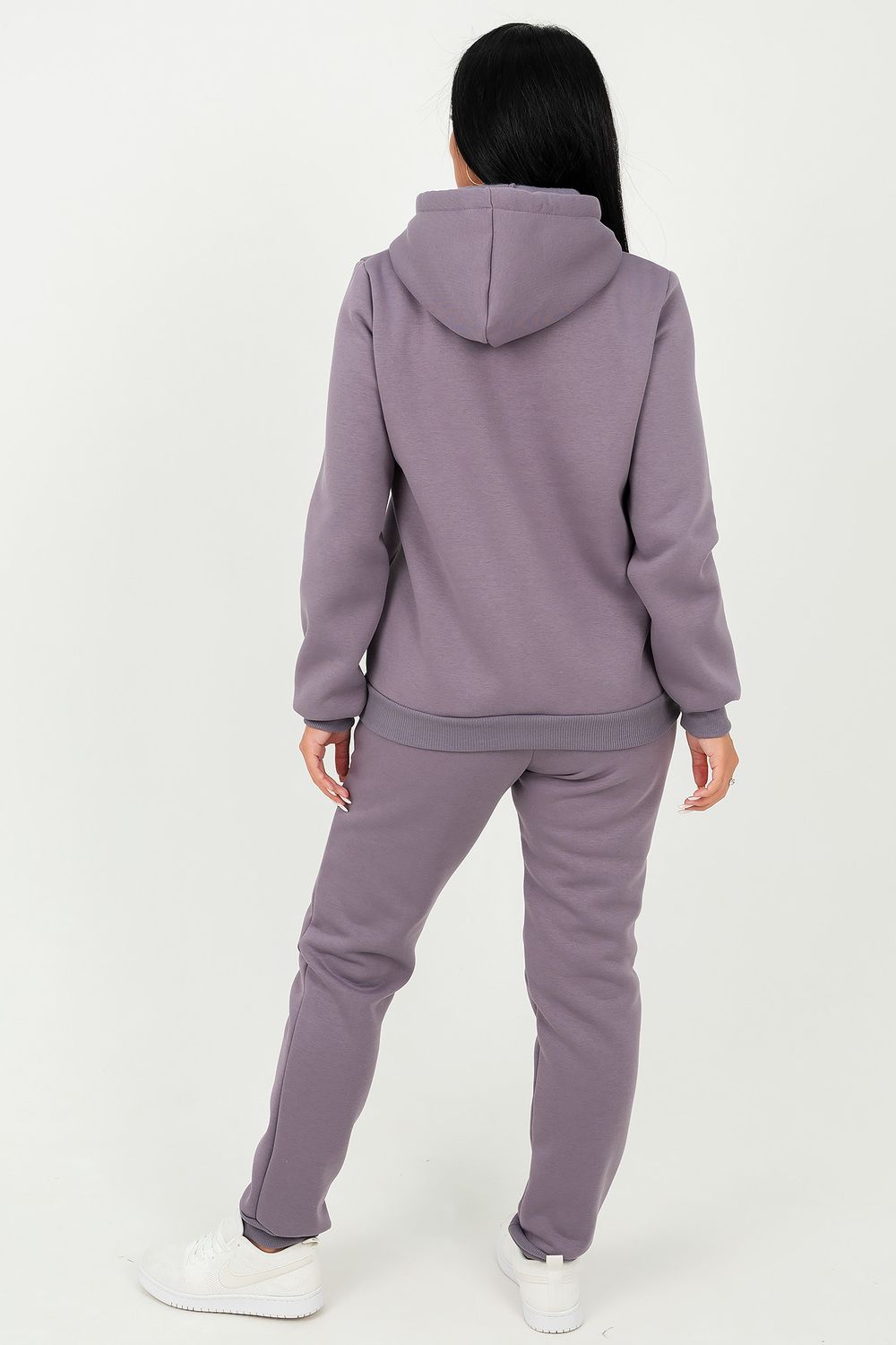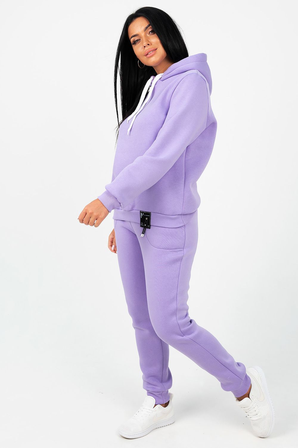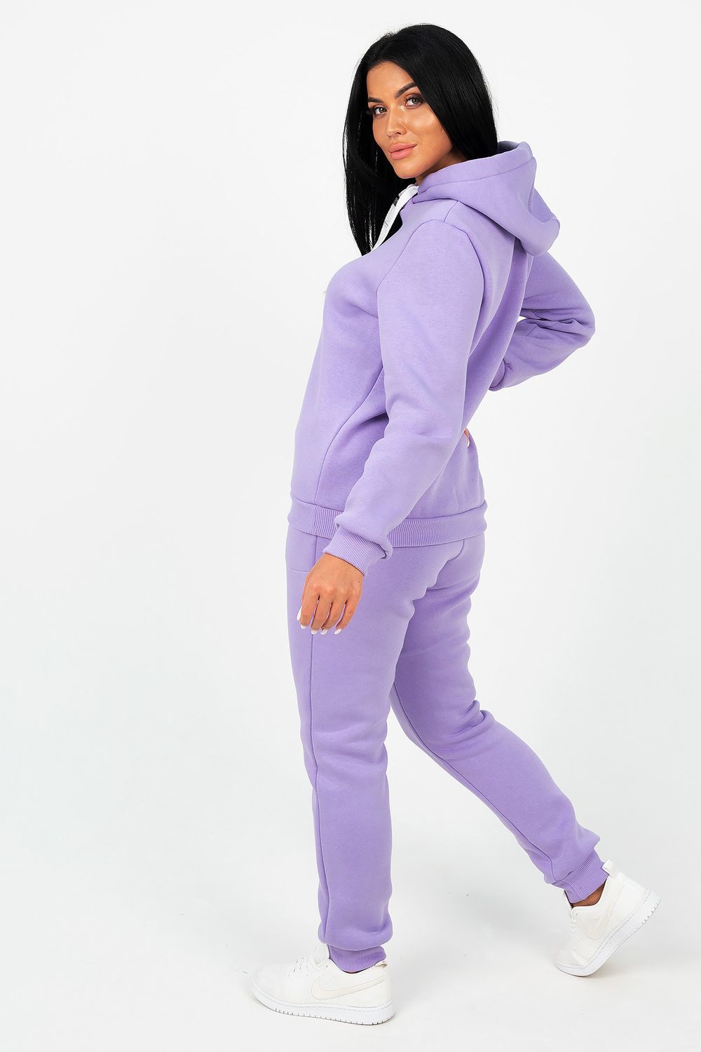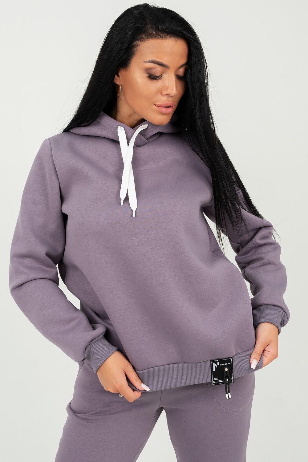 Костюм состоит из толстовки с капюшоном и брюк, выполненных их плотного хлопкового трикотажа - футер 3х-нитка с начесом. Капюшон фиксируется шнуром. Пояс и манжет рукава толстовки выполнен из кашкорсе. Низ декорирован шевроном. Брюки с высокой посадкой, на резинке, с боковыми карманами, манжеты из кашкорсе. Отличный вариант для домашнего гардероба, спортивного, повседневного образа. Такая модель особенно удобна и комфортна в прохладное время года. Футер 3-х нитка с начесом очень приятен и мягок на ощупь.