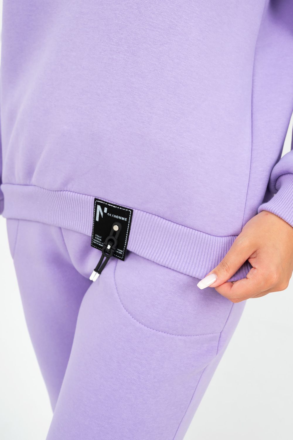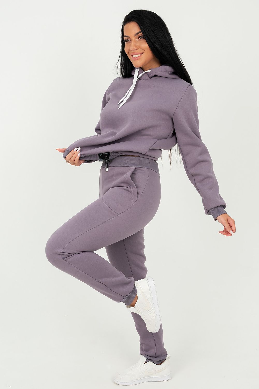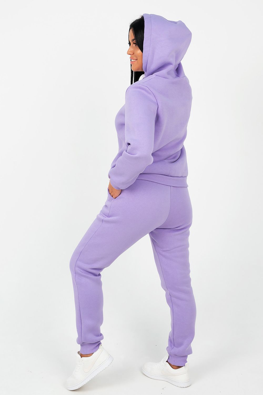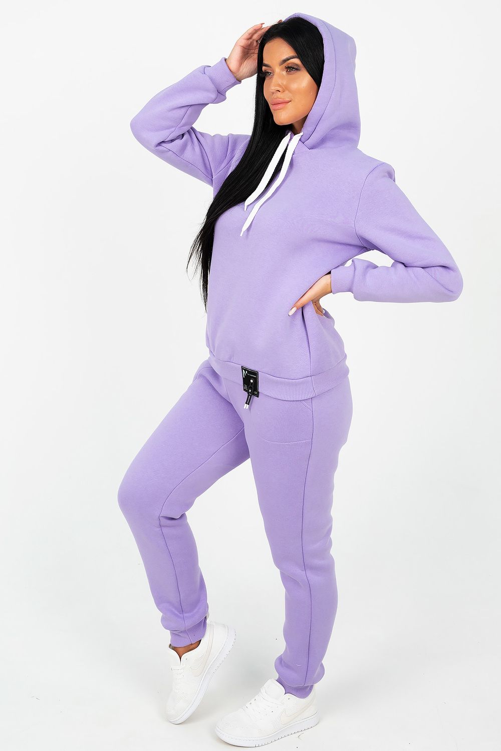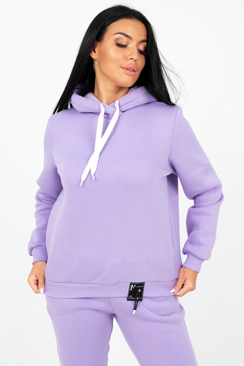 Костюм состоит из толстовки с капюшоном и брюк, выполненных их плотного хлопкового трикотажа - футер 3х-нитка с начесом. Капюшон фиксируется шнуром. Пояс и манжет рукава толстовки выполнен из кашкорсе. Низ декорирован шевроном. Брюки с высокой посадкой, на резинке, с боковыми карманами, манжеты из кашкорсе. Отличный вариант для домашнего гардероба, спортивного, повседневного образа. Такая модель особенно удобна и комфортна в прохладное время года. Футер 3-х нитка с начесом очень приятен и мягок на ощупь.