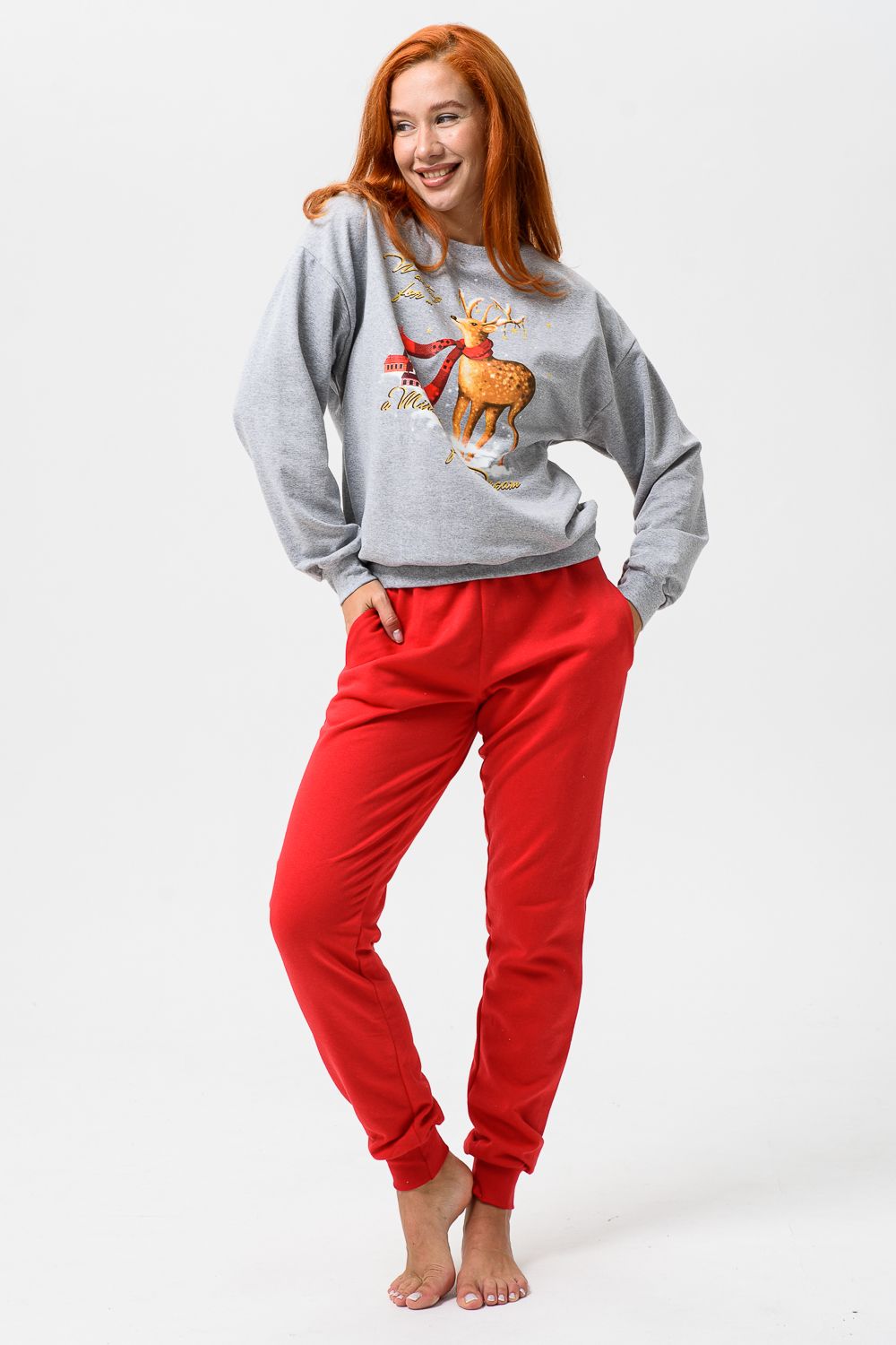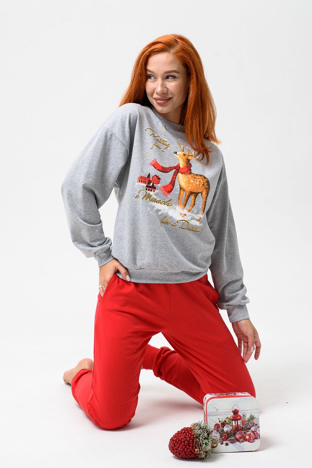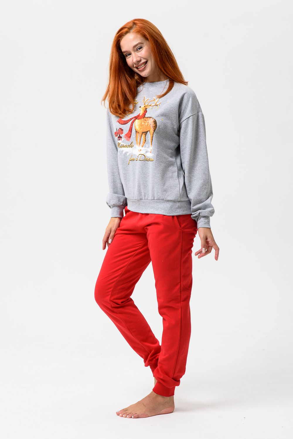 Олени - неотъемлемый атрибут Рождества. Традиция использовать в новогоднем убранстве рождественских оленей завоевала большую популярность во всём мире. В этом уютном удобном костюме из футера 2х нитки с начёсом комфортно находиться в домашней обстановке. В нём можно встретить праздник и использовать в качестве подарка. Костюм состоит из свитшота свободного кроя и брючек с карманами в боковых швах. Все манжеты на костюме выполнены из плотной резинки - кашкорсе. Пояс обработан плотной резинкой 3см. После стирки может быть небольшая усадка, поэтому имеется напуск. Длина рукава в измерениях указана от основания шеи.