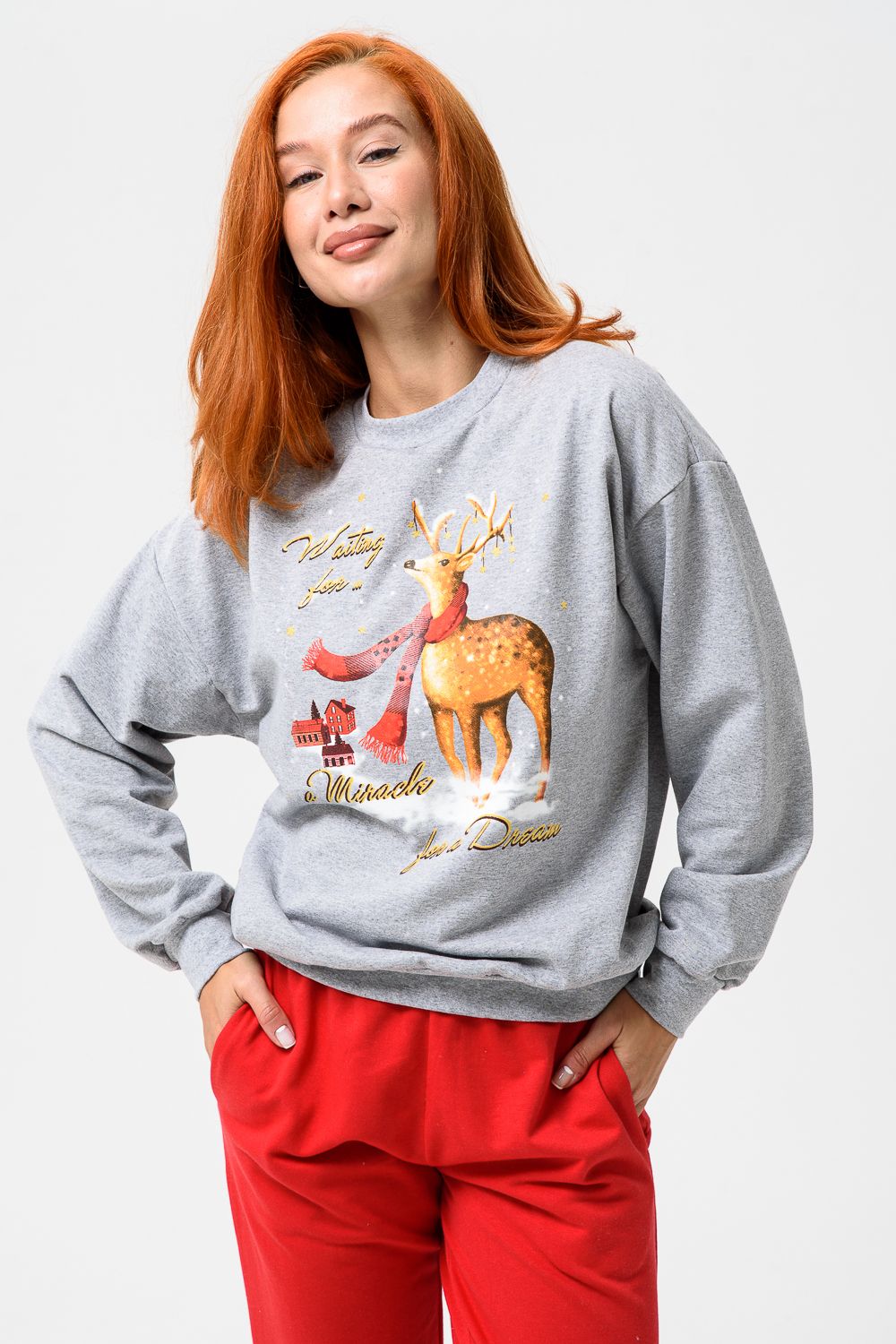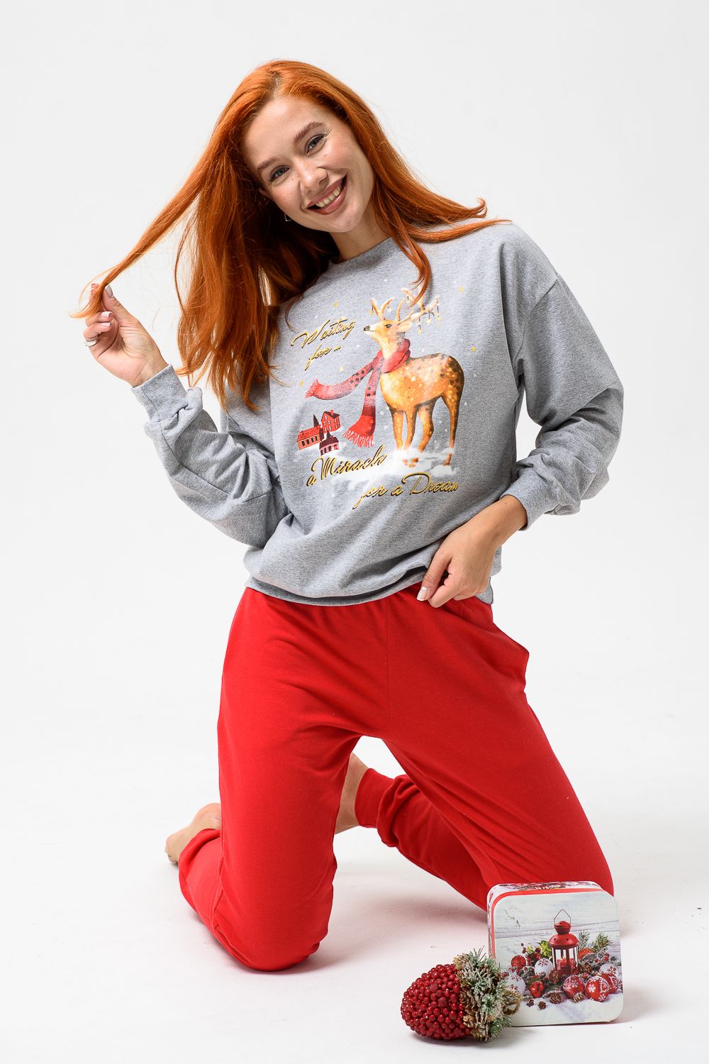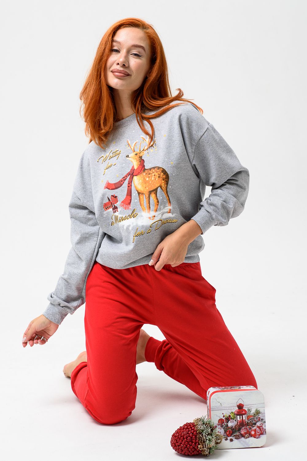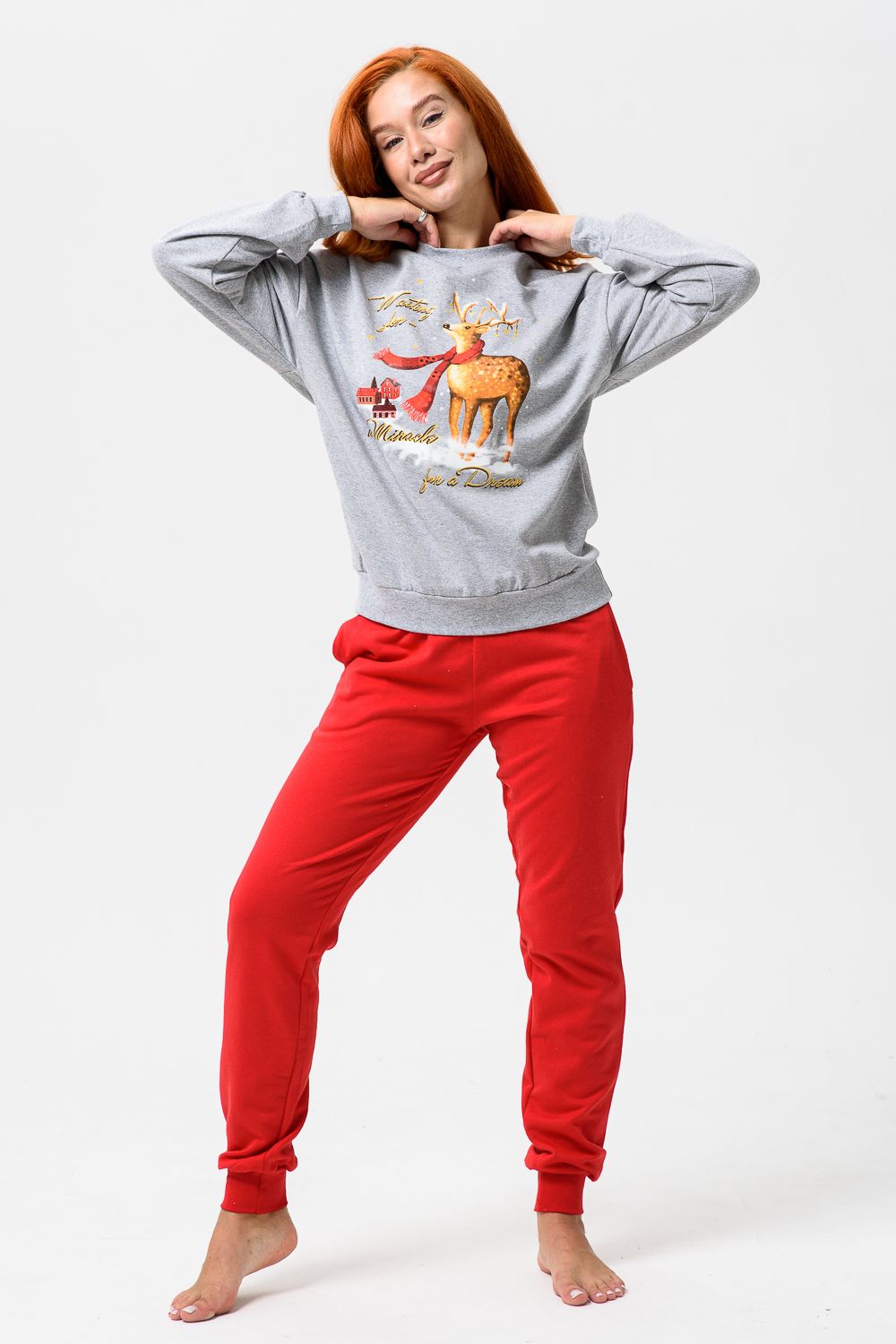 Олени - неотъемлемый атрибут Рождества. Традиция использовать в новогоднем убранстве рождественских оленей завоевала большую популярность во всём мире. В этом уютном удобном костюме из футера 2х нитки с начёсом комфортно находиться в домашней обстановке. В нём можно встретить праздник и использовать в качестве подарка. Костюм состоит из свитшота свободного кроя и брючек с карманами в боковых швах. Все манжеты на костюме выполнены из плотной резинки - кашкорсе. Пояс обработан плотной резинкой 3см. После стирки может быть небольшая усадка, поэтому имеется напуск. Длина рукава в измерениях указана от основания шеи.