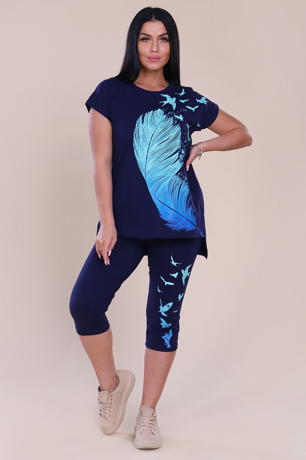 Женский костюм из лёгкого и мягкого 100% хлопка — отличный выбор для любого случая. Состоящий из футболки с удлиненной спинкой и стильных бриджей, он не только удобен, но и подчеркивает индивидуальность благодаря элегантному анималистическому принту "Пташка". Костюм представлен в широком размерном ряде от 46 до 60, что позволяет каждой женщине найти идеальный вариант для своей фигуры.