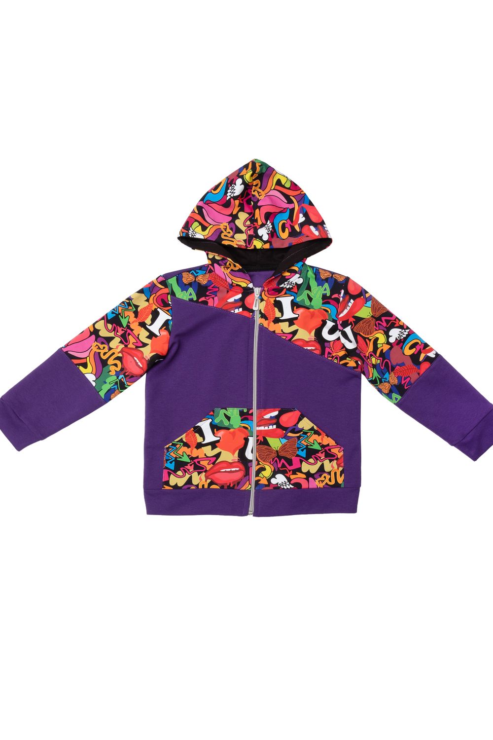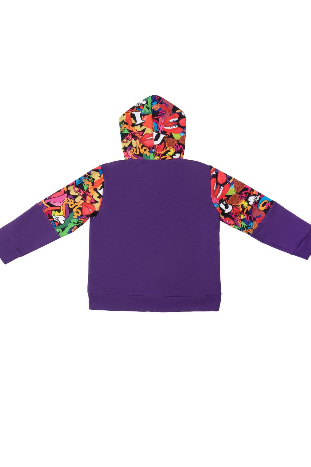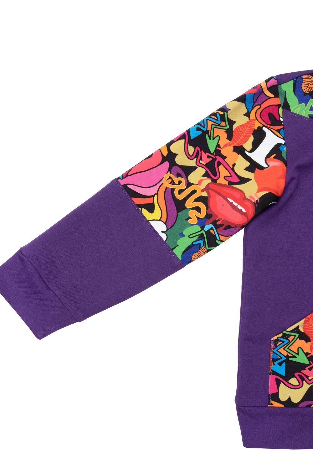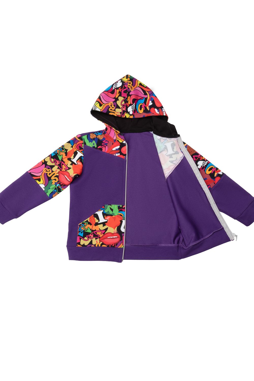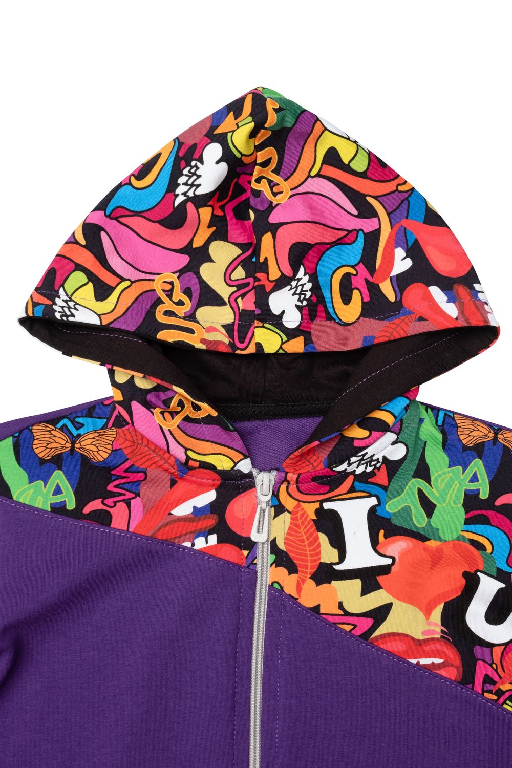 Костюм выполнен из футера двунитки. Комплект из брюк и худи на молнии с капюшоном. Яркие принты на плечах и в центральной части худи. Брюки выполнены в однотонном исполнении со стандартной линией талии.