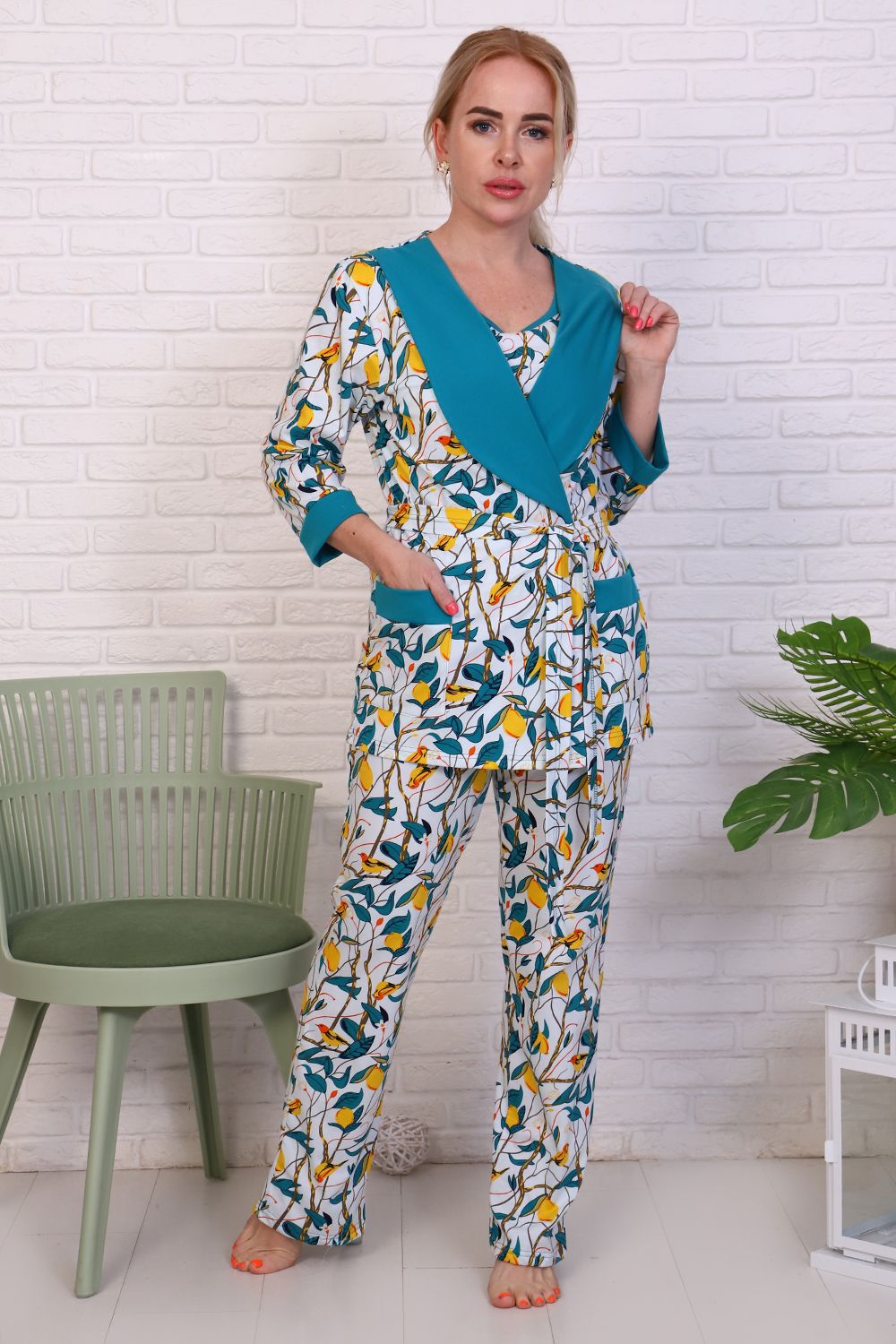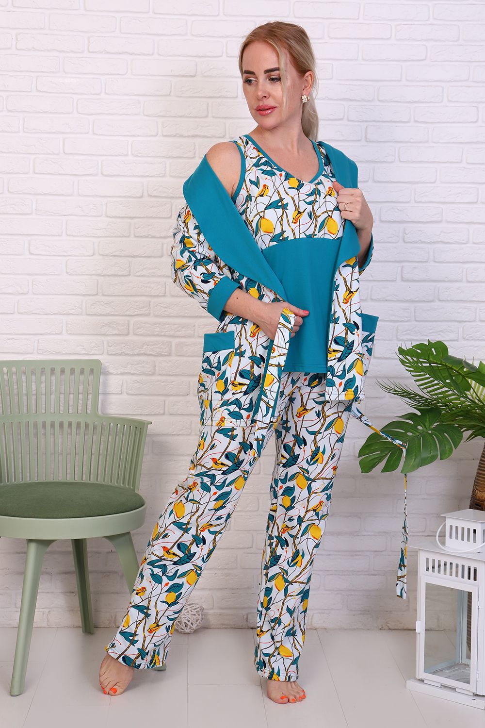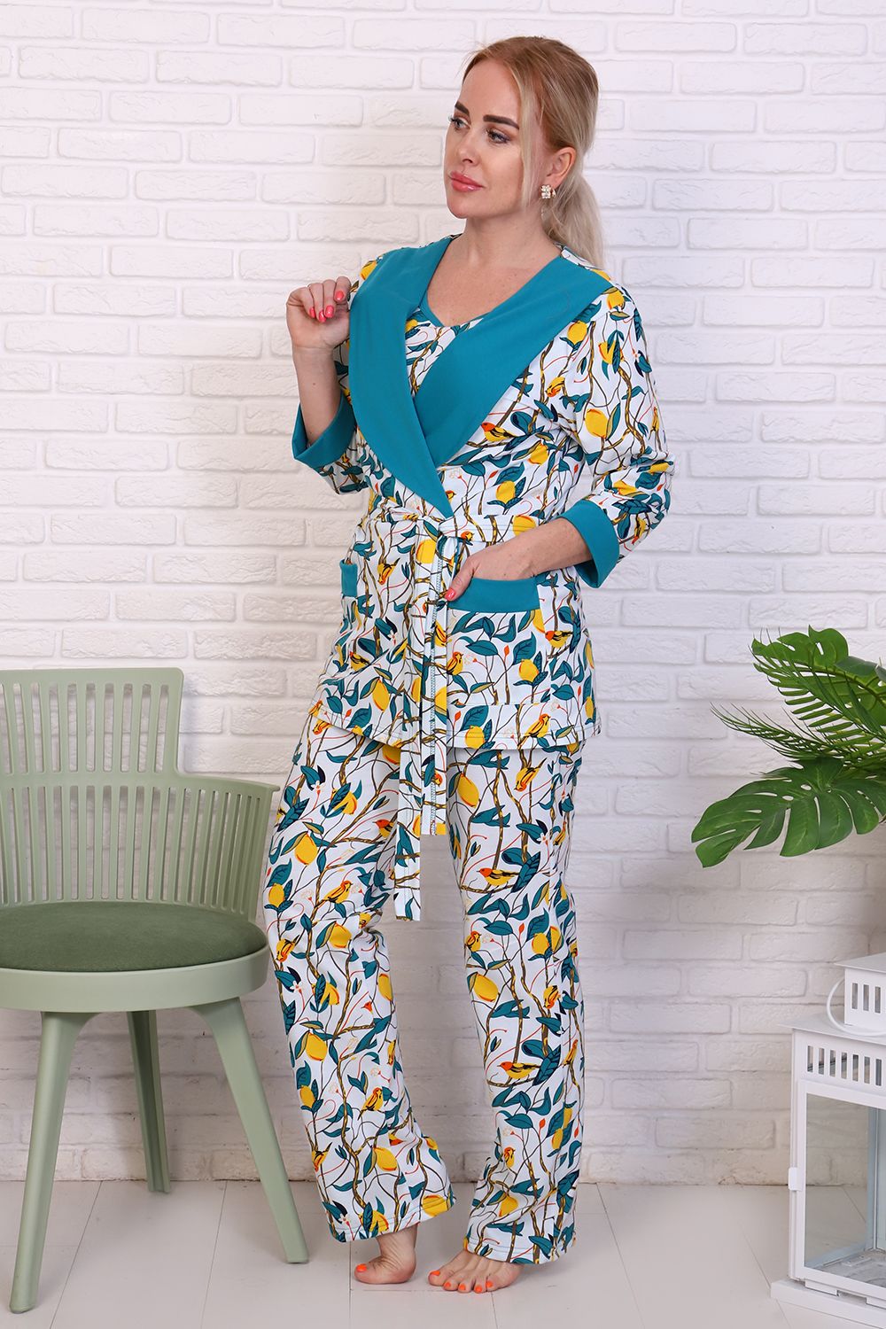 Женский комплект из кулирки - халат, топ и брюки. Халат с воротником "шаль", накладные карманы, рукава чуть ниже локтей. Майка с отрезной кокеткой, брюки прямые, на резинке