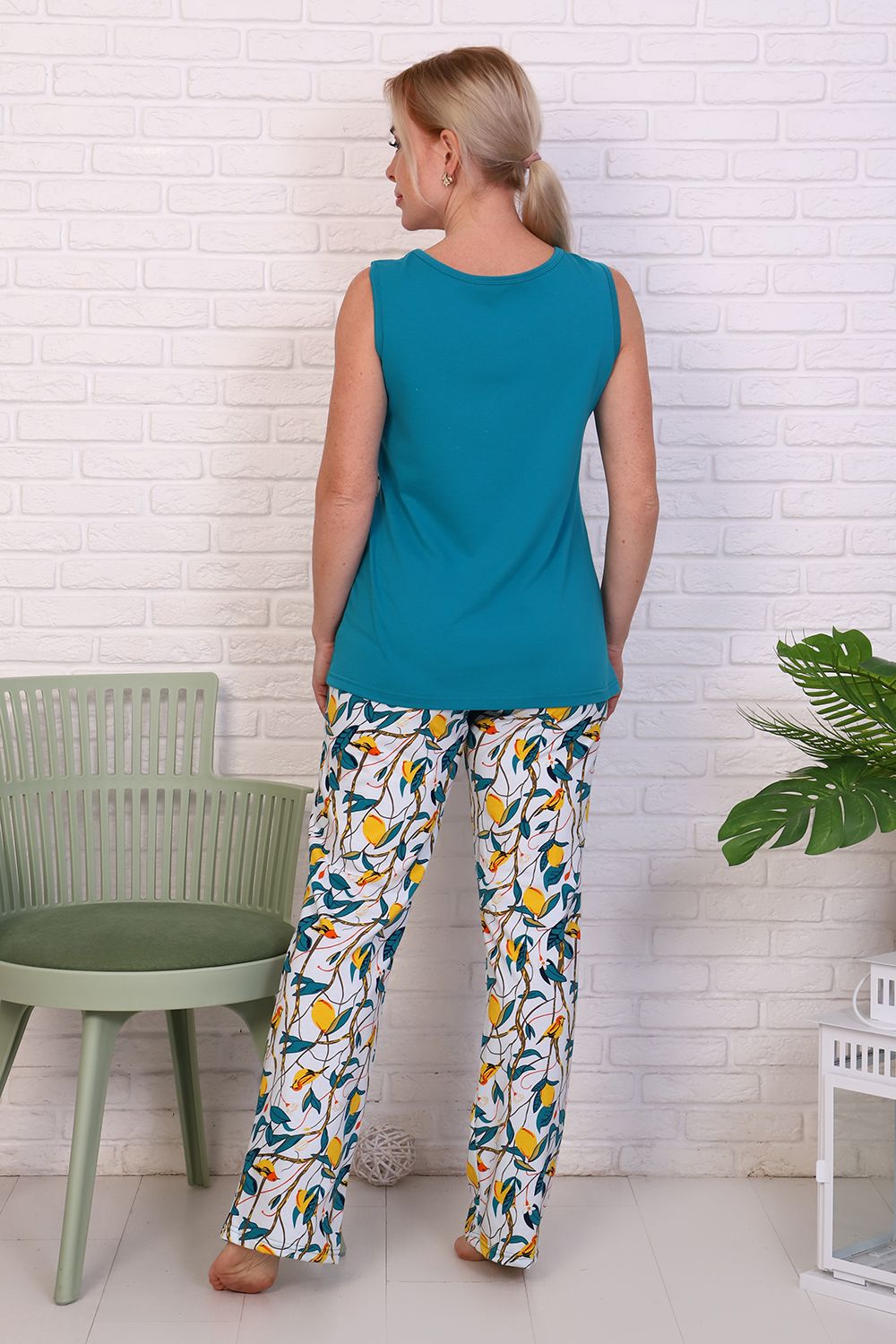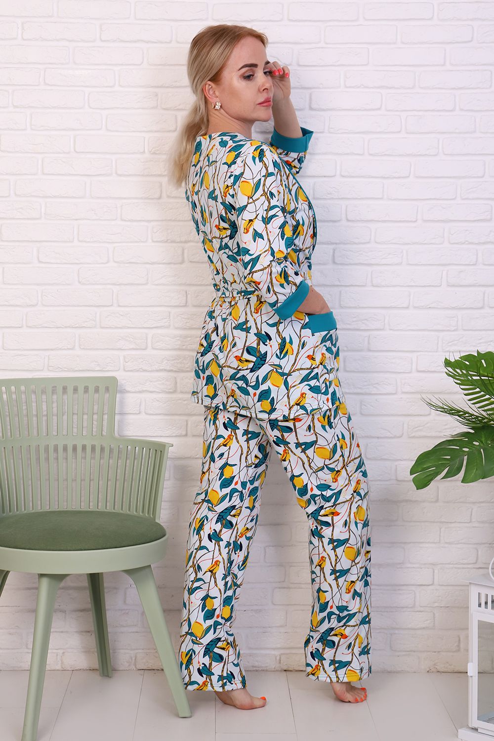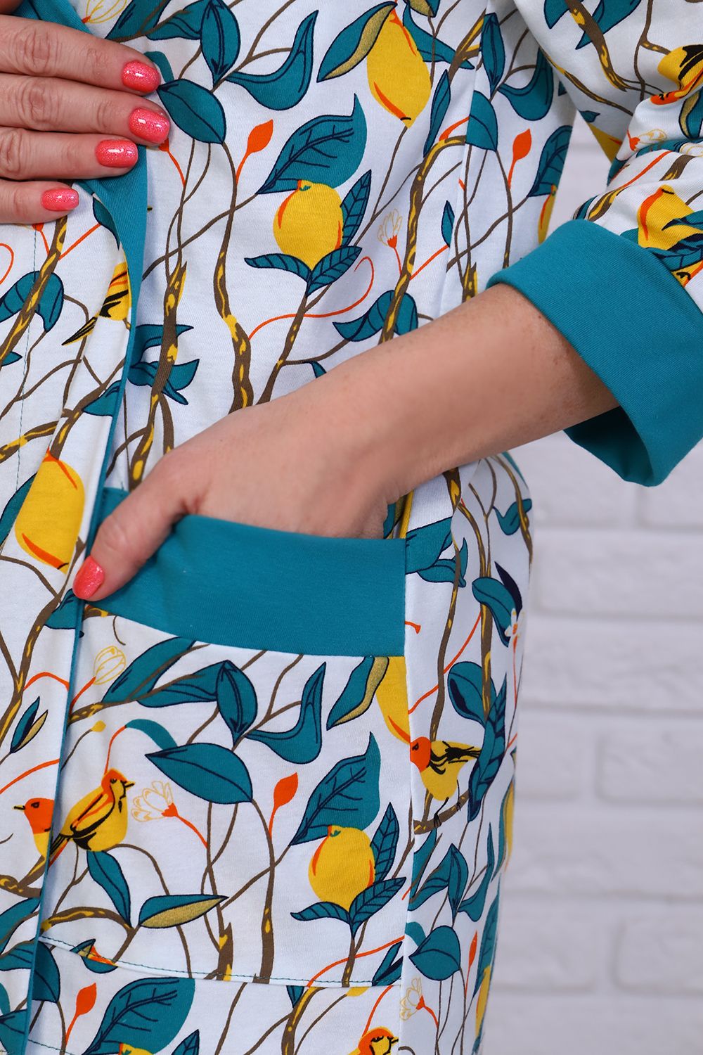 Женский комплект из кулирки - халат, топ и брюки. Халат с воротником "шаль", накладные карманы, рукава чуть ниже локтей. Майка с отрезной кокеткой, брюки прямые, на резинке