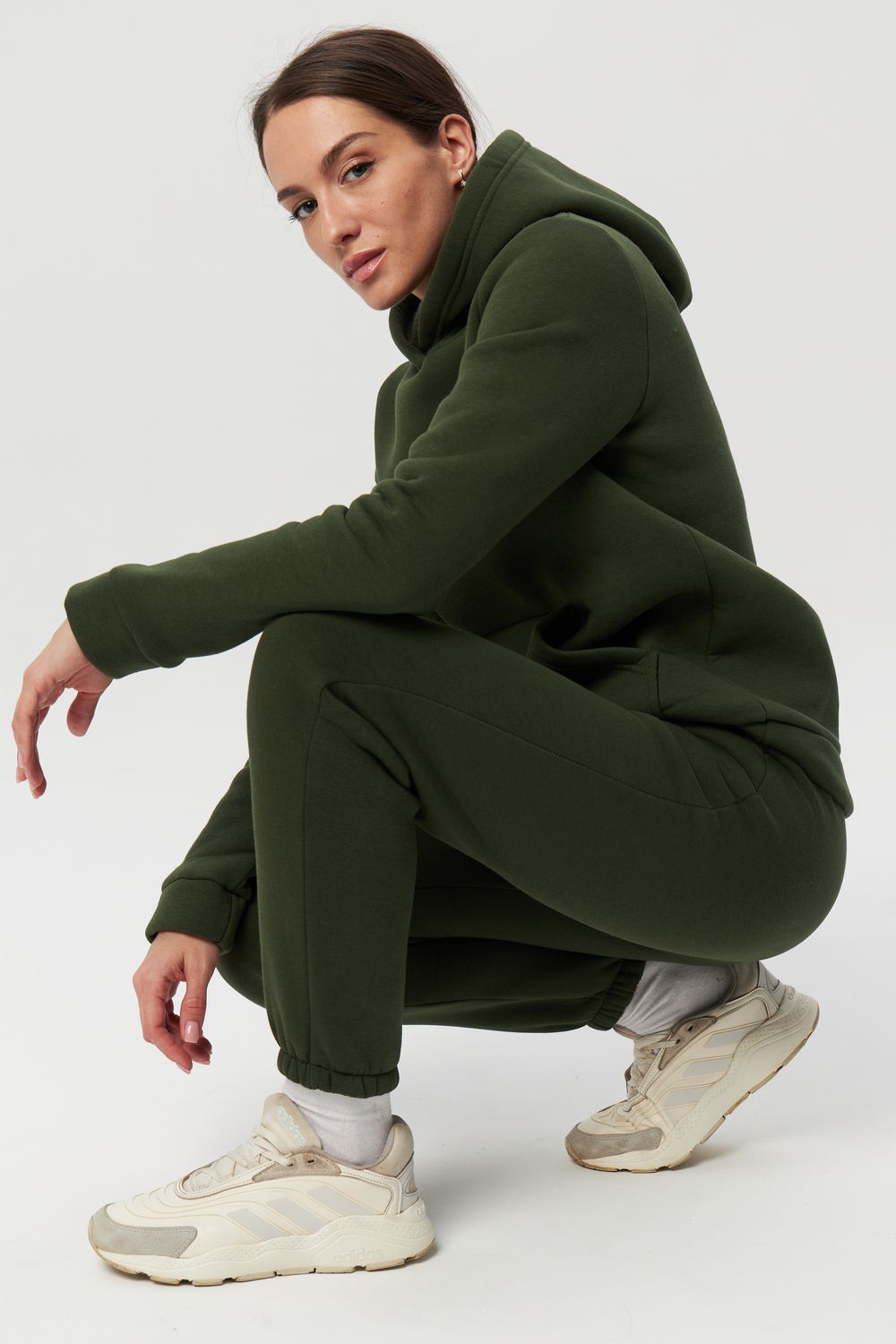 Костюм с начёсом -прекрасный вариант повседневной одежды для осени и зимы. Толстовка прямого кроя, имеет классическую пройму с втачным рукавом с притачными манжетами и поясом из ткани верха. На полочке расположен карман –кенгуру. Капюшон однослойный, он прекрасно защитит голову в прохладную погоду. Брюки на резинке, с боковыми наклонными карманами, по низу штанины вшита внутрь резинка.