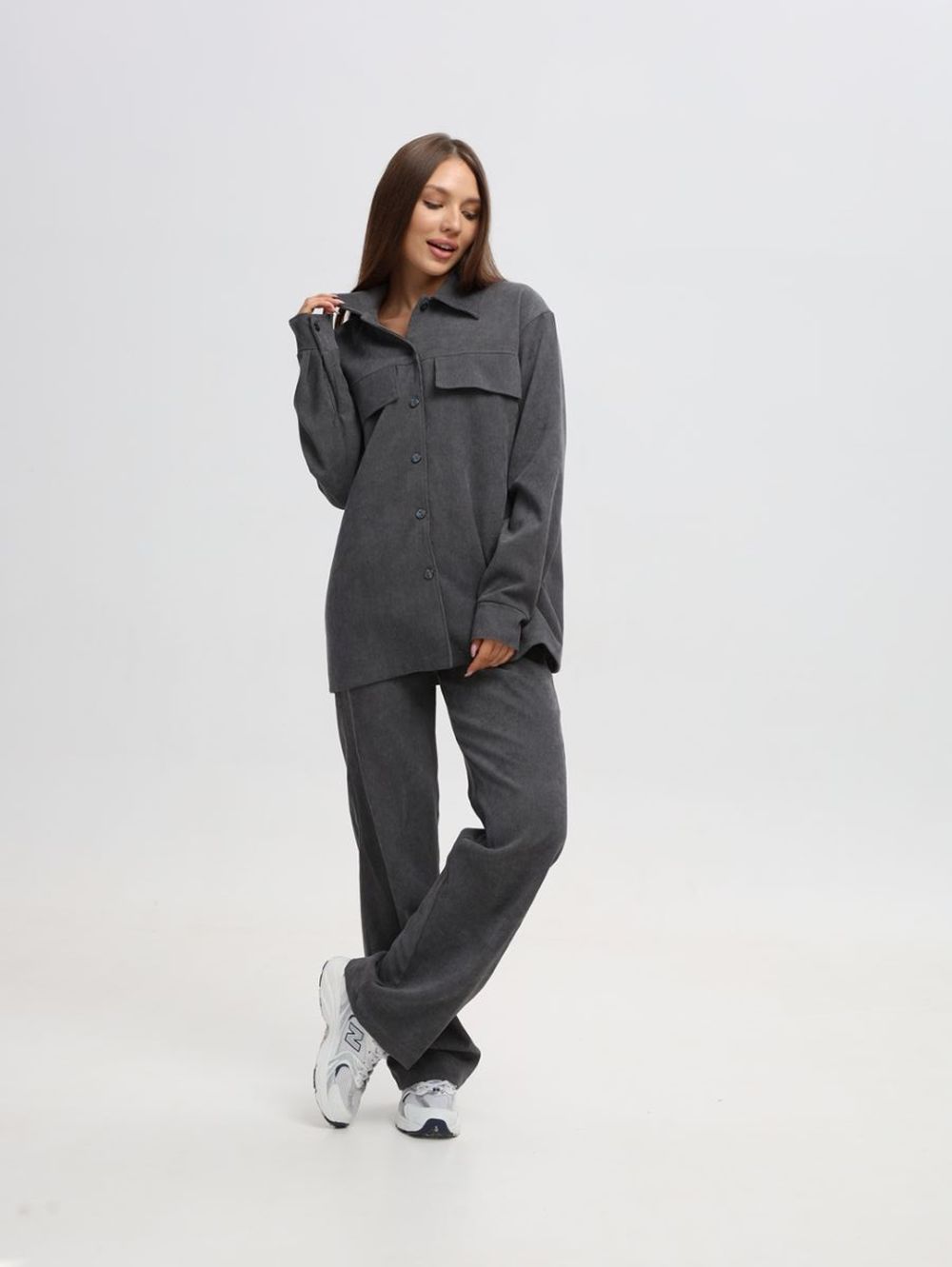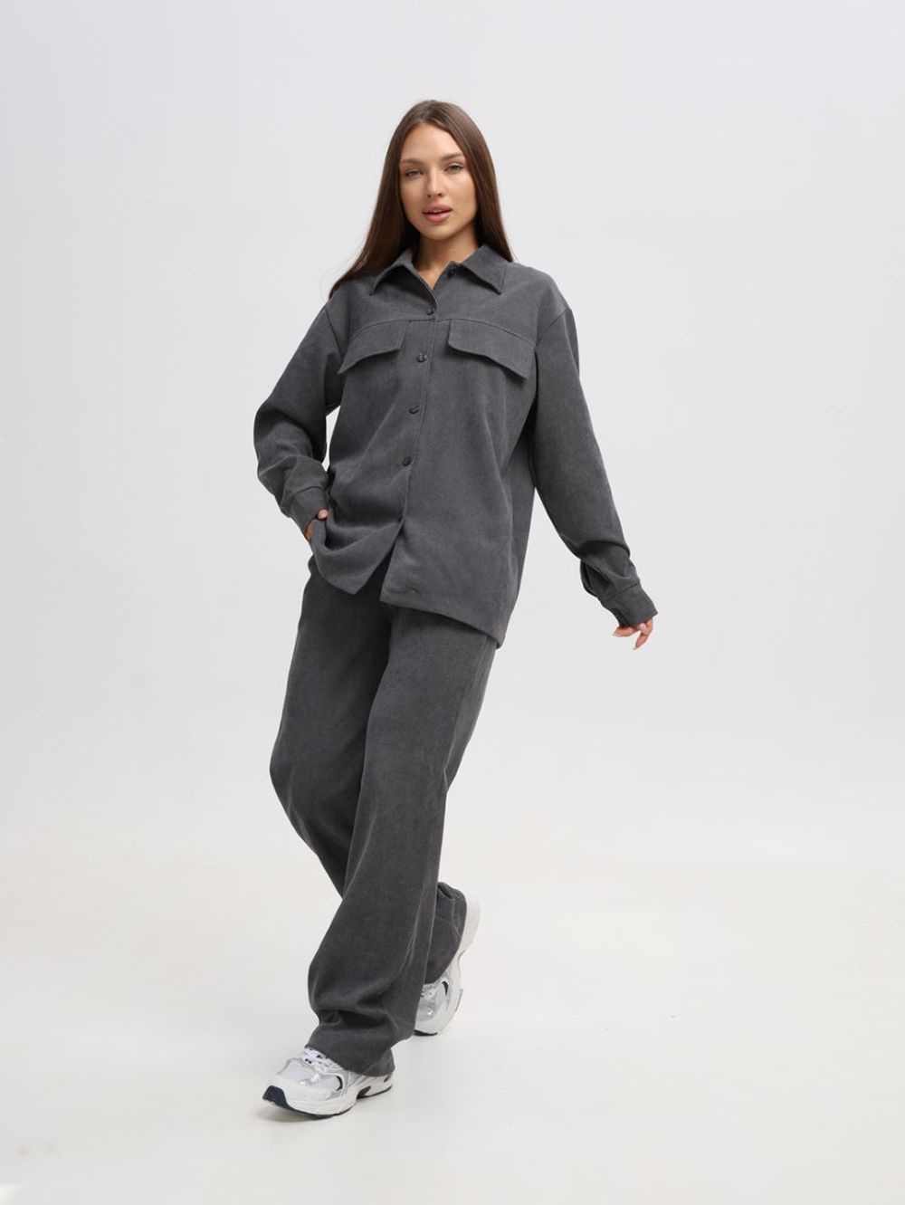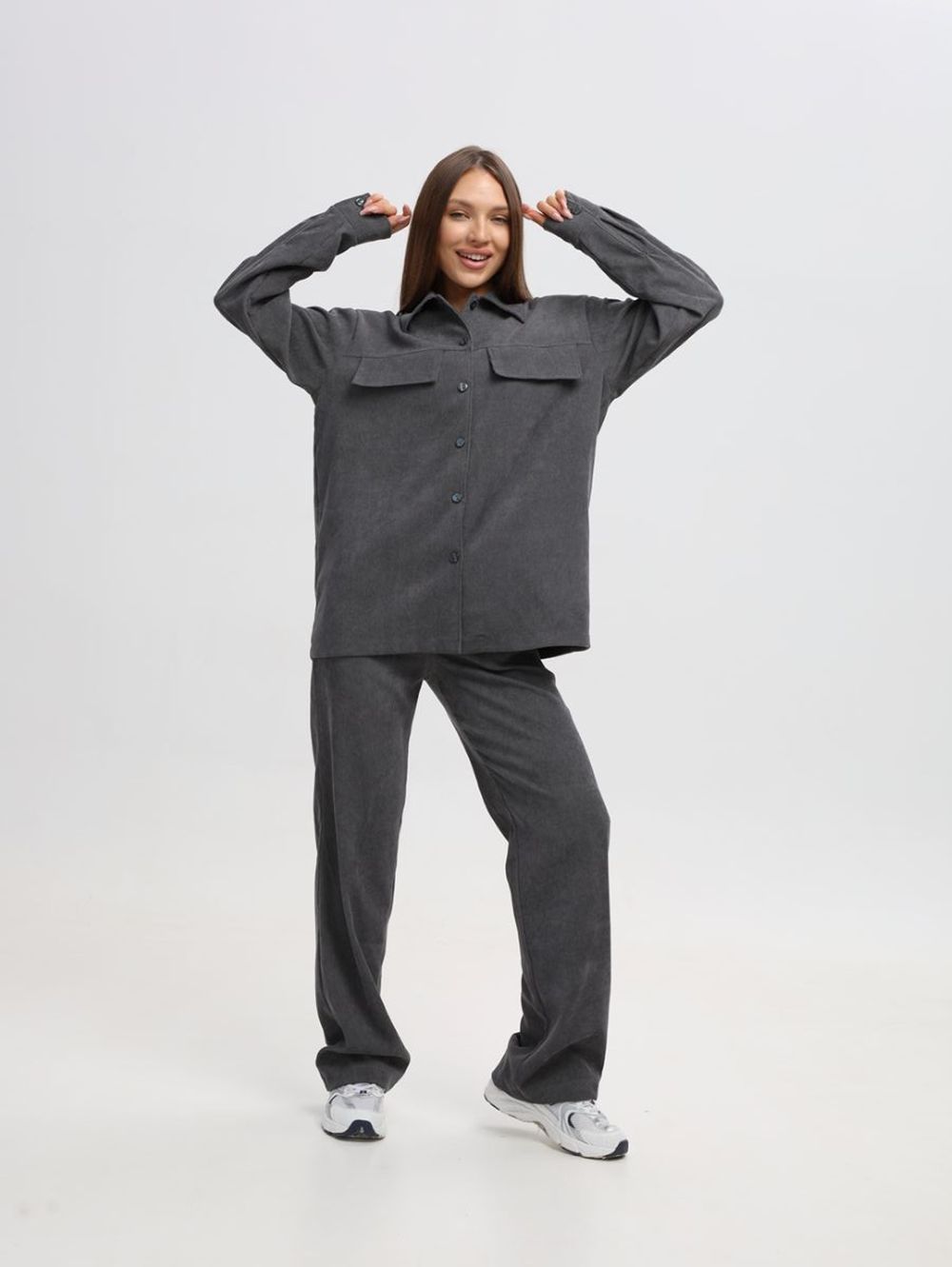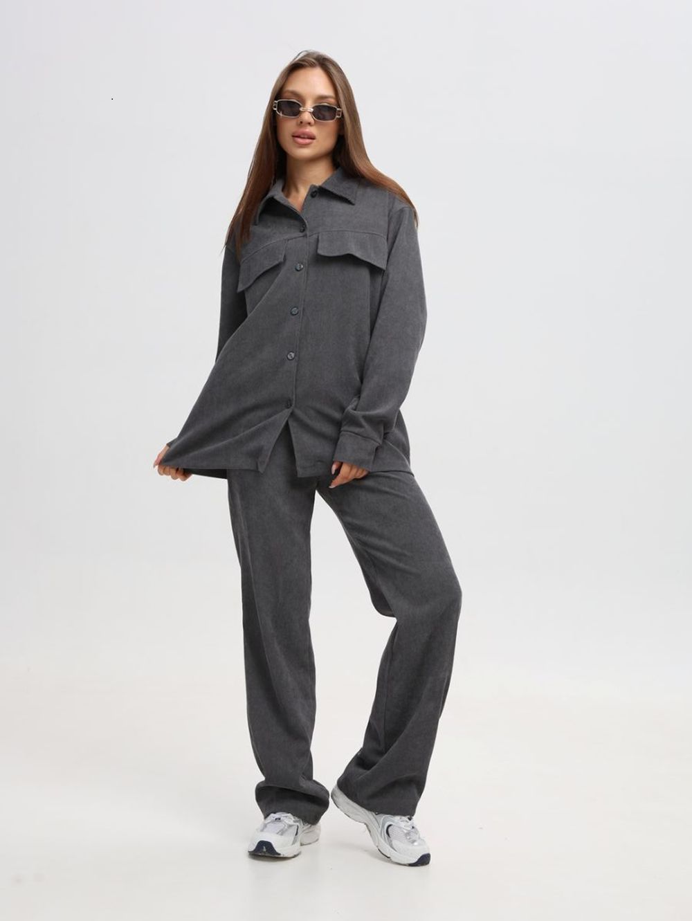 Спортивный женский костюм выполнен из мягкого вельветового материала, который придает ему модный и элегантный вид. Костюм для женщин состоит из рубашки оверсайз и брюк прямого кроя, создающих гармоничный и современный образ. Однотонный оттенок делает его универсальным для разных случаев — от повседневных прогулок до офисного или делового стиля. Рубашка свободного фасона с длинными рукавами украшена классическим воротником и застегивается на пуговицы. Вельвет обладает приятной текстурой, которая сохраняет комфорт даже при длительном ношении. Брюки имеют удобные карманы, прямой силуэт, что делает их подходящими для девушек и женщин разных возрастов. Эластичный пояс обеспечивает удобную посадку, а продуманная длина визуально вытягивает силуэт. Удобная и трендовая одежда в современном стиле, которая дополнит базовые и спортивные образы или молодежный лук в стиле casual (кэжуал). Нарядный костюм отлично подойдет как для осенних прохладных дней, так и для создания стильных летних образов. Женский костюм-двойка отличается универсальностью благодаря сочетанию комфорта и модного дизайна. Он может использоваться как спортивный наряд для активного отдыха или домашний вариант для уюта в холодное время года. Актуальный oversize крой подчеркивает современные тенденции в мире моды.