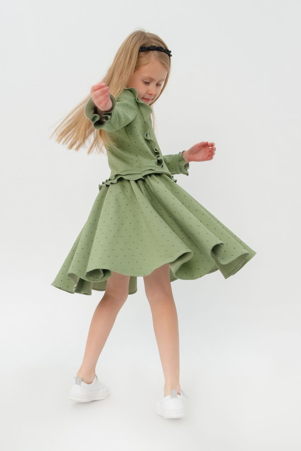 Костюм состоит из лонгслива и юбки, которые имеют узор в мелкий темный горошек. Выполнен из набивного футера, который легок в уходе и стирке. Костюм подойдет как для повседневной носки, так и для особых дней.