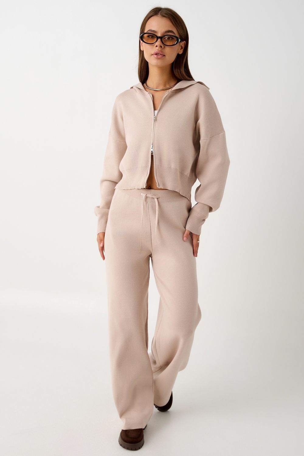 Вязаный костюм станет незаменимой основой женского гардероба для прохладной погоды, комфортным способом утепления. Он сшит из мягкой, приятной к телу пряжи с шерстяными волокнами, которая надолго сохраняет насыщенность цвета и свою форму, выдерживая интенсивное ношение и частые стирки. Стильный дизайнерский комплект отличается продуманным дизайном: кофточка - оверсайз со спущенным плечом, V-образным вырезом горловины и отложным воротником обеспечивает комфорт, а брюки - спортивки с широким поясом - резинкой, длинными штанинами с манжетами и удобными карманами подчеркивают силуэт, не сковывая движений. Универсальность классической пастельной палитры и лаконичного дизайна позволяет легко включать комплект в коллекцию вещей для осенне - весеннего демисезонного и зимнего периода. Он идеально сочетается с однотонными вариантами обуви и нарядными праздничными аксессуарами для создания элегантного и собранного образа.