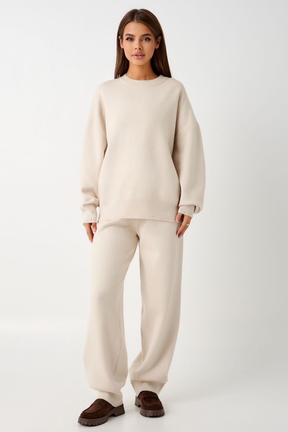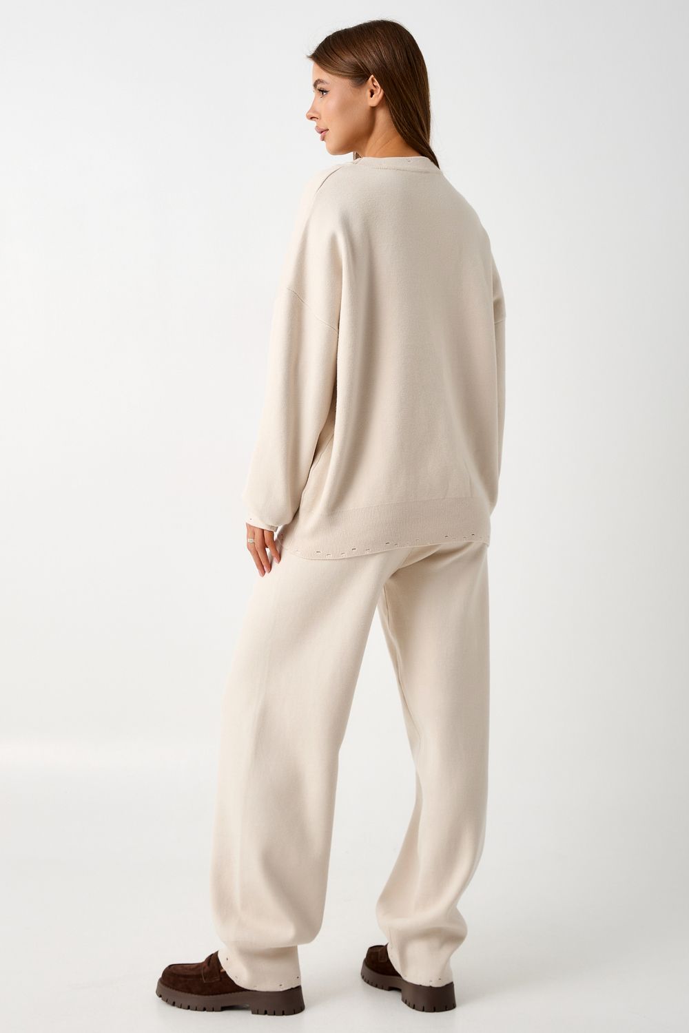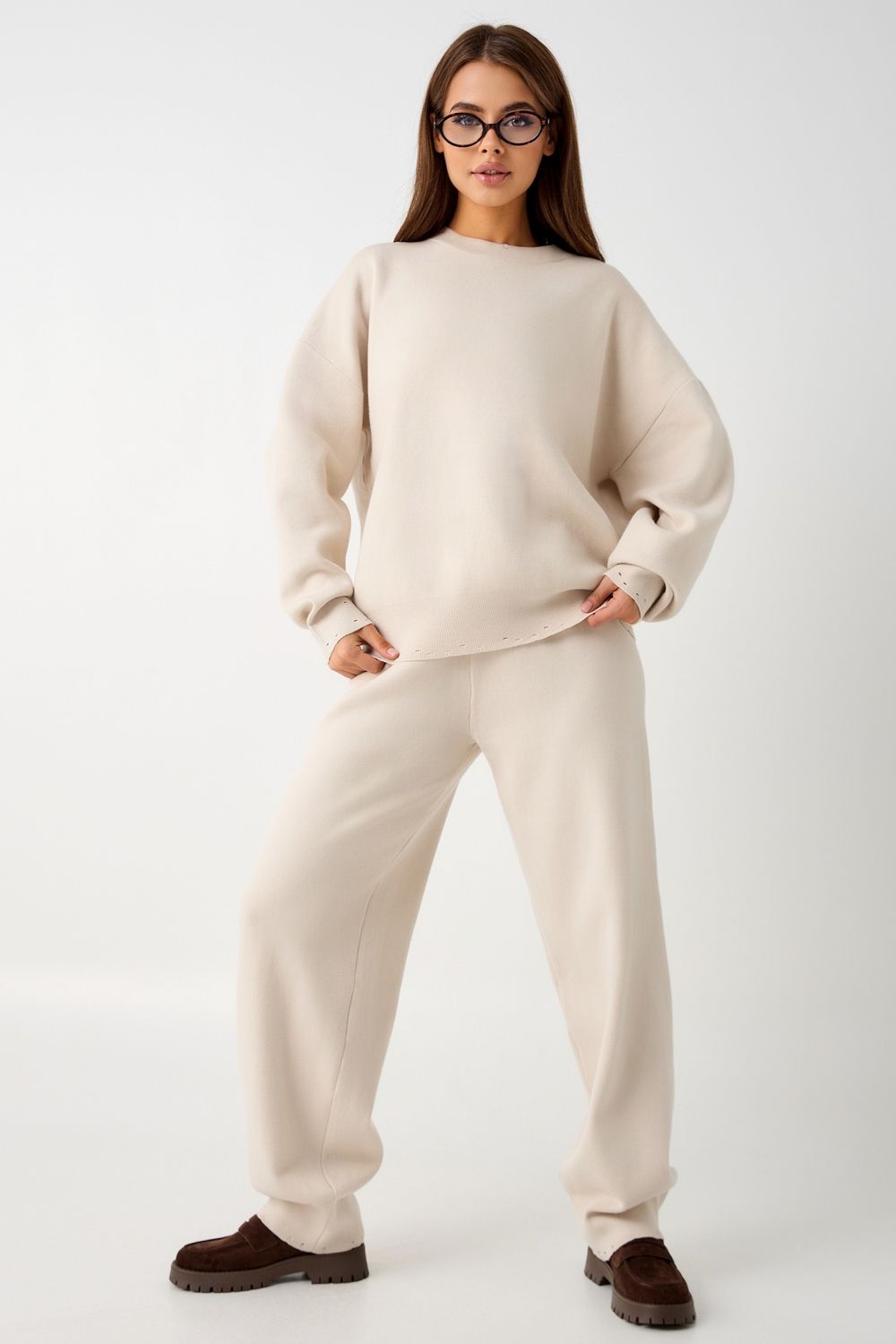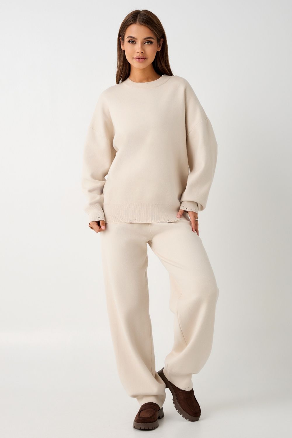 Вязаный костюм станет незаменимой основой женского гардероба для прохладной погоды, комфортным способом утепления. Он сшит из мягкой, приятной к телу пряжи с шерстяными волокнами, которая надолго сохраняет насыщенность цвета и свою форму, выдерживая интенсивное ношение и частые стирки. Стильный дизайнерский комплект отличается продуманным дизайном: кофточка - оверсайз со спущенным плечом, V-образным вырезом горловины и отложным воротником обеспечивает комфорт, а брюки - спортивки с широким поясом - резинкой, длинными штанинами с манжетами и удобными карманами подчеркивают силуэт, не сковывая движений. Универсальность классической пастельной палитры и лаконичного дизайна позволяет легко включать комплект в коллекцию вещей для осенне - весеннего демисезонного и зимнего периода. Он идеально сочетается с однотонными вариантами обуви и нарядными праздничными аксессуарами для создания элегантного и собранного образа.