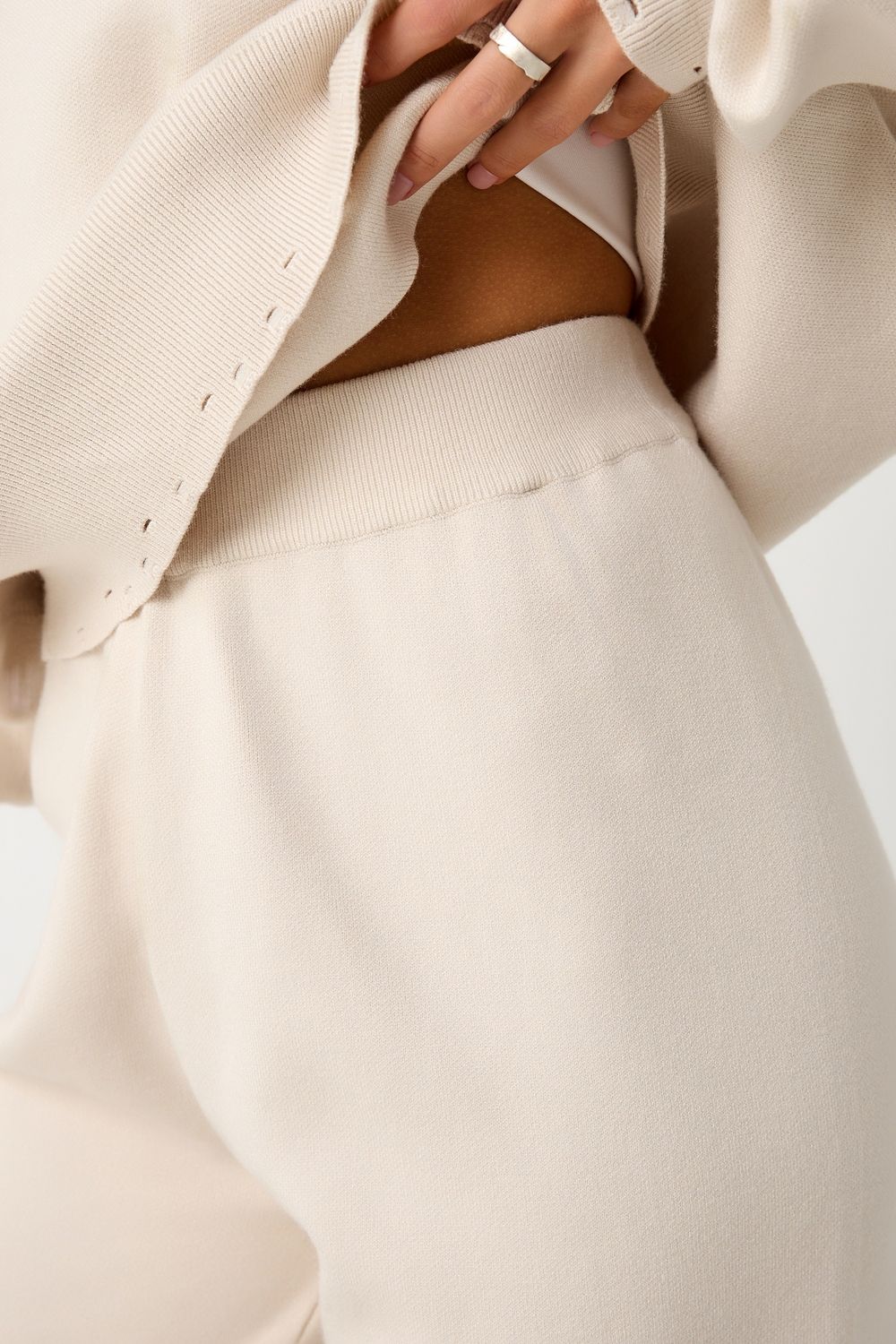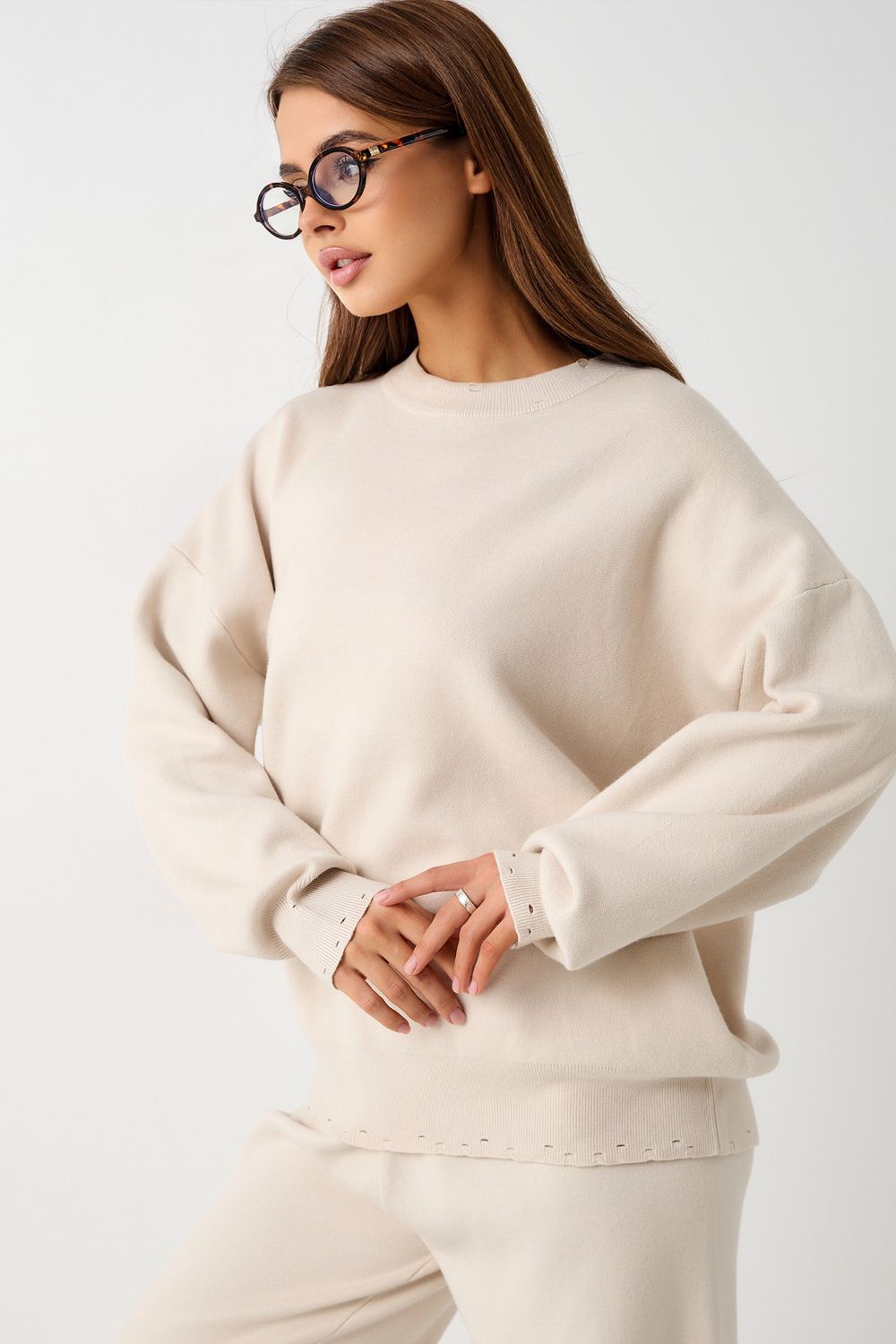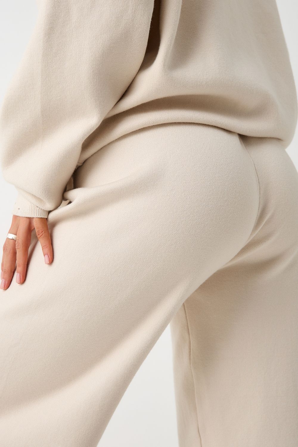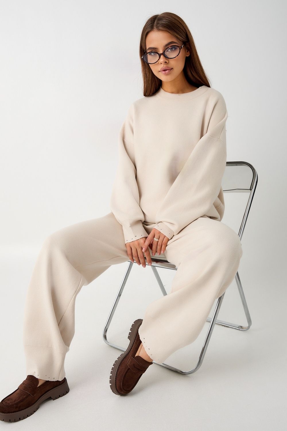Вязаный костюм станет незаменимой основой женского гардероба для прохладной погоды, комфортным способом утепления. Он сшит из мягкой, приятной к телу пряжи с шерстяными волокнами, которая надолго сохраняет насыщенность цвета и свою форму, выдерживая интенсивное ношение и частые стирки. Стильный дизайнерский комплект отличается продуманным дизайном: кофточка - оверсайз со спущенным плечом, V-образным вырезом горловины и отложным воротником обеспечивает комфорт, а брюки - спортивки с широким поясом - резинкой, длинными штанинами с манжетами и удобными карманами подчеркивают силуэт, не сковывая движений. Универсальность классической пастельной палитры и лаконичного дизайна позволяет легко включать комплект в коллекцию вещей для осенне - весеннего демисезонного и зимнего периода. Он идеально сочетается с однотонными вариантами обуви и нарядными праздничными аксессуарами для создания элегантного и собранного образа.