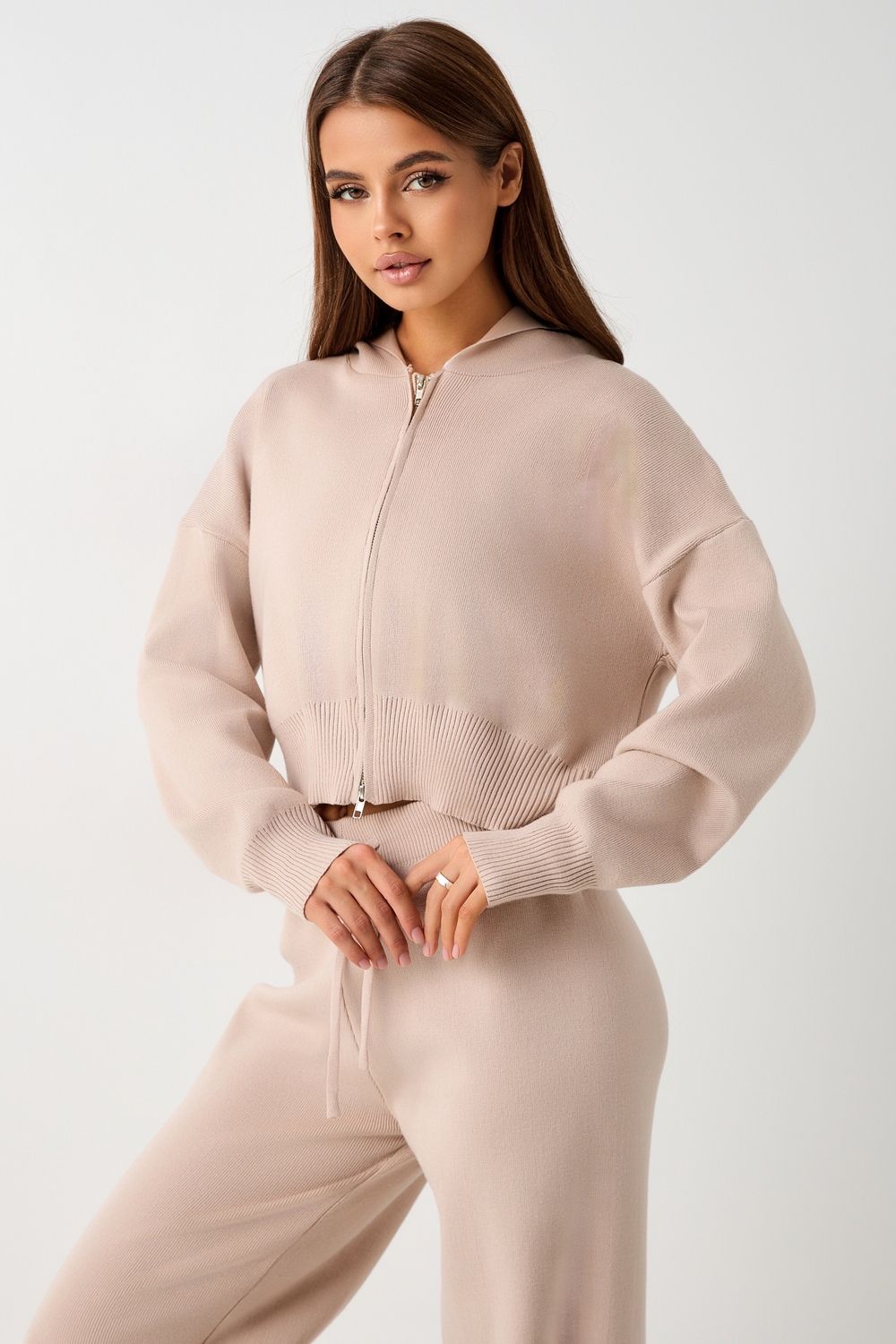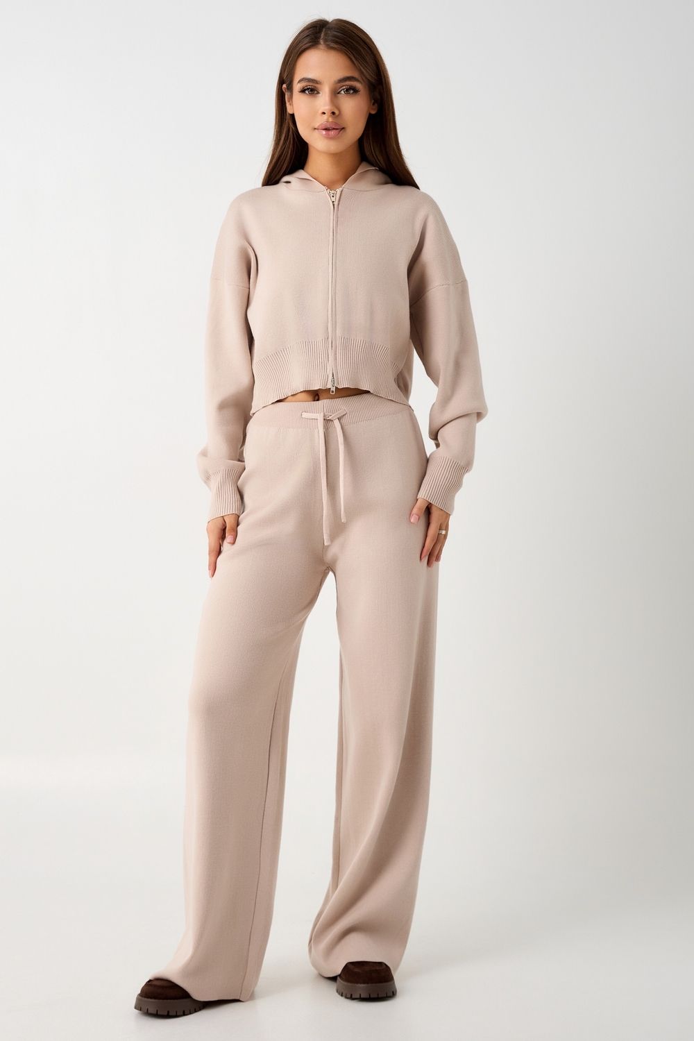 Вязаный костюм станет незаменимой основой женского гардероба для прохладной погоды, комфортным способом утепления. Он сшит из мягкой, приятной к телу пряжи с шерстяными волокнами, которая надолго сохраняет насыщенность цвета и свою форму, выдерживая интенсивное ношение и частые стирки. Стильный дизайнерский комплект отличается продуманным дизайном: кофточка - оверсайз со спущенным плечом, V-образным вырезом горловины и отложным воротником обеспечивает комфорт, а брюки - спортивки с широким поясом - резинкой, длинными штанинами с манжетами и удобными карманами подчеркивают силуэт, не сковывая движений. Универсальность классической пастельной палитры и лаконичного дизайна позволяет легко включать комплект в коллекцию вещей для осенне - весеннего демисезонного и зимнего периода. Он идеально сочетается с однотонными вариантами обуви и нарядными праздничными аксессуарами для создания элегантного и собранного образа.