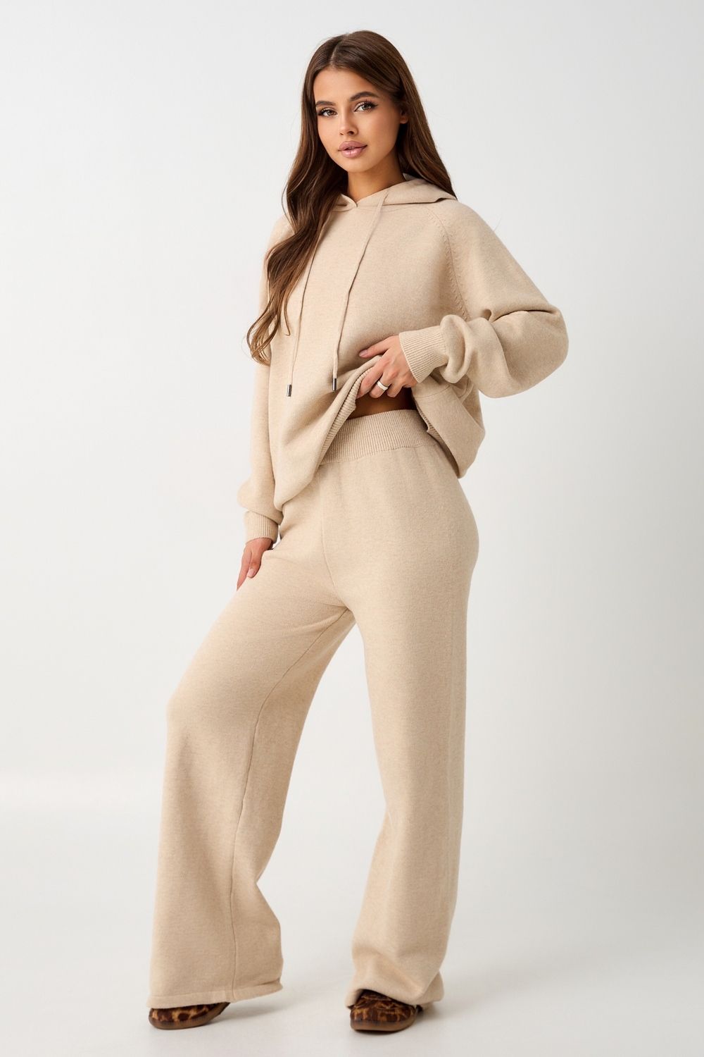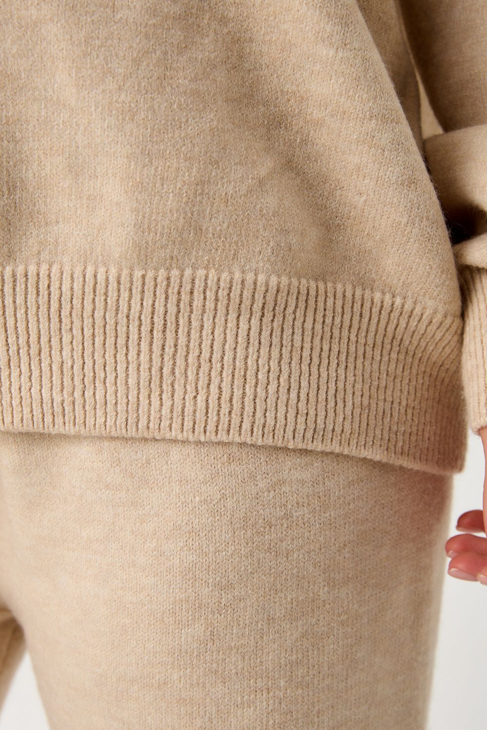 Вязаный костюм станет незаменимой основой женского гардероба для прохладной погоды, комфортным способом утепления. Он сшит из мягкой, приятной к телу пряжи с шерстяными волокнами, которая надолго сохраняет насыщенность цвета и свою форму, выдерживая интенсивное ношение и частые стирки. Стильный дизайнерский комплект отличается продуманным дизайном. Брюки - спортивки с широким поясом - резинкой, длинными штанинами, подчеркивают силуэт, не сковывая движений. Универсальность классической пастельной палитры и лаконичного дизайна позволяет легко включать комплект в коллекцию вещей для осенне - весеннего демисезонного и зимнего периода. Он идеально сочетается с однотонными вариантами обуви и нарядными праздничными аксессуарами для создания элегантного и собранного образа.