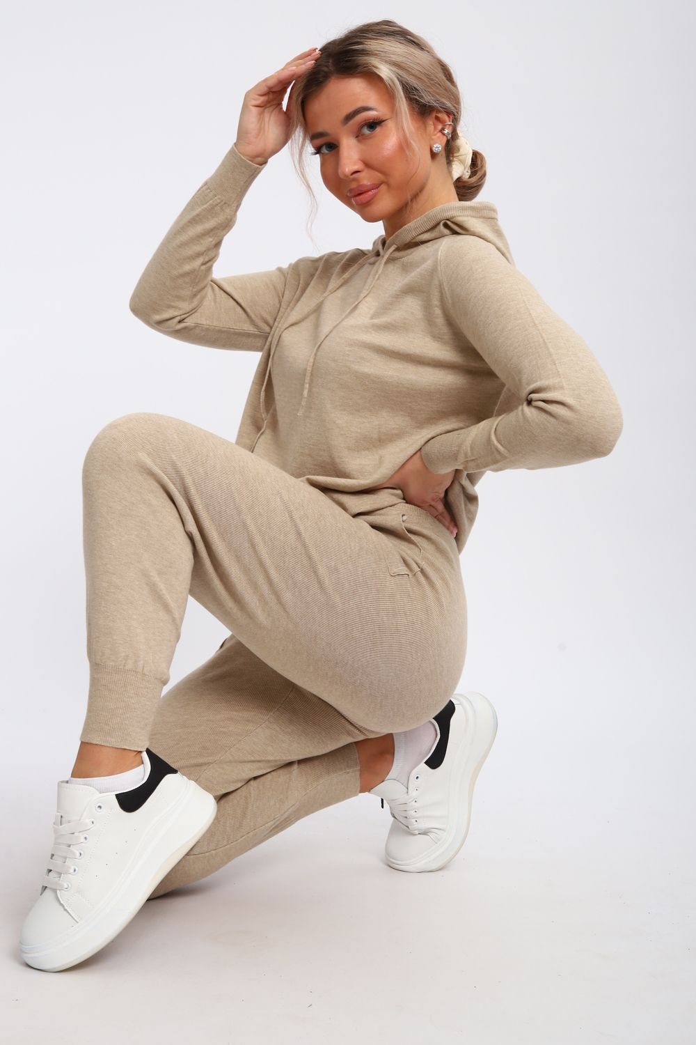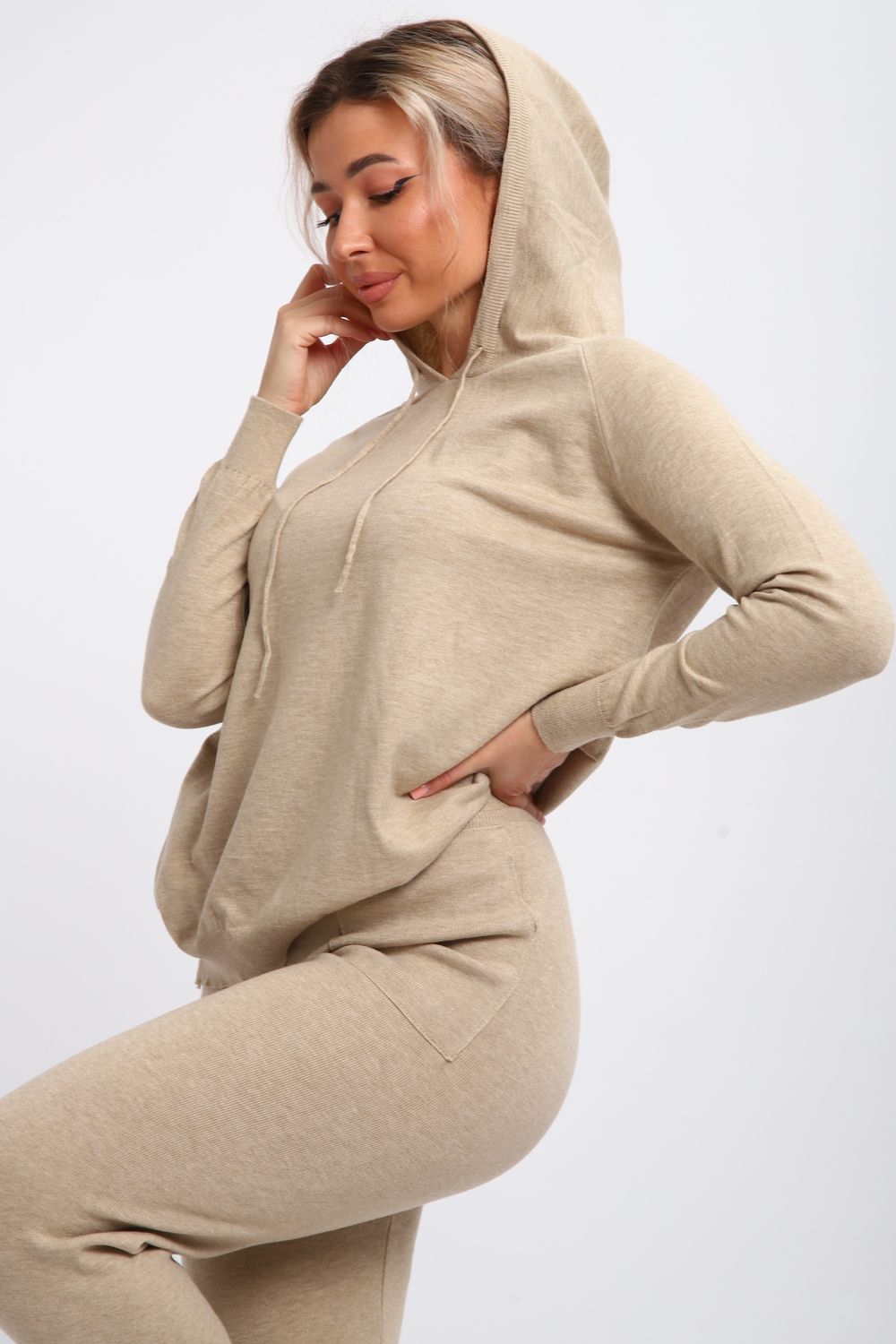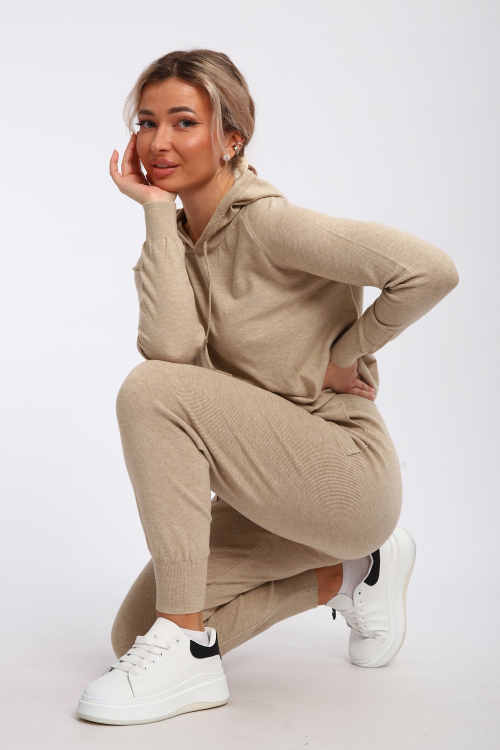 Вязаный костюм станет незаменимой основой женского гардероба для прохладной погоды, комфортным способом утепления. Он сшит из мягкой, приятной к телу пряжи. Стильный дизайнерский комплект отличается продуманным дизайном: кофточка с капюшоном обеспечивает комфорт, а брюки - спортивки с широким поясом - резинкой, длинными штанинами с манжетами и удобными карманами подчеркивают силуэт, не сковывая движений. Универсальность классической пастельной палитры и лаконичного дизайна позволяет легко включать комплект в коллекцию вещей для осенне - весеннего демисезонного и зимнего периода. Он идеально сочетается с однотонными вариантами обуви и нарядными праздничными аксессуарами для создания элегантного и собранного образа.
