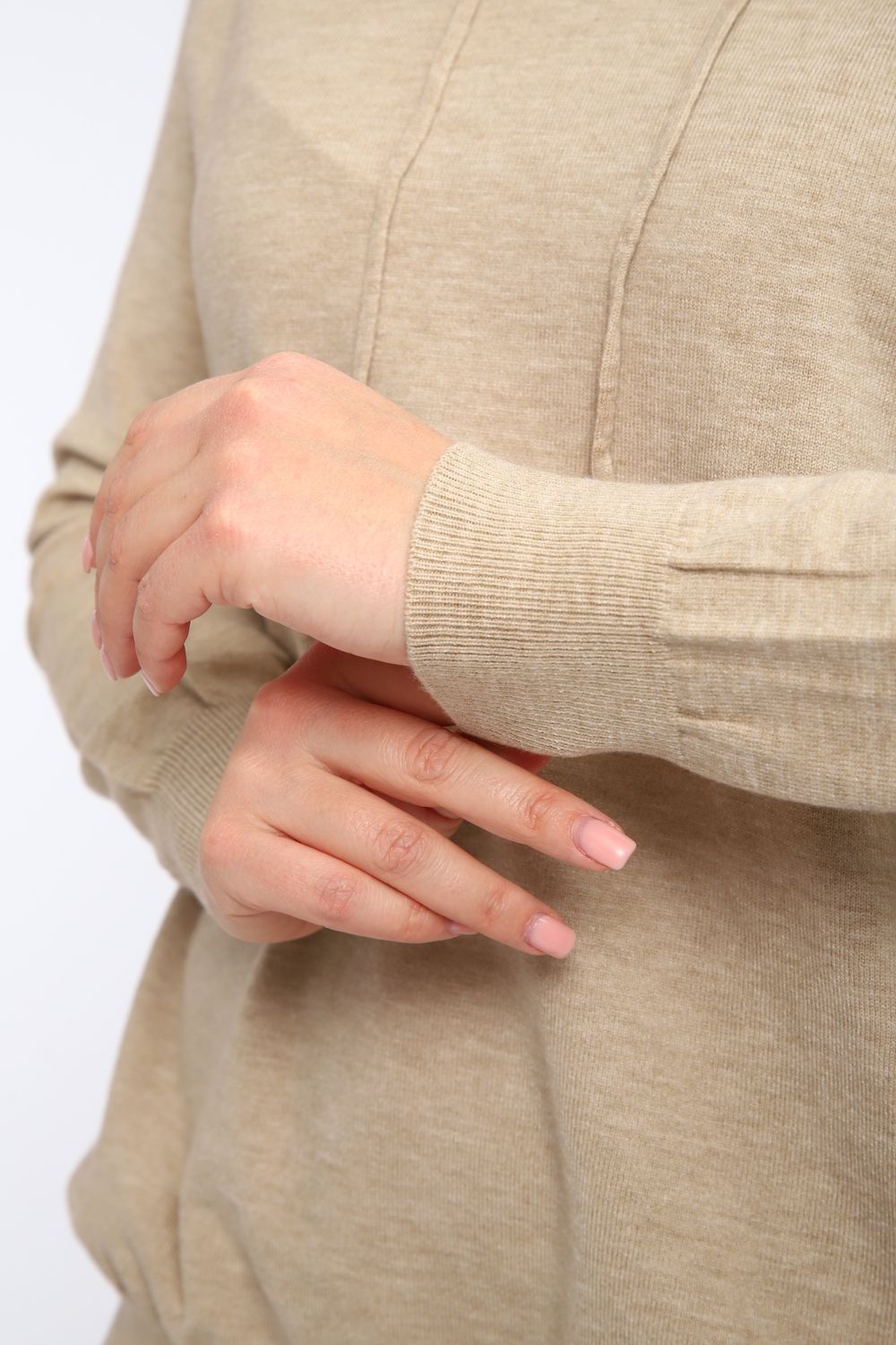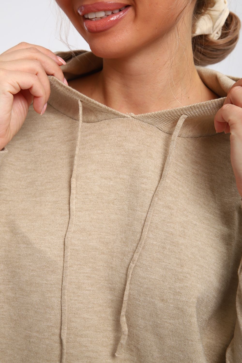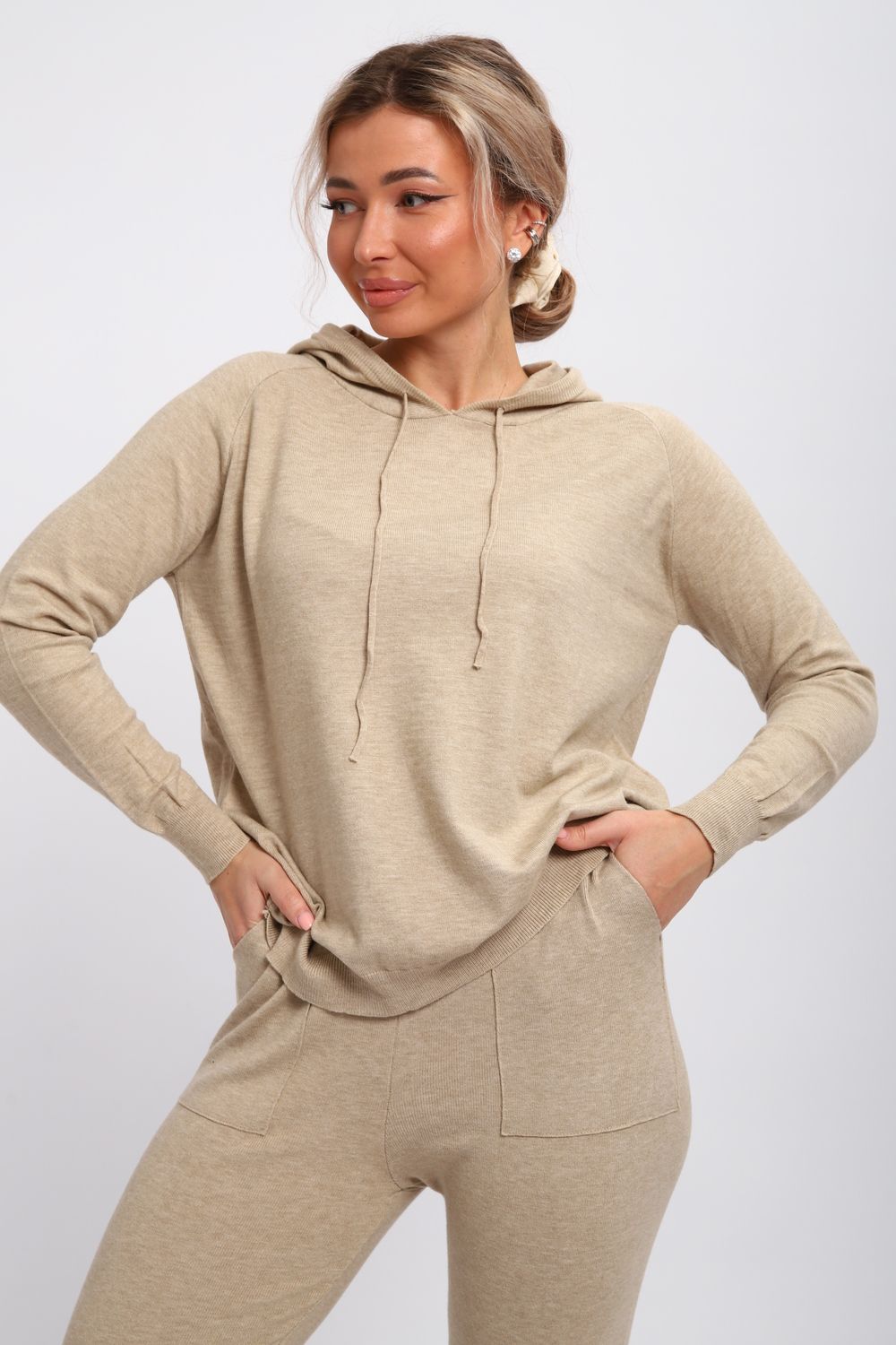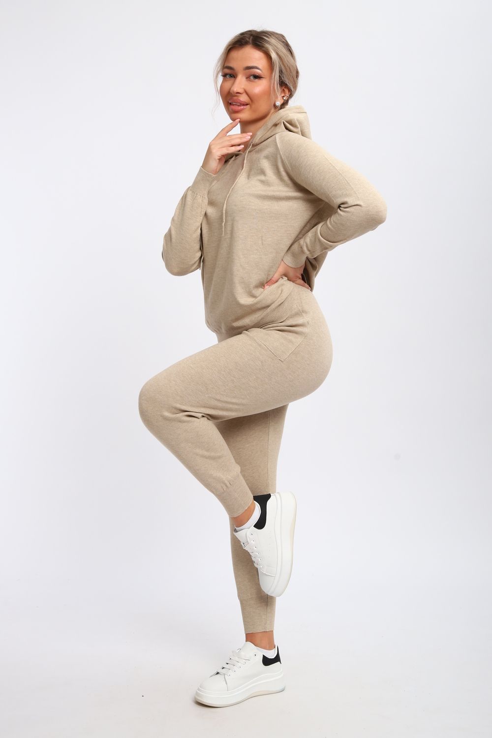 Вязаный костюм станет незаменимой основой женского гардероба для прохладной погоды, комфортным способом утепления. Он сшит из мягкой, приятной к телу пряжи. Стильный дизайнерский комплект отличается продуманным дизайном: кофточка с капюшоном обеспечивает комфорт, а брюки - спортивки с широким поясом - резинкой, длинными штанинами с манжетами и удобными карманами подчеркивают силуэт, не сковывая движений. Универсальность классической пастельной палитры и лаконичного дизайна позволяет легко включать комплект в коллекцию вещей для осенне - весеннего демисезонного и зимнего периода. Он идеально сочетается с однотонными вариантами обуви и нарядными праздничными аксессуарами для создания элегантного и собранного образа.