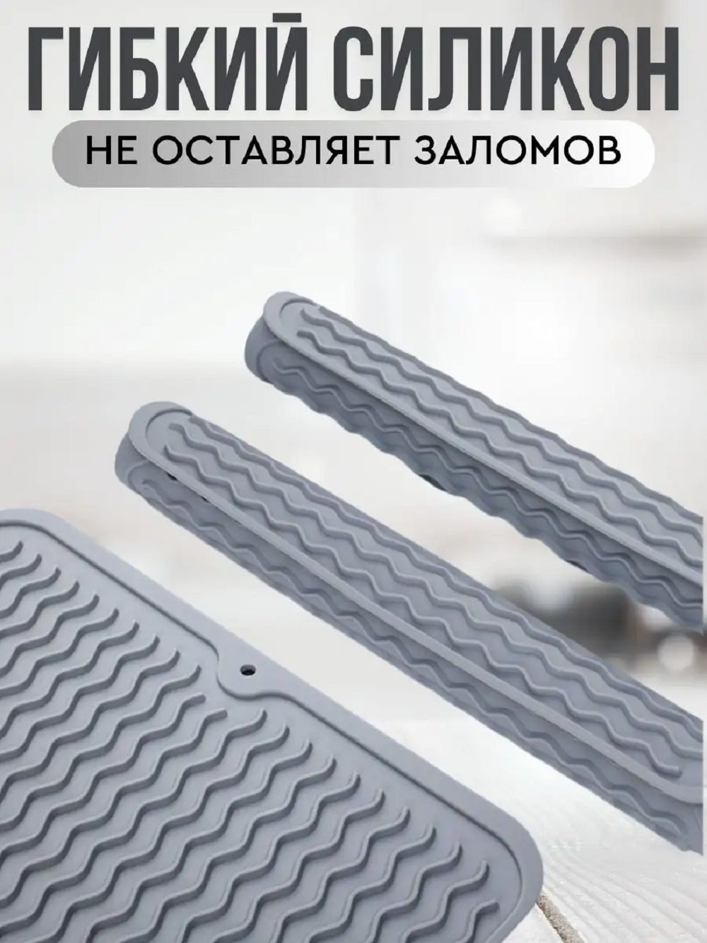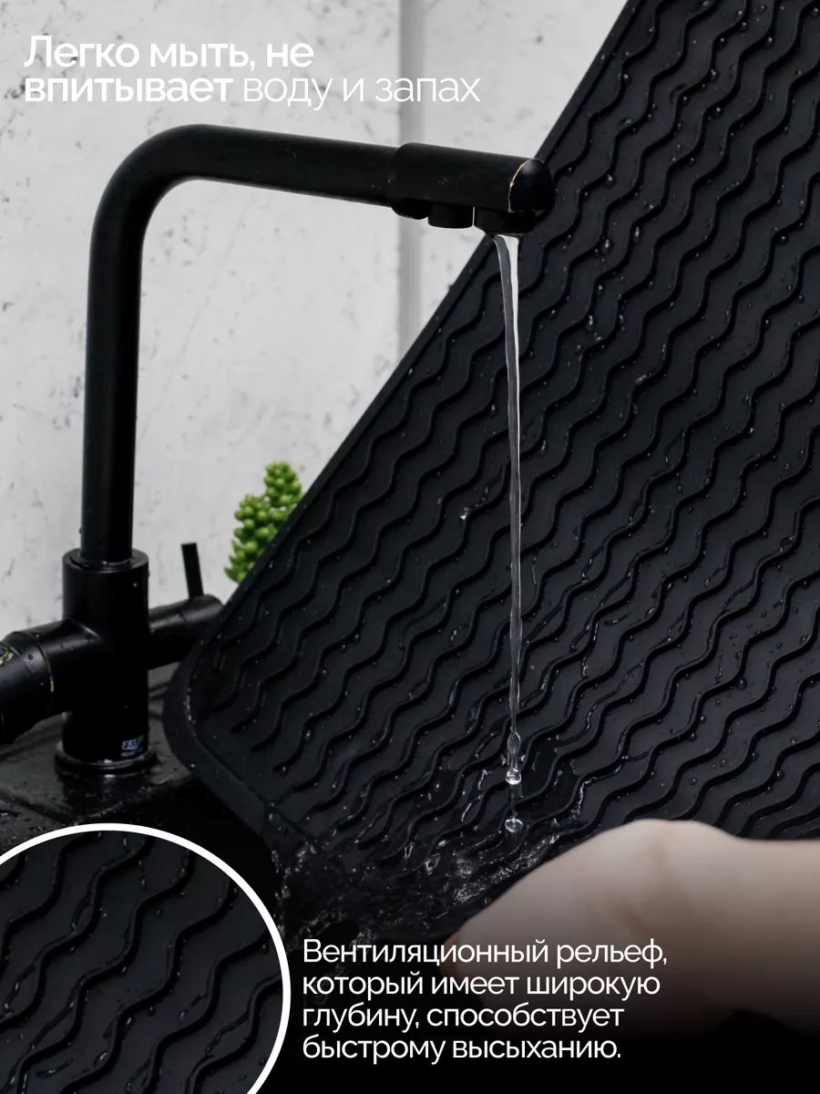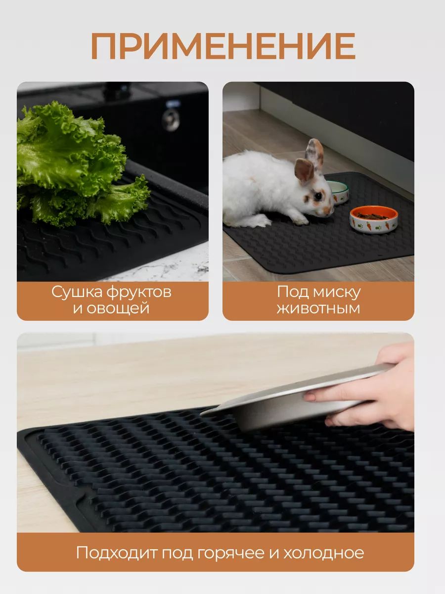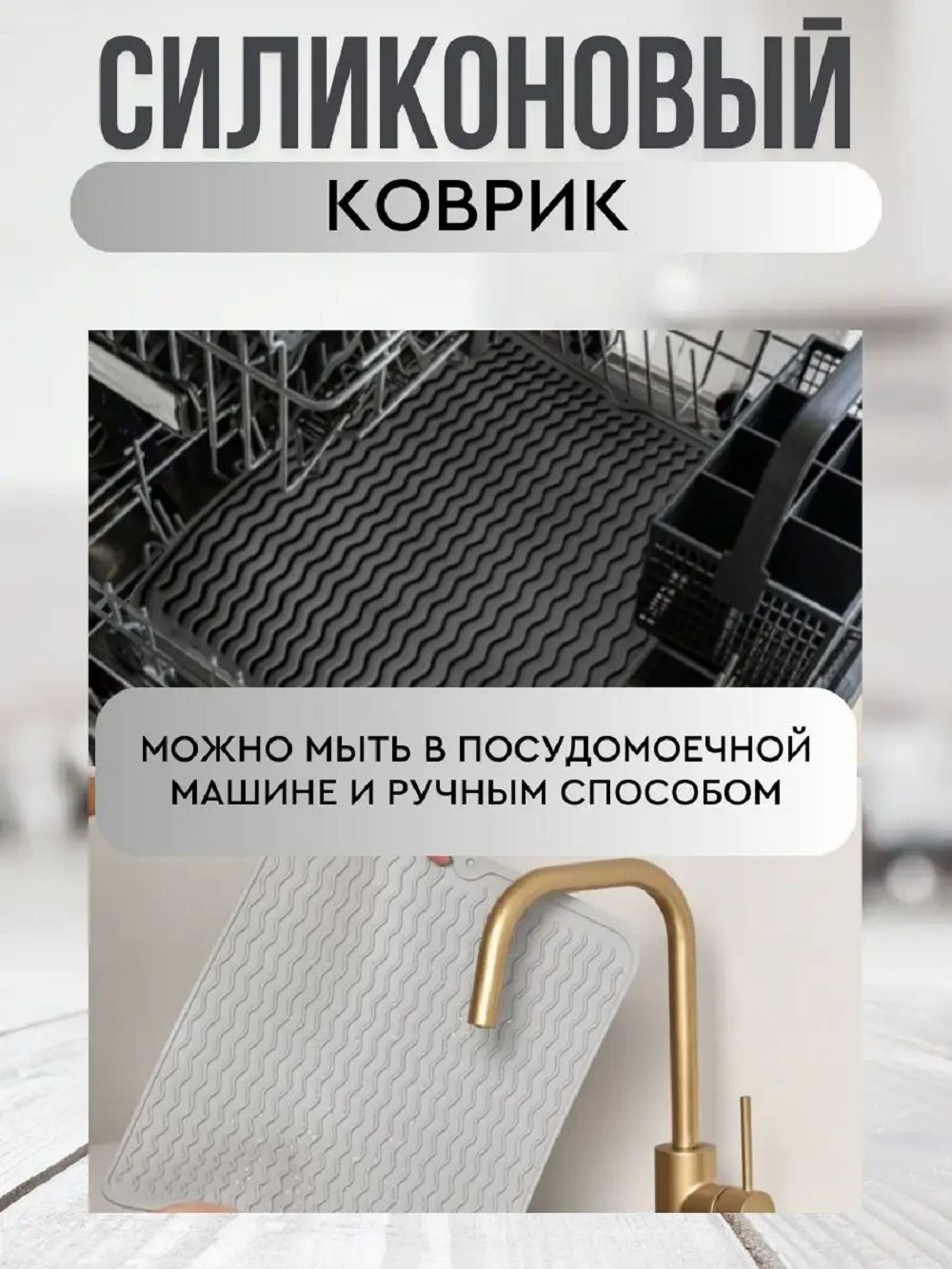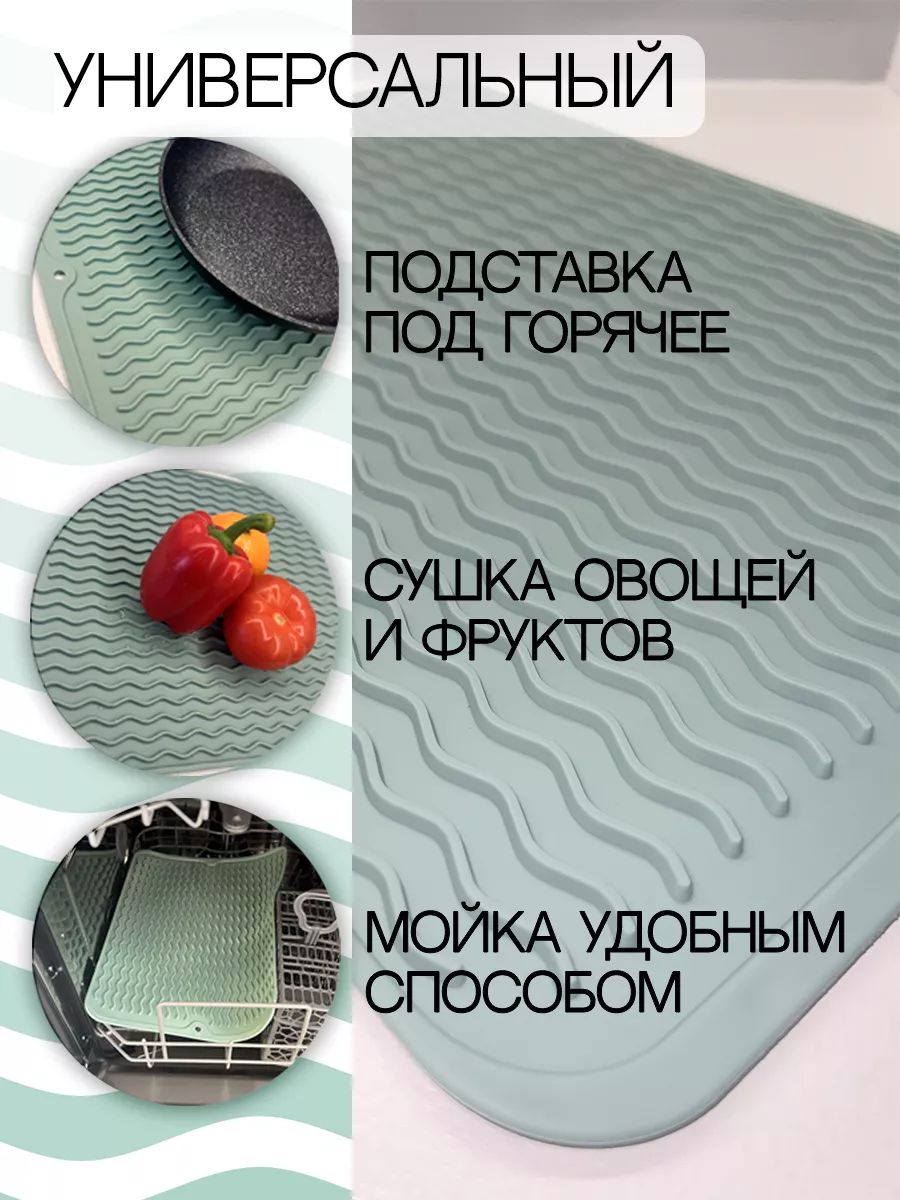 Коврик для сушки посуды и столовых приборов - идеальный вариант для вашей кухни, так как он многофункционален и отлично подойдет любой хозяйке. Он сделан из 100% пищевого силикона, в составе которого нет BPA (бисфенола А), поэтому не имеет неприятного запаха и совершенно безопасен для здоровья. Универсальные размеры коврика для посуды 30 х 40 см прекрасно подходят для кухонных ящиков, столешниц, раковин любого размера. Изделие можно мыть в посудомоечной машине. Для хранения коврика не потребуется много места, достаточно повесить его на крючок, или свернуть в рулон и убрать в любое удобное место. Материал имеет повышенную термостойкость и отлично подходит для использования в духовке при температуре до 230 градусов, а размеры коврика позволяют готовить с его помощью различную выпечку для всей семьи. Достав пирог из духовки, можно оставить остывать его прямо на столе. Теперь гораздо удобнее сушить овощи, фрукты, зелень и ягоды после мытья, и размораживать продукты: оставьте мясо, ягоды или овощи на коврике с бортиками, и через несколько часов просто слейте лишнюю воду.