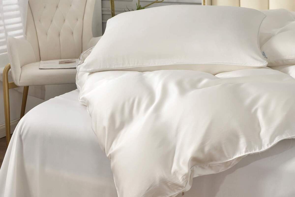Для нашего фирменного постельного белья Elizabeth мы используем 100% тенсель (эвкалиптовое волокно) пряжи 60s, сатиновое плетение плотностью 300ТС. Комплект выполнен в однотонном дизайне с изящным белым кантом по краю пододеяльника и наволочек.