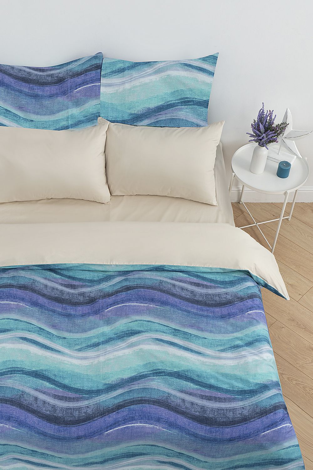 Постельное белье выполнено из сатина высокой плотности (пряжа 40х40) с пигментным окрашиванием. Ткань шелковистая, очень приятная на ощупь. Пододеяльник и наволочки сшиты из основной ткани, простынь и обратная сторона пододеяльника выполнены из ткани-компаньона.