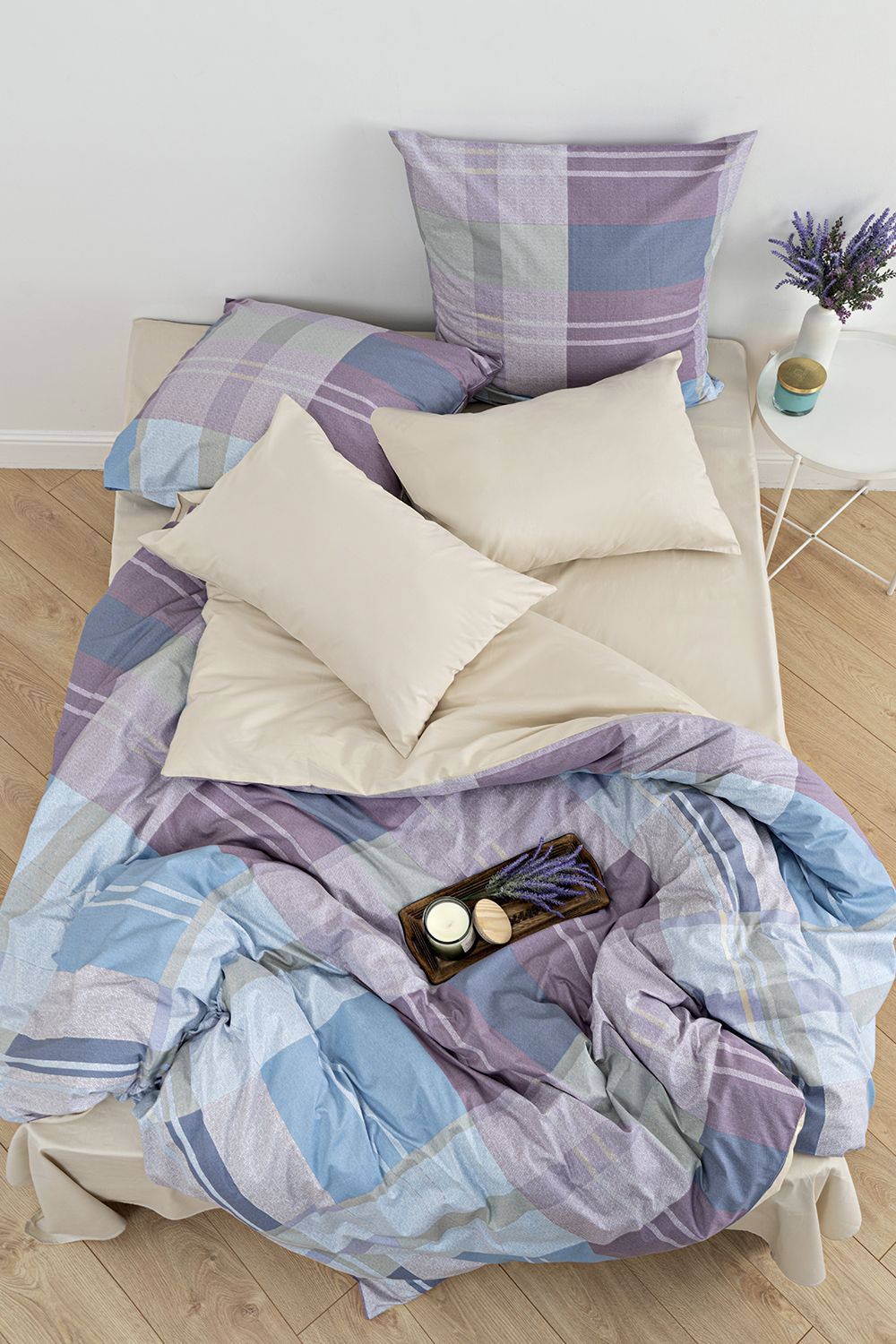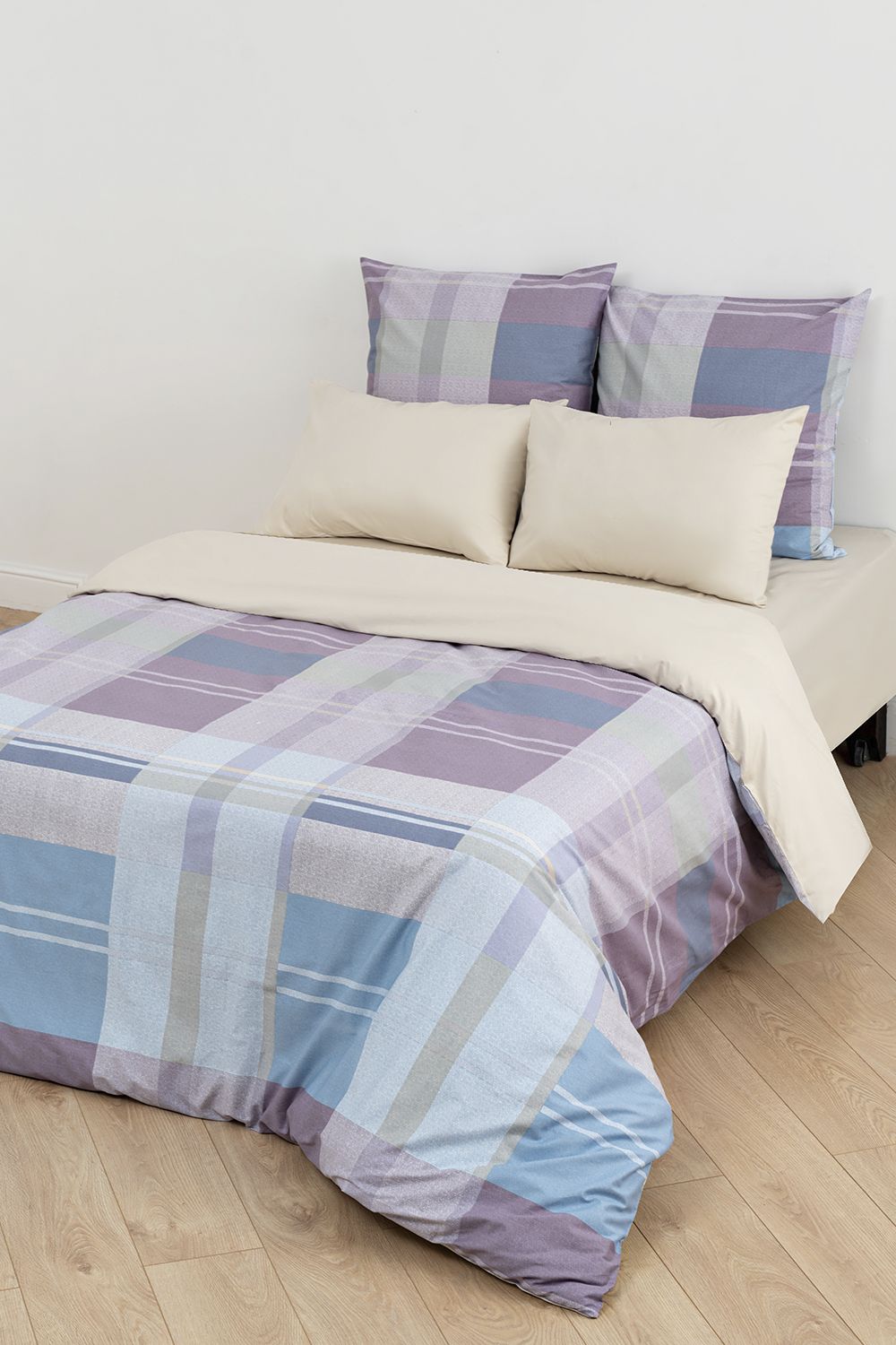 Постельное белье выполнено из сатина высокой плотности (пряжа 40х40) с пигментным окрашиванием. Ткань шелковистая, очень приятная на ощупь. Пододеяльник и наволочки сшиты из основной ткани, простынь и обратная сторона пододеяльника выполнены из ткани-компаньона.