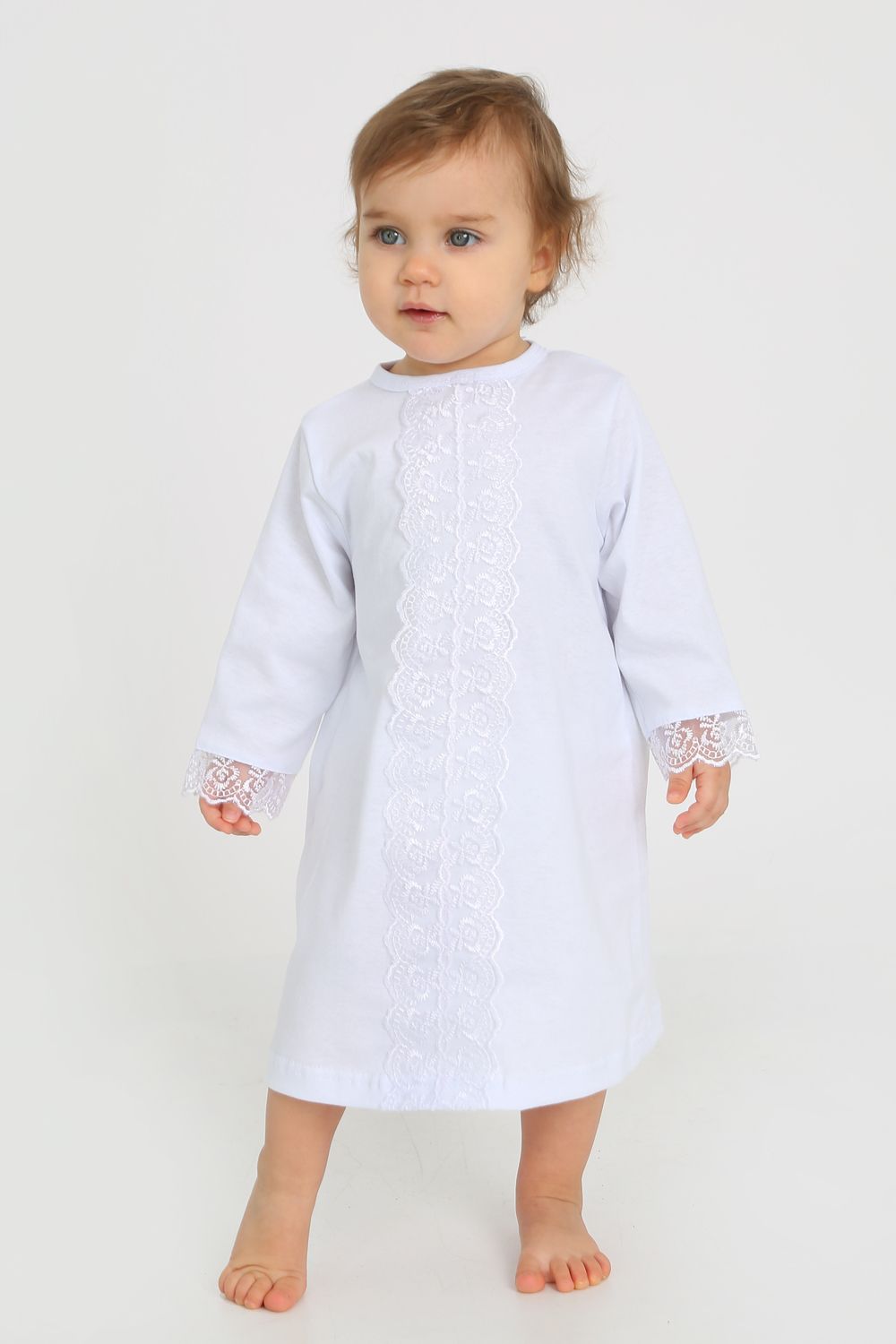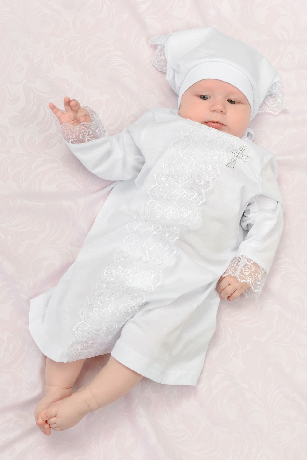 Крестильный набор для девочки Белоснежное платье, украшено белым красивым кружевом и серебряным крестиком и косынка с кружевом на трикотажной манжете. Отличный вариант для первого торжества - таинства крещения. Выполнен из мягкой и приятной на ощупь трикотажной ткани, которая подарит максимальный комфорт в ваш светлый праздник. Длина платья от плеча до низа Рост 62-43см,68-45см,74-47см, 80-50см, 86-53см,92-56 см
