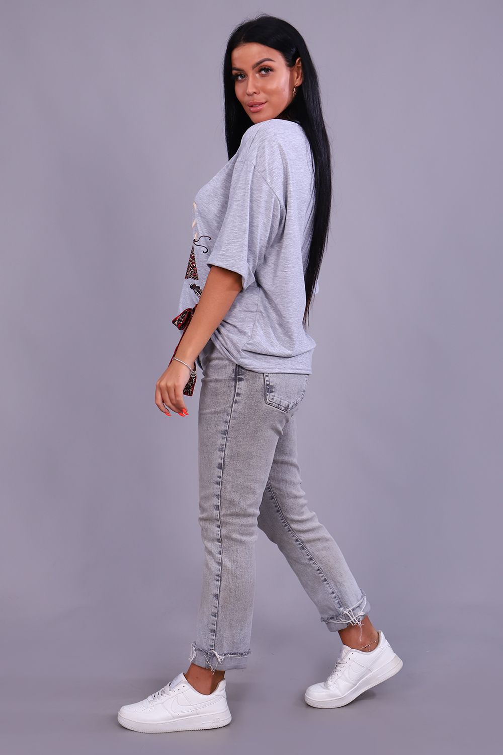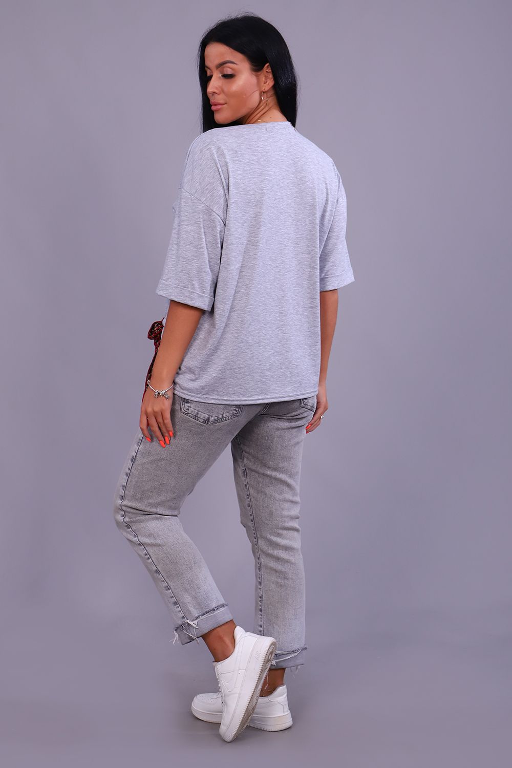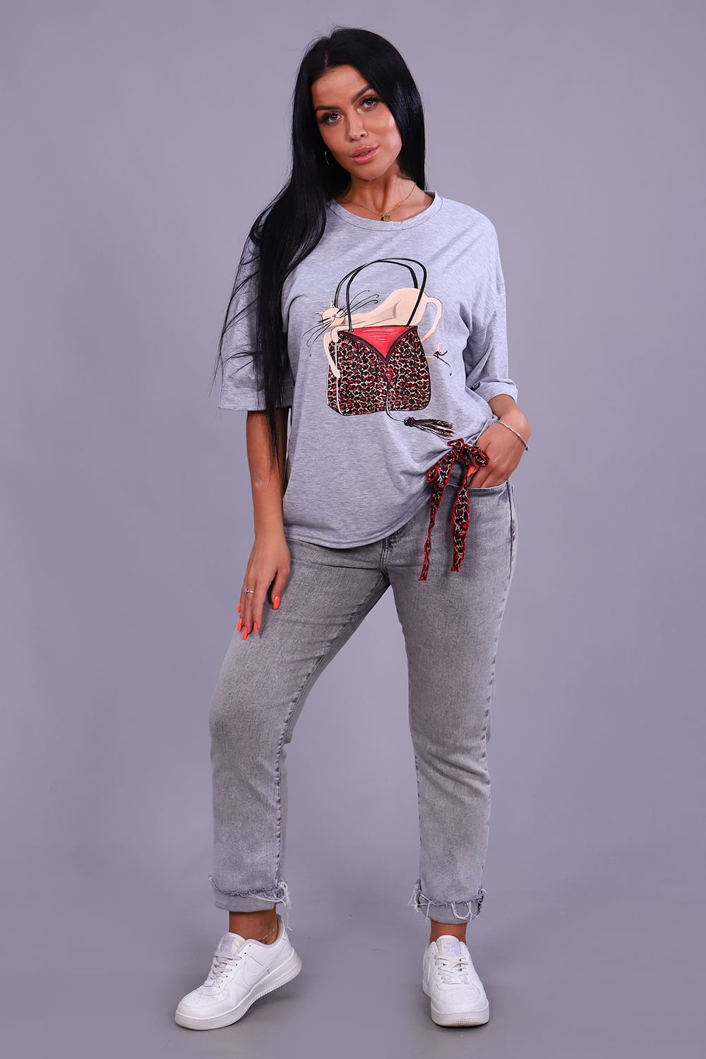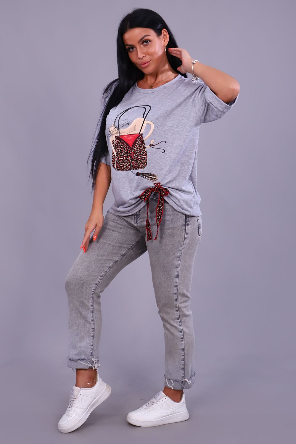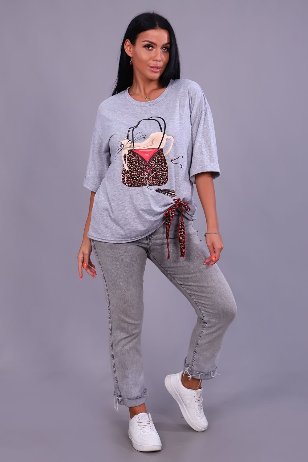Стильная футболка с принтом из кулирки с лайкрой высокого качества пенье. Модель в стиле ОВЕРСАЙЗ, горловина округлая, короткий рукав, по низу передней полочки декоративный подхват в виде банта, гармонично сочетающийся с принтом, что придаёт изделию некую изюминку. Футболка - это универсальная необходимая вещь, присутствующая в гардеробе модницы независимо от фигуры и возраста
