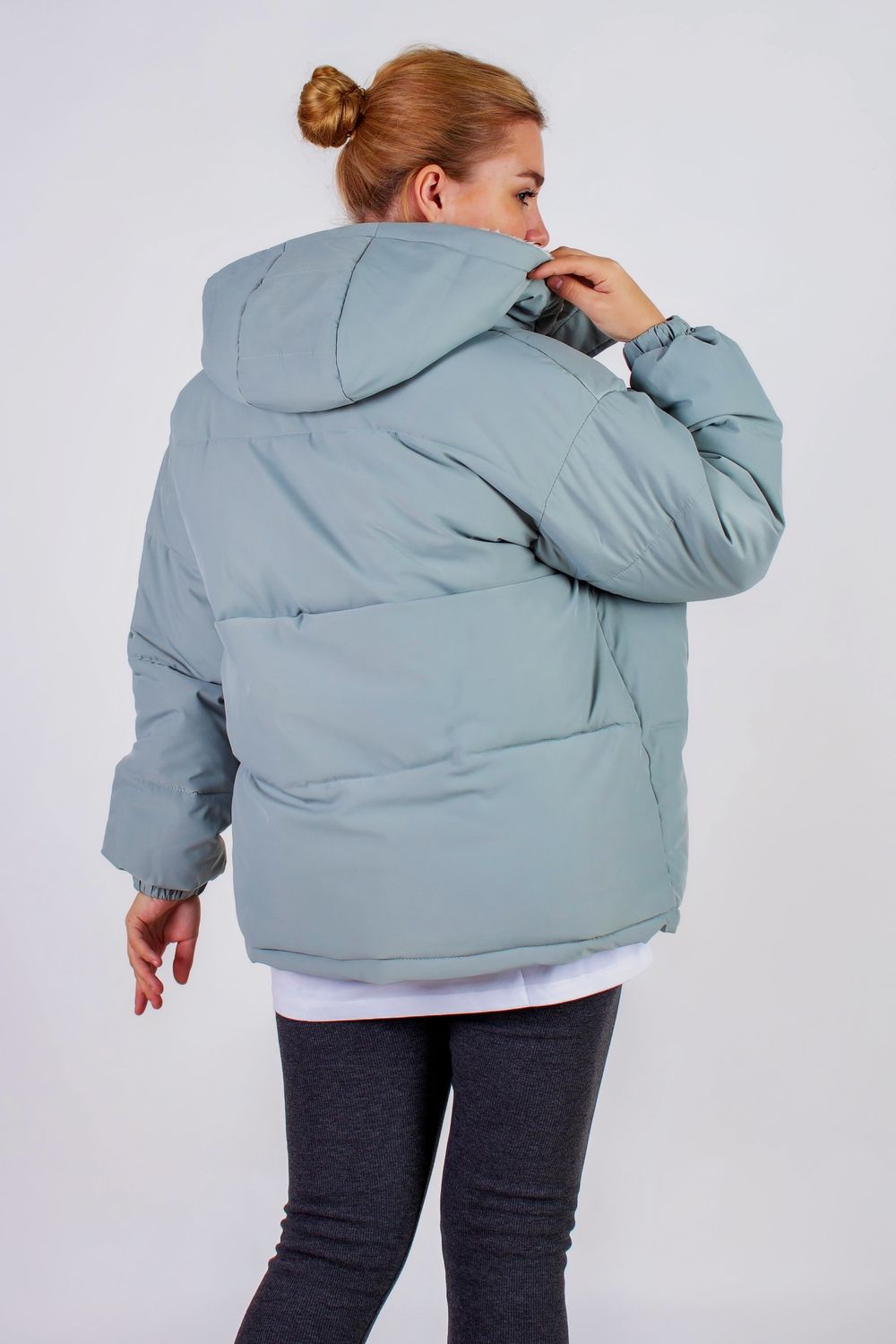 Рост модели на фото: 175 см, размер: 46-48. На ней представлена куртка бежевый цвет в 48-50 размере, в цветах серый и черный 50-52 размер.