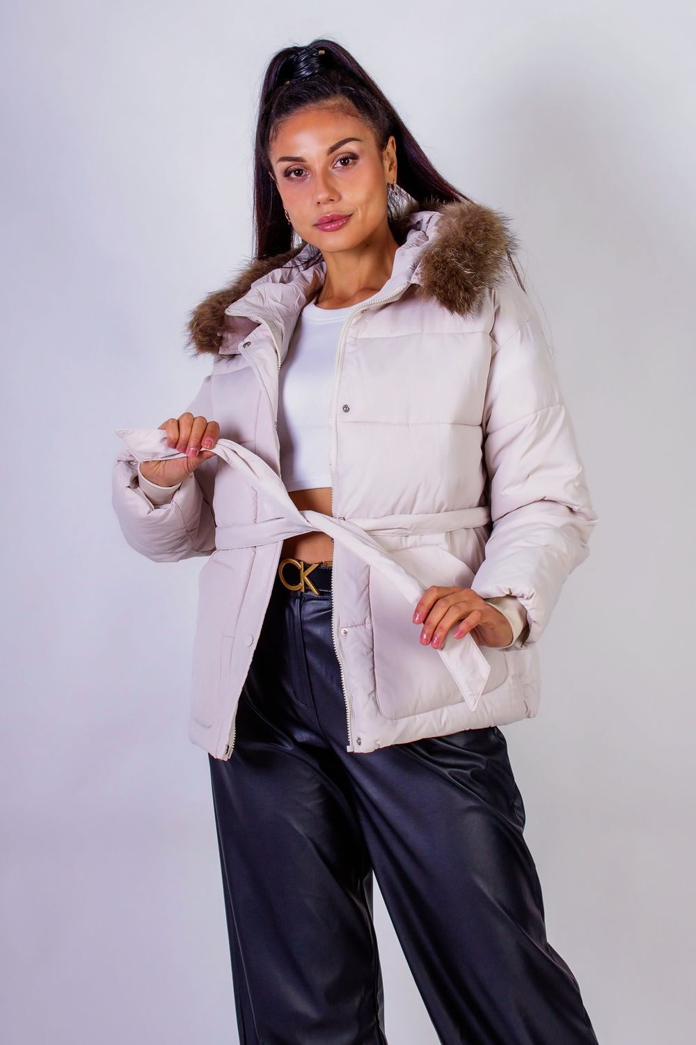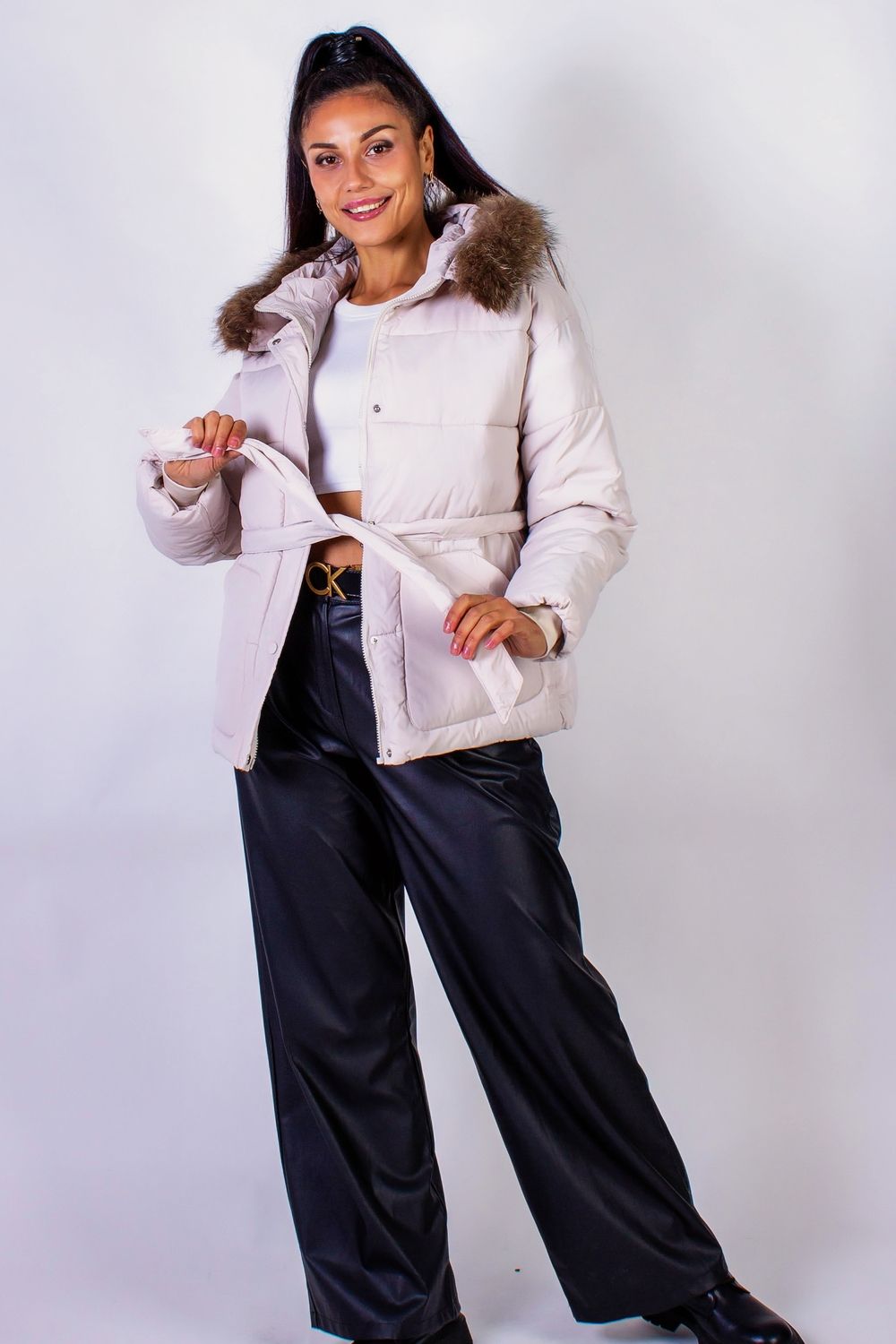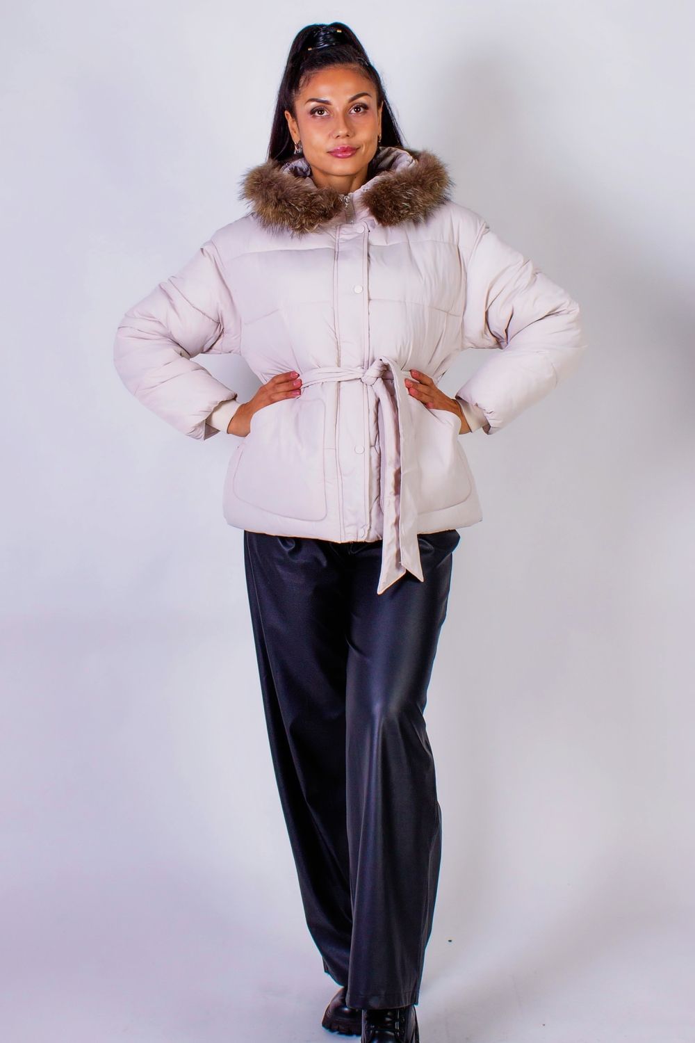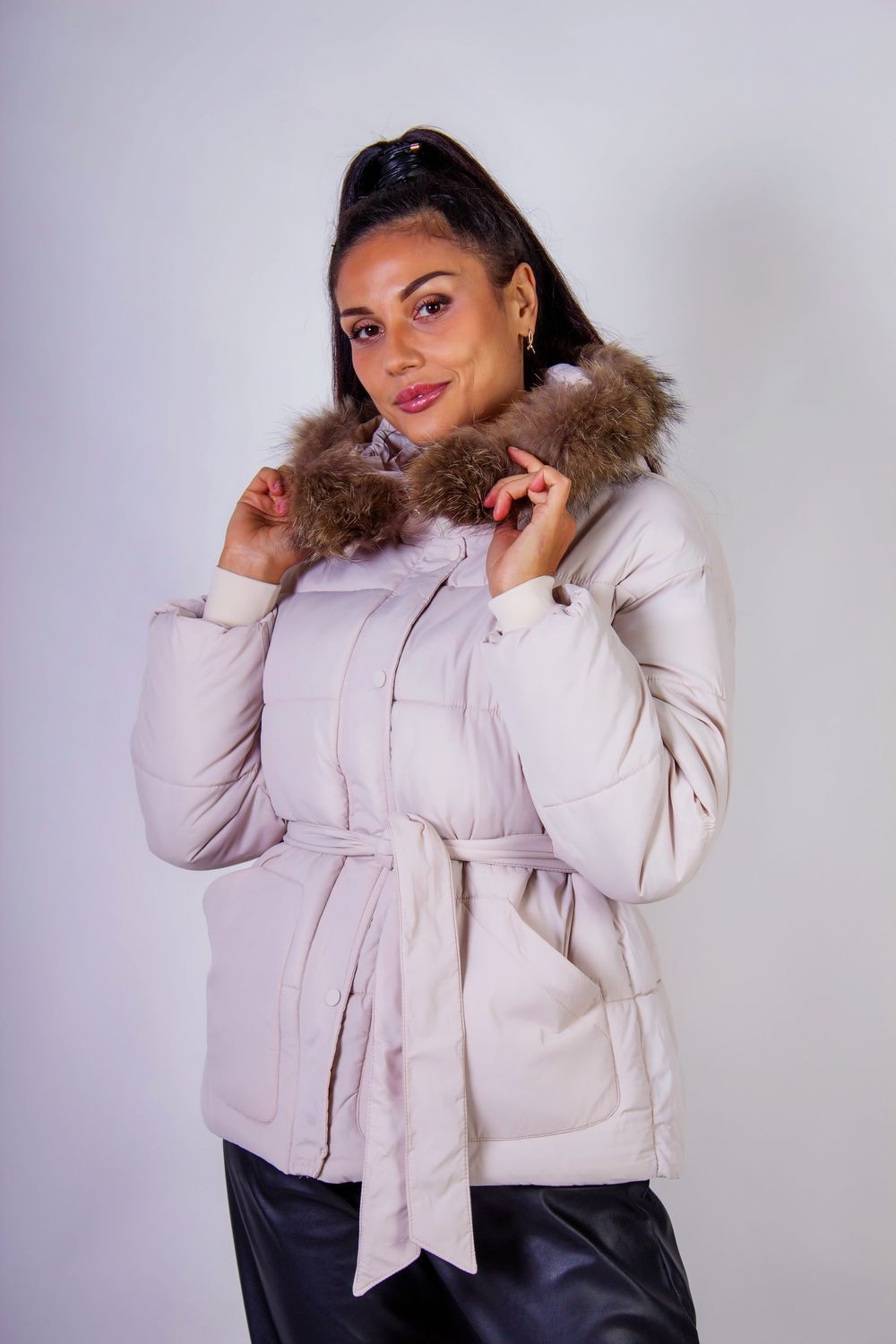 Куртка на поясе с капюшоном подойдет для демисезонного ношения или для теплой зимы. Она станет незаменимым элементом вашего гардероба в прохладное время года. Эта стильная куртка сочетает в себе элегантность и функциональность, идеально подходя как для городских прогулок, так и для школы, работы или отдыха. Куртка защищает от ветра и дождя, обеспечивая вам комфорт и теплоту в холодные дни. Внимание уделено и деталям: опушка из натурального меха может быть легко отстегнута, что позволяет вам адаптировать куртку под любые погодные условия и ваш стиль. Застежка на молнии с дополнительной планкой на кнопках обеспечивает дополнительную защиту от холода и ветра. Рукава с трикотажными манжетами предотвращают потерю тепла, а два аккуратных кармана позволят удобно хранить мелочи. Пояс, который можно регулировать по настроению и фигуре, создает актуальный силуэт песочных часов, подчеркивая ваши достоинства и добавляя уверенности в каждом шаге. Эта куртка станет отличным выбором для женщин, которые ценят комфорт и стиль. Она легко сочетается с различными элементами гардероба: будь то джинсы, юбки или платья. Вы можете легко создать как повседневный, так и более строгий образ, добавив подходящие аксессуары.
