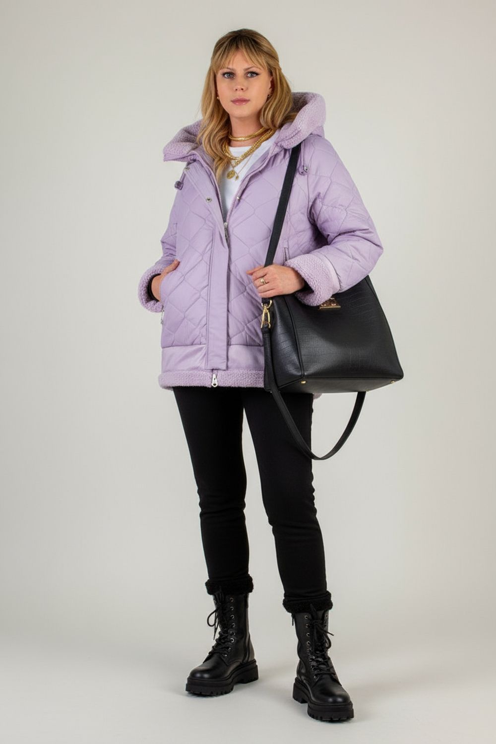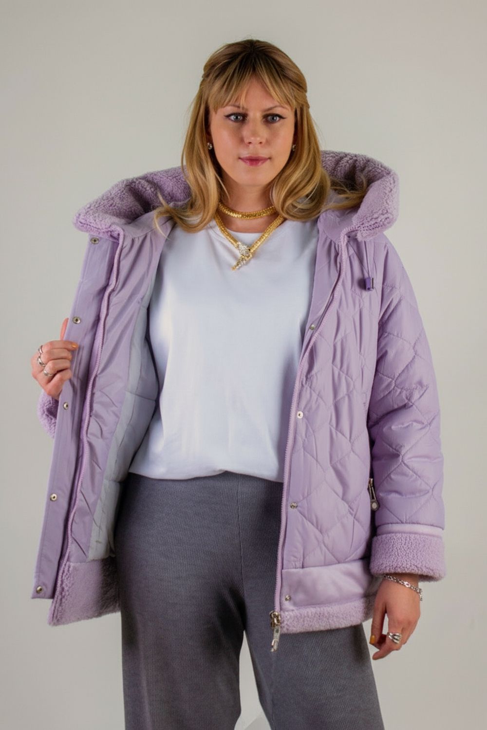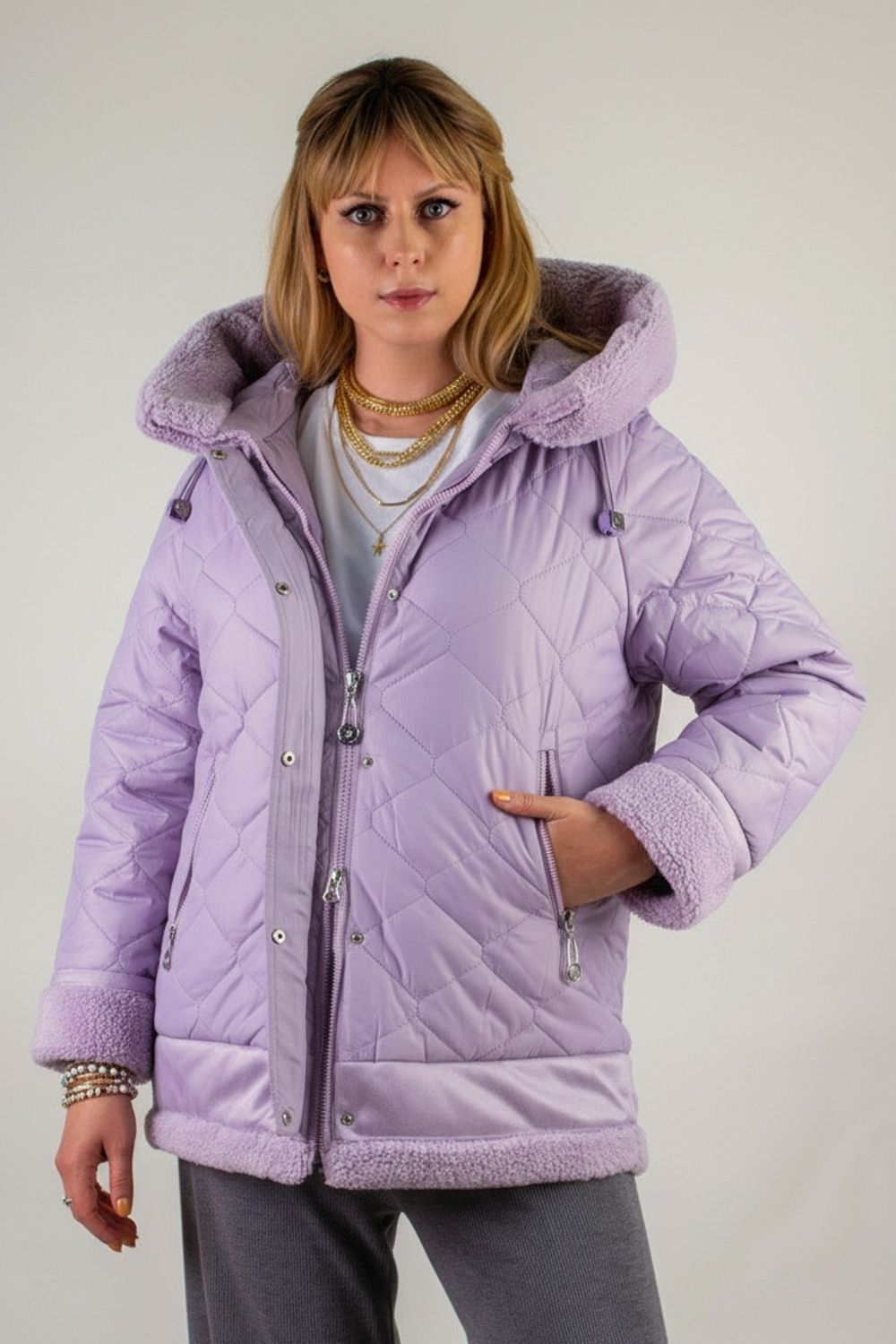 Эта куртка-дублёнка сочетает в себе комфорт натурального утеплителя, безупречный крой и трендовый лилово-сиреневый цвет. Идеальна для городских прогулок, загородных выездов и любой активной зимней жизни!