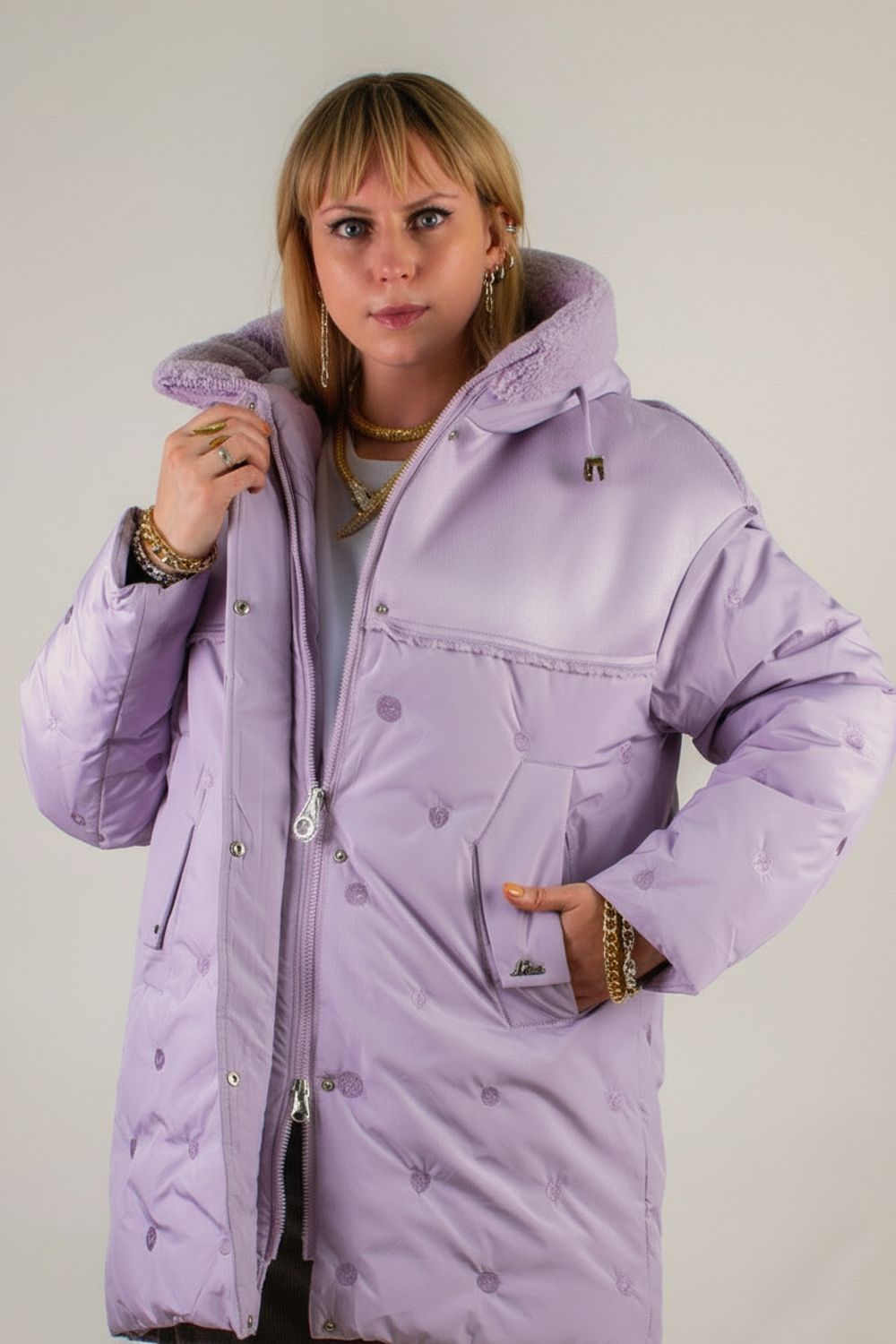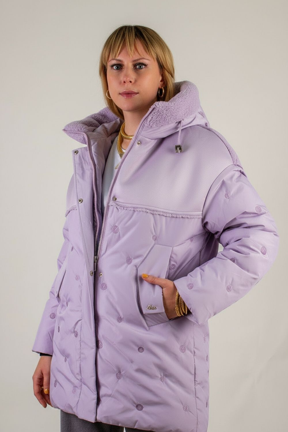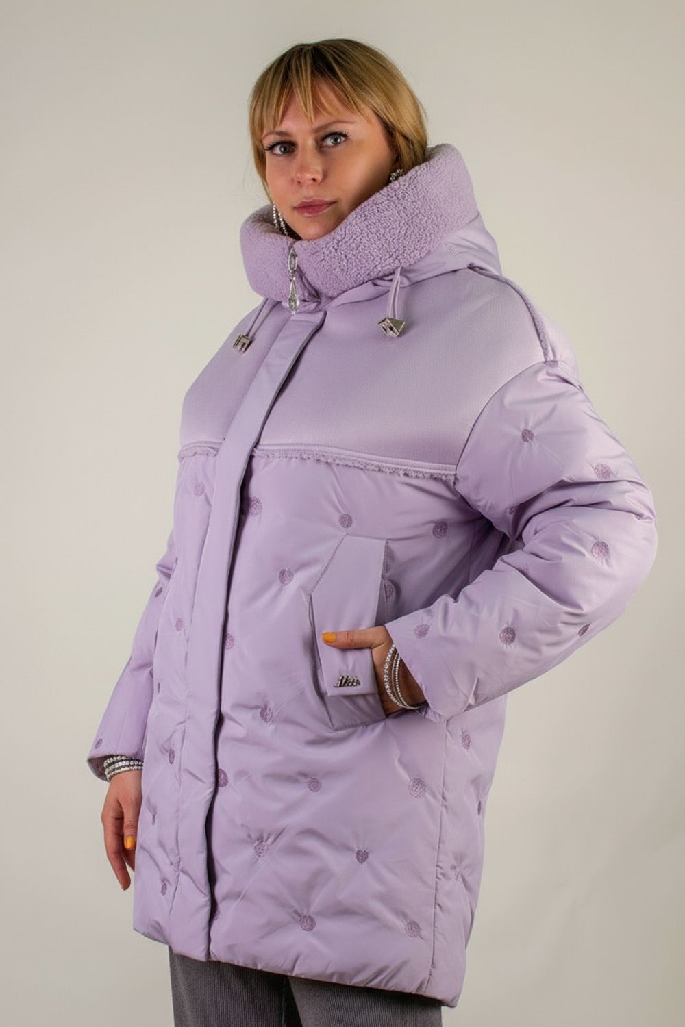 • Капюшон со стойкой-воротником на фиксаторах украшен двусторонней меховой опушкой «барашек» в цвет изделия – исключительное сочетание уютной фактуры и актуального дизайна.