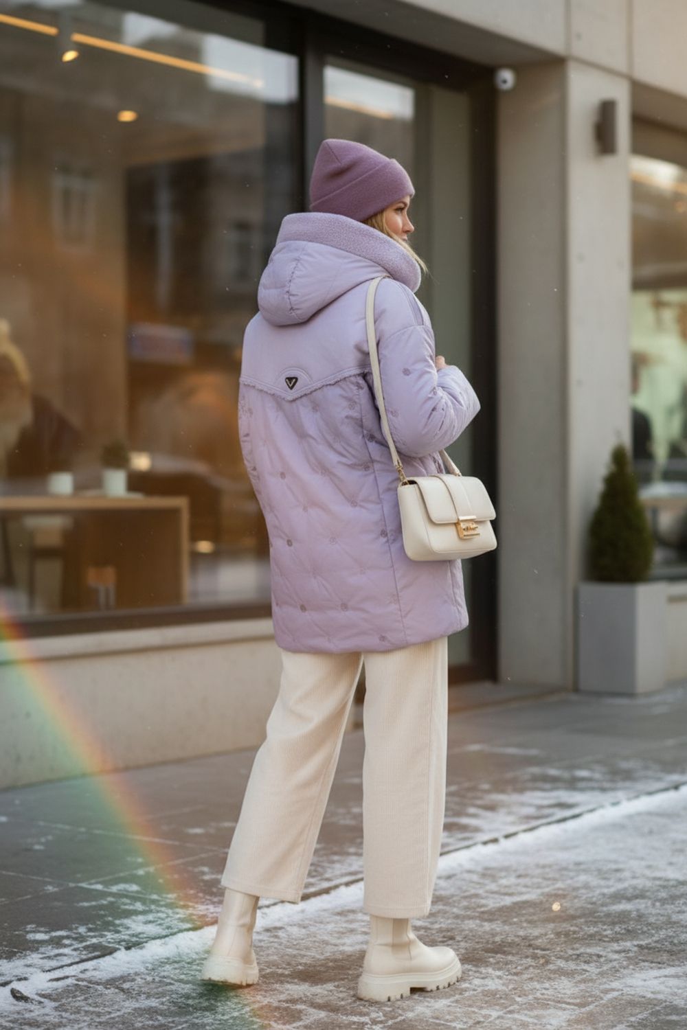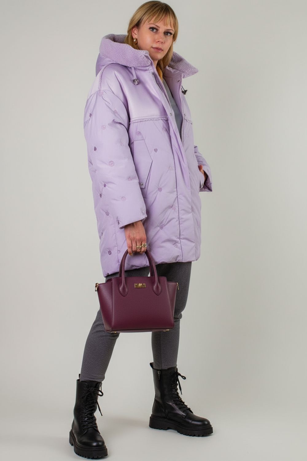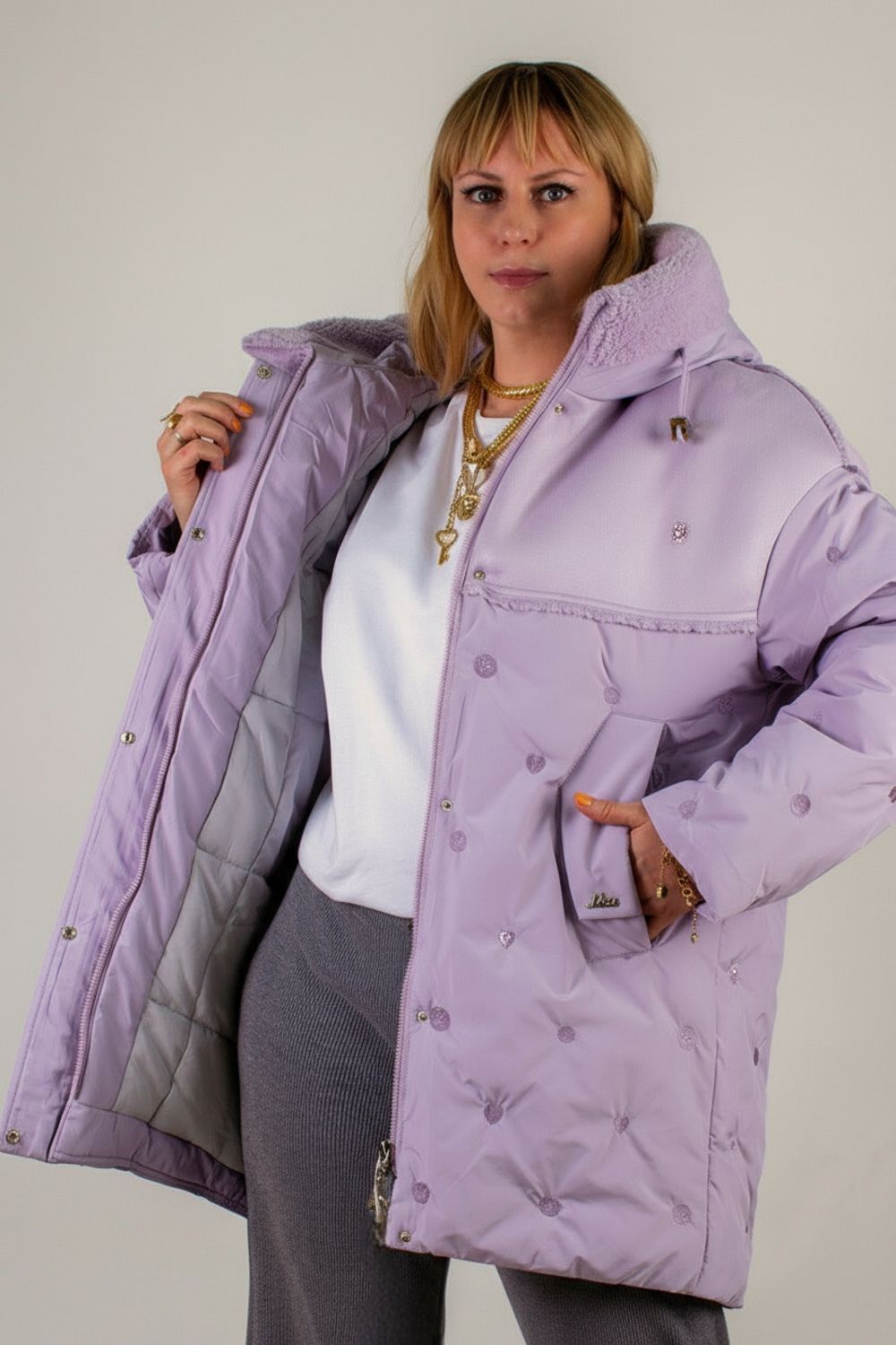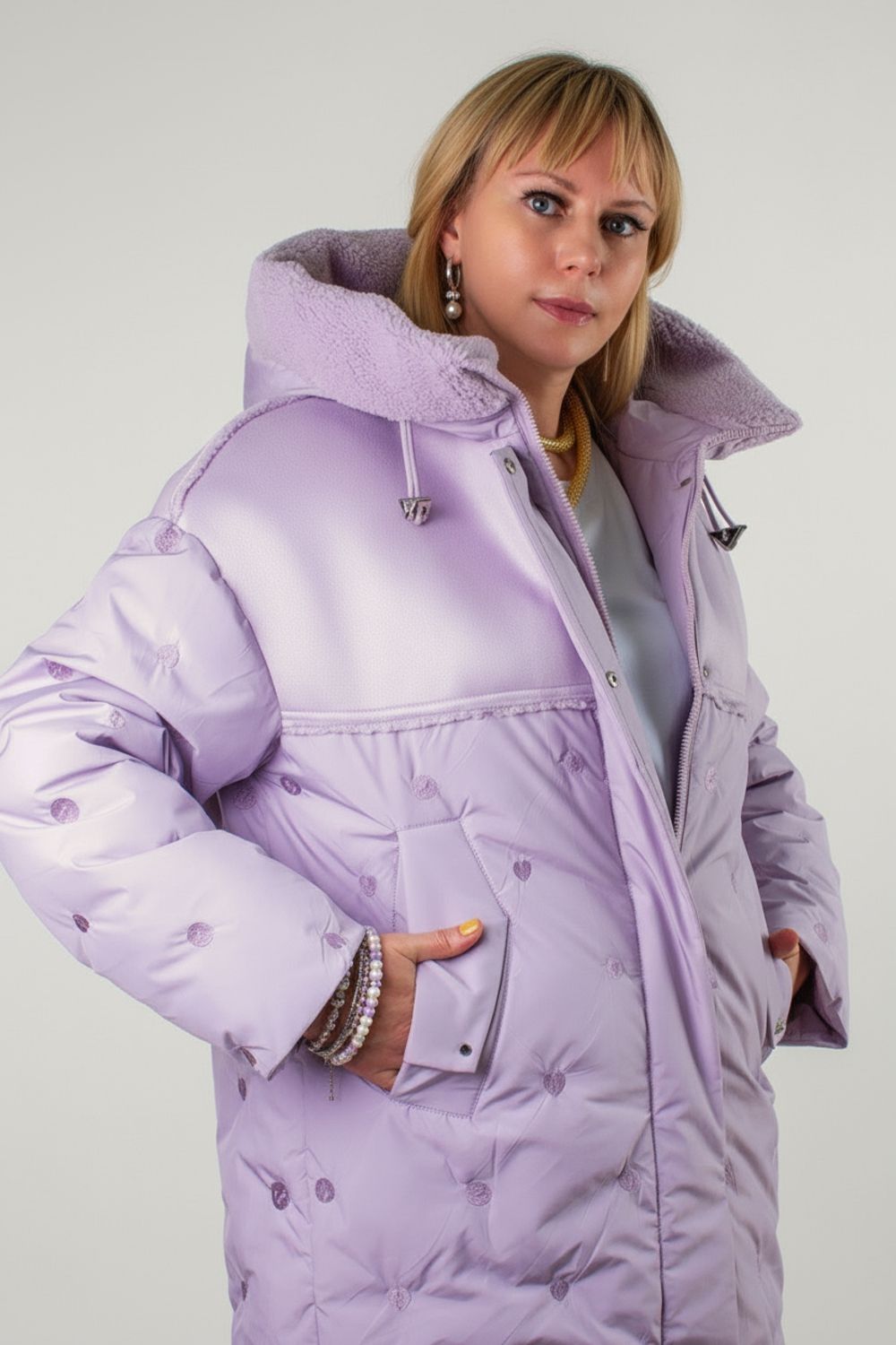 • Капюшон со стойкой-воротником на фиксаторах украшен двусторонней меховой опушкой «барашек» в цвет изделия – исключительное сочетание уютной фактуры и актуального дизайна.