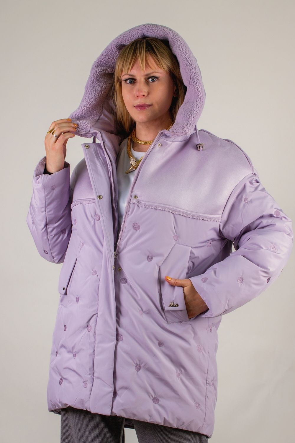 • Модная кокетка из утеплённой экозамши супер приятной на ощупь, отделана мехом в тон куртки. Вместо привычной строчки – современная ультрасовременная вышивка, придающая изделию роскошный вид.