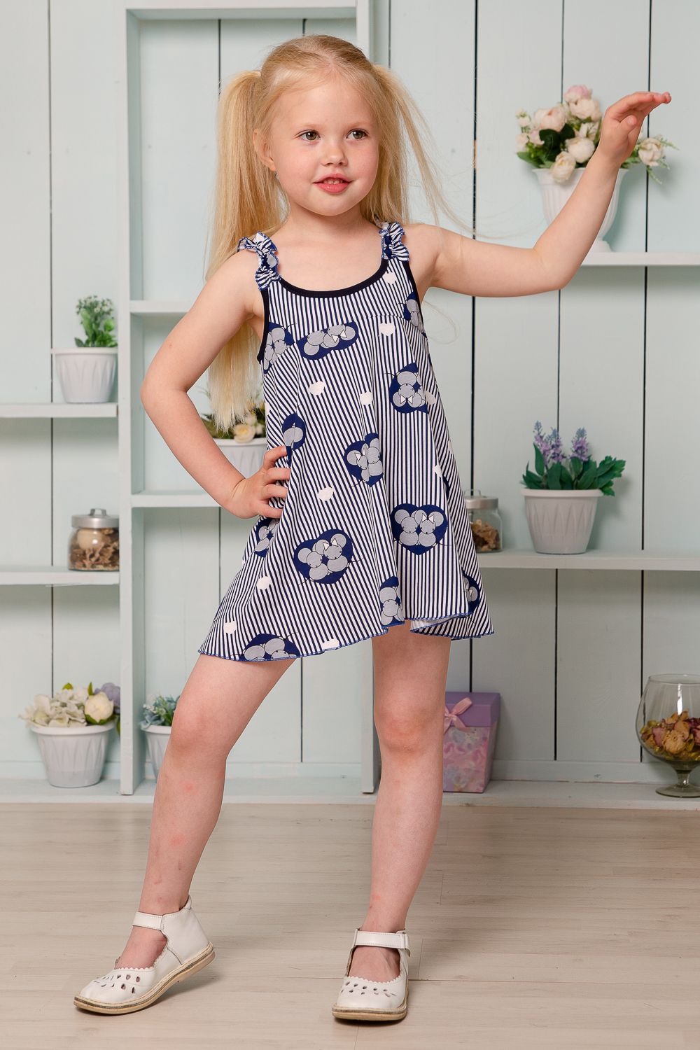 Сарафан детский летний, свободного силуэта с завышенной линией талии. Бретели выполнены из основной ткани собранной на тонкую резинку. Низ изделия обработан декоративной краеобметочной строчкой.