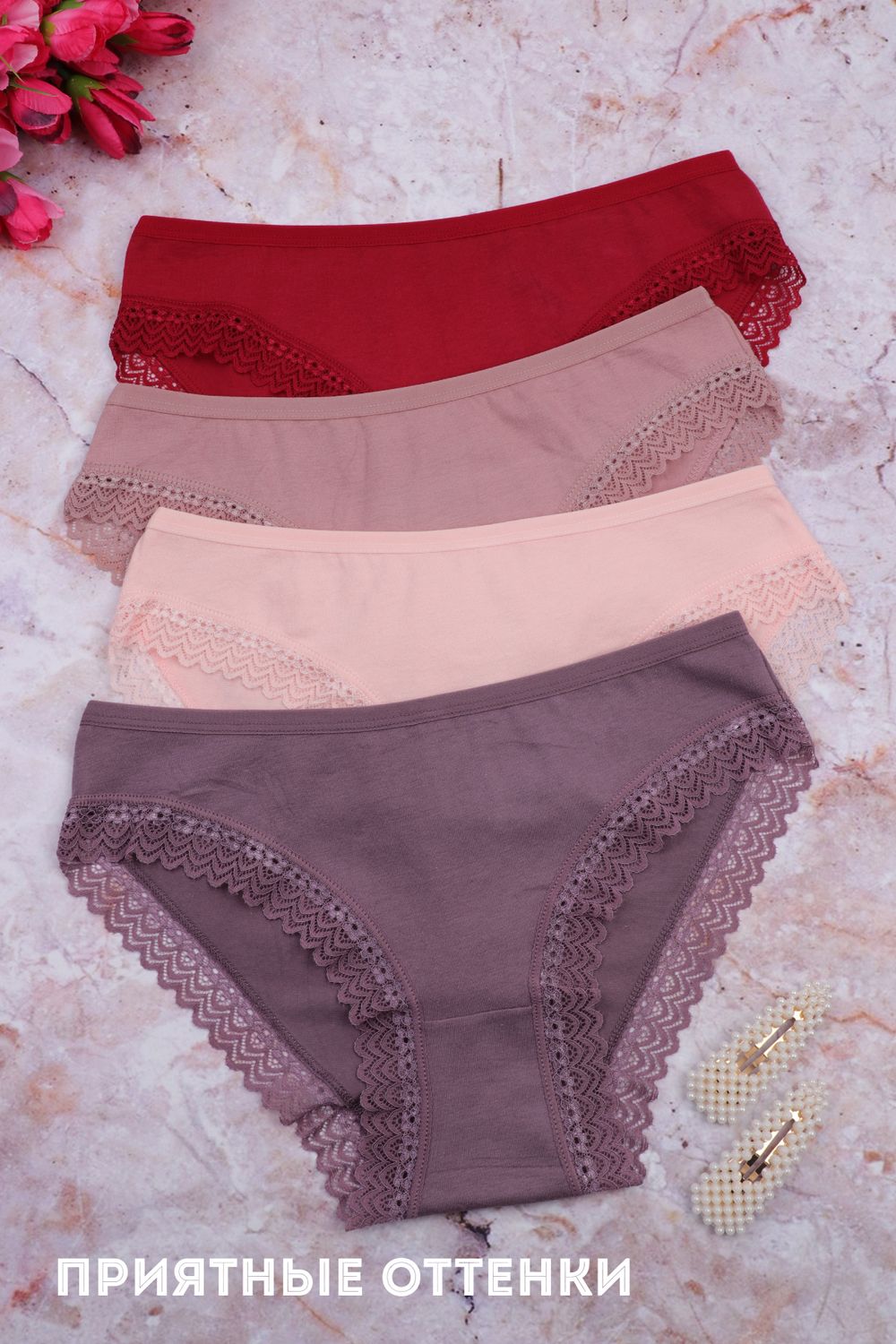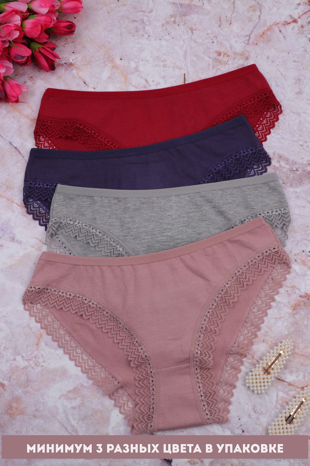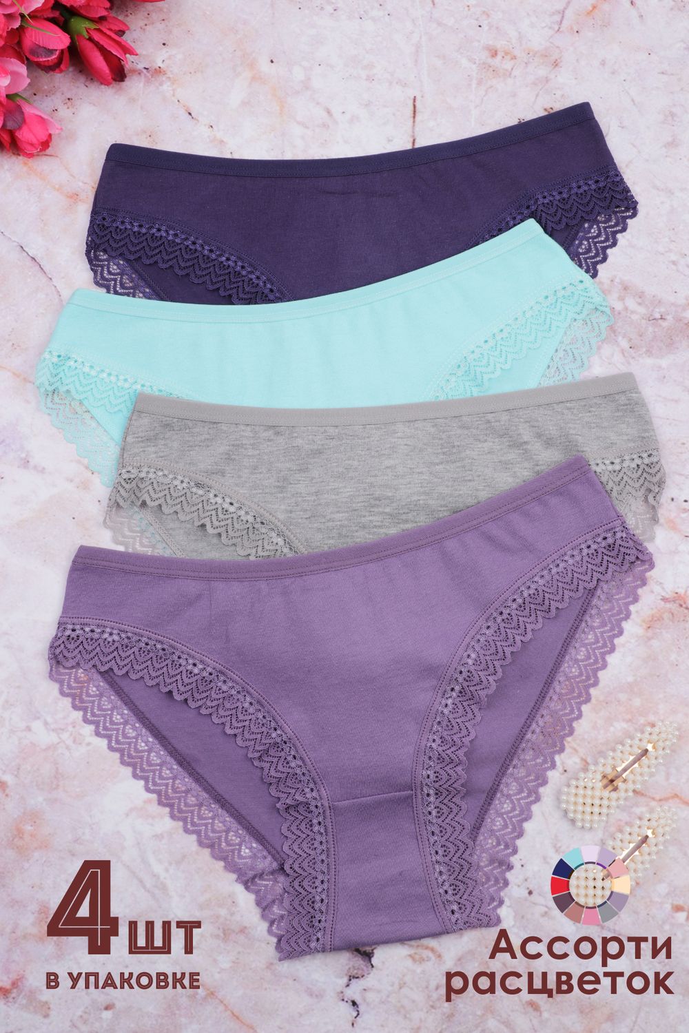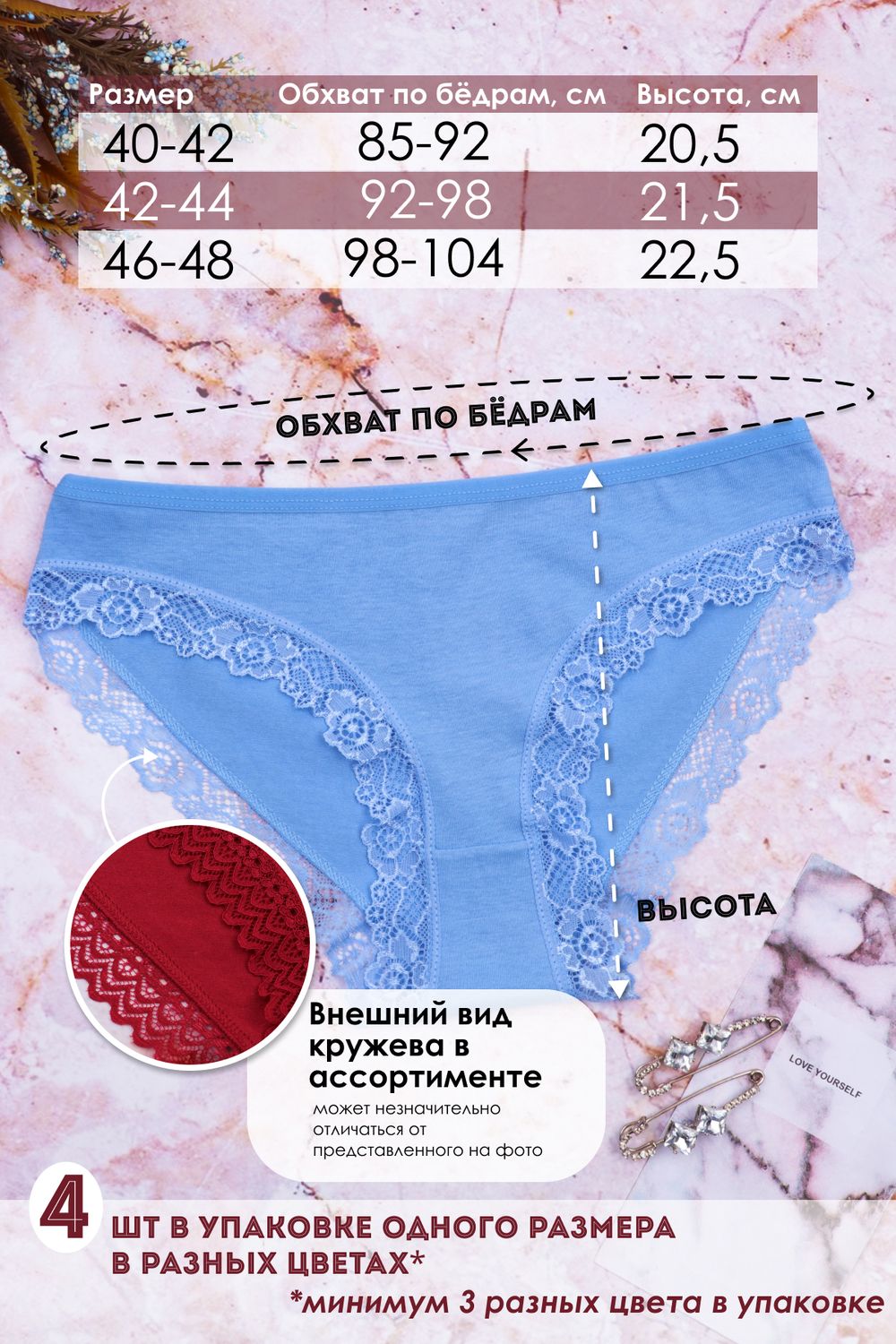 Трусы женские выполнены из 95% хлопка и 5% спандекса. В упаковке 4 штуки одного размера в разных цветах. Эластичные и мягкие кружева, универсальные расцветки. Ластовица в цвет изделия, мягкая и комфортная резинка. Множество вариантов цветов и оттенков. Могут отличаться от представленных на сайте. Минимум 3 разных цвета в упаковке.