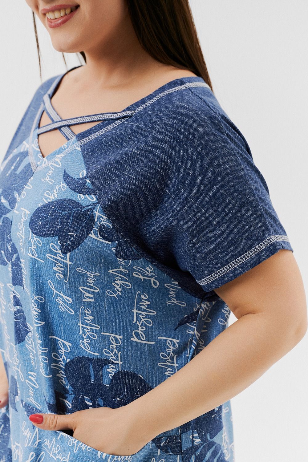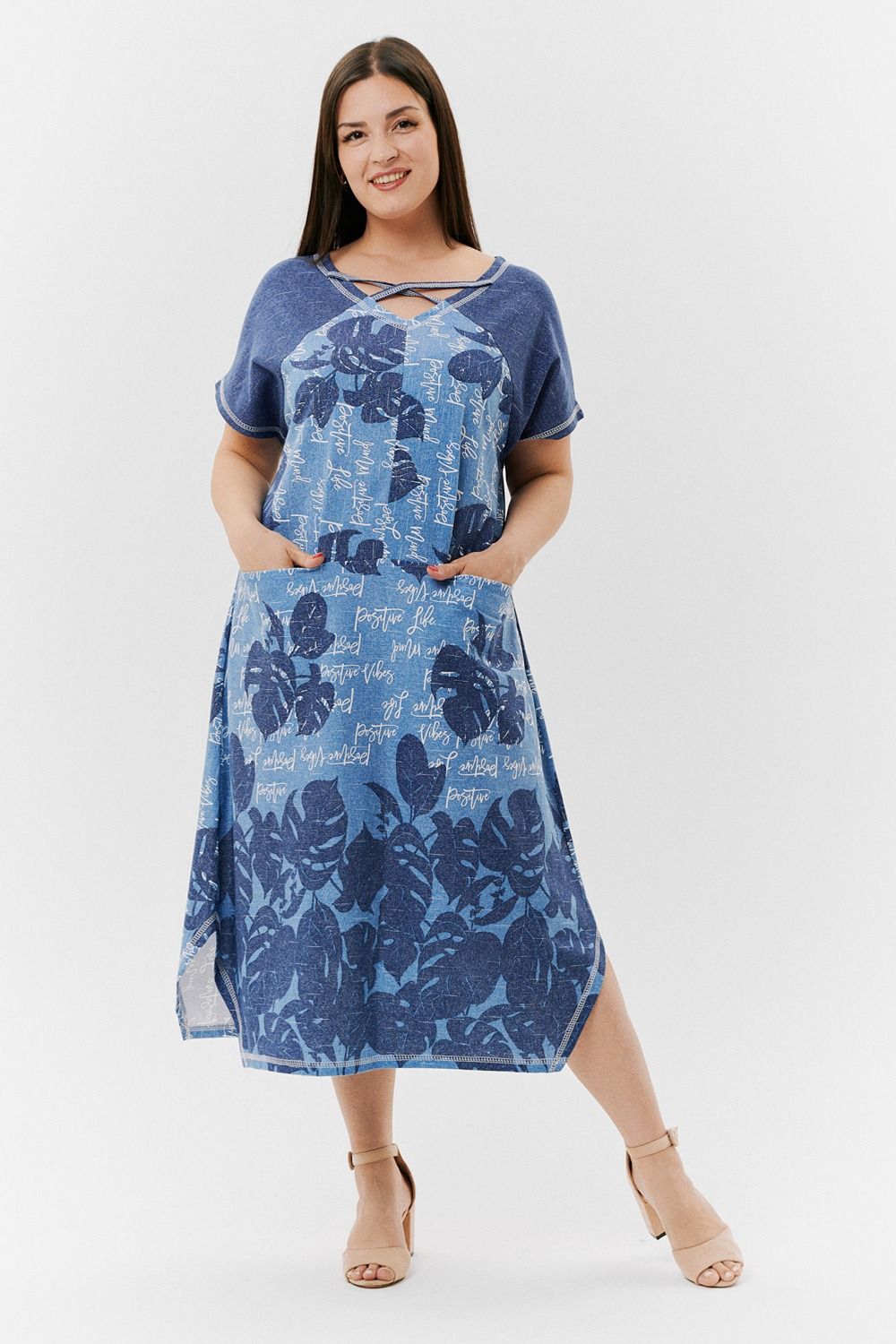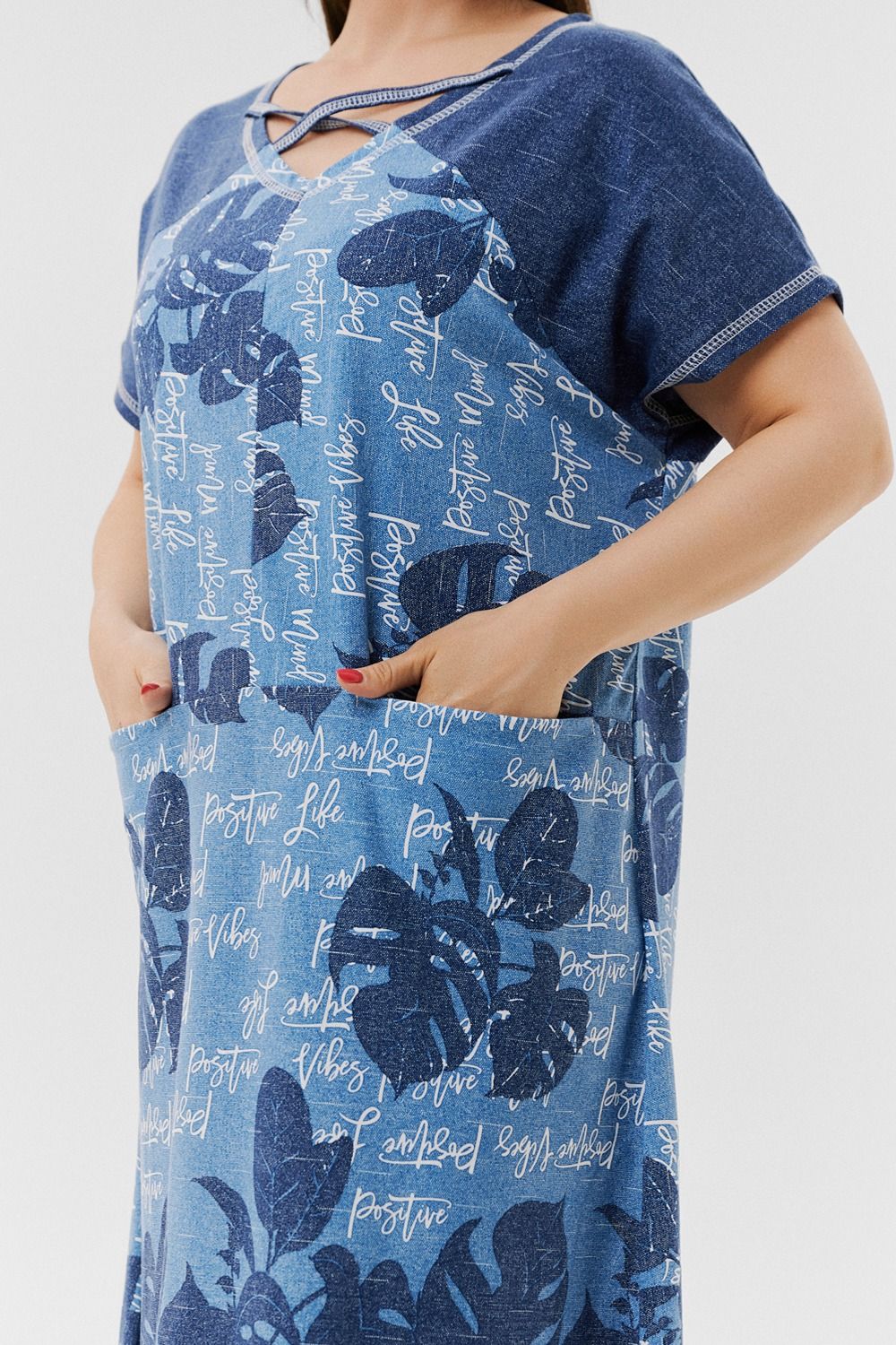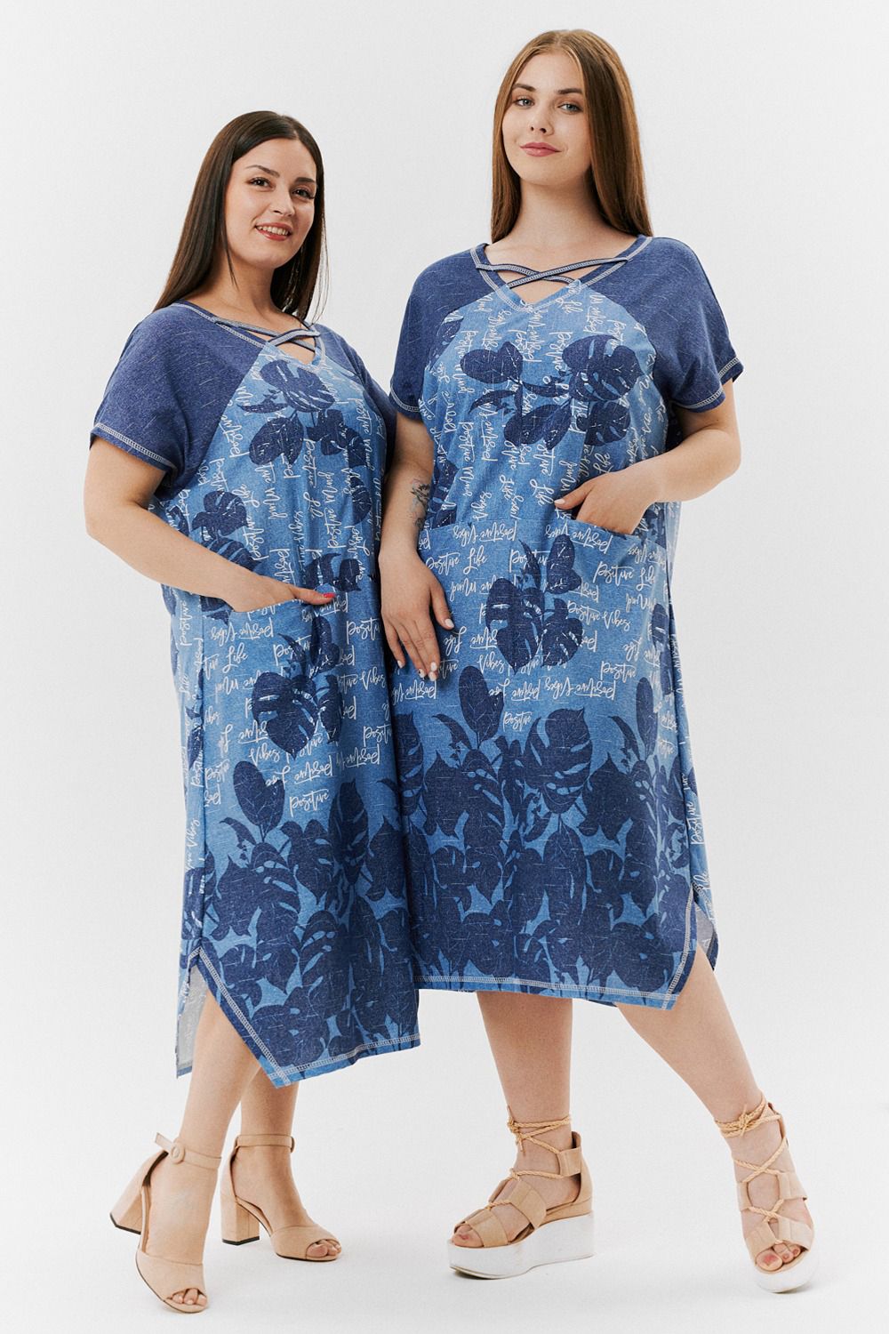 Платье женское, расширенное к низу. Рукав реглан, короткий. На Y-образной горловине два пересекающихся хляста из окантовки. В шве притачивания верхней и нижней частей полочки внутренние горизонтальные карманы. Боковые швы внизу платья срезаны под углом.