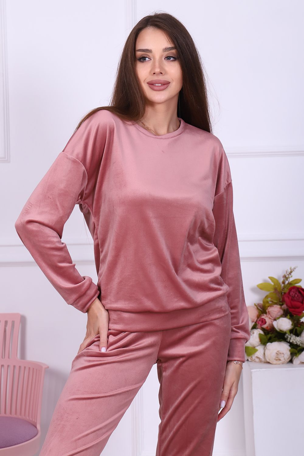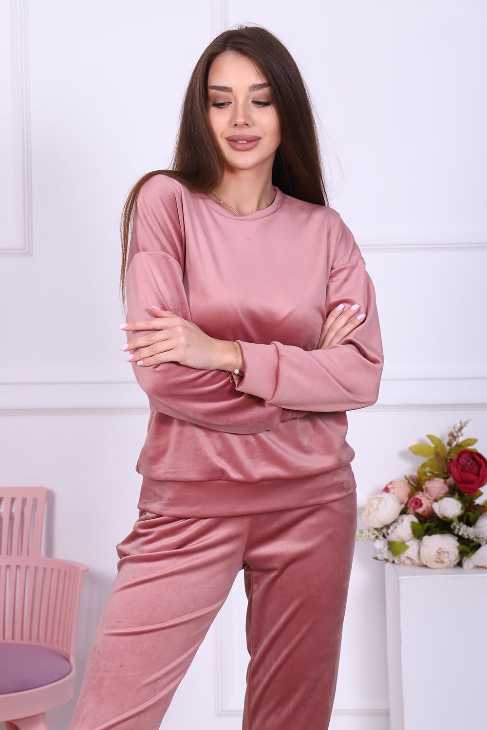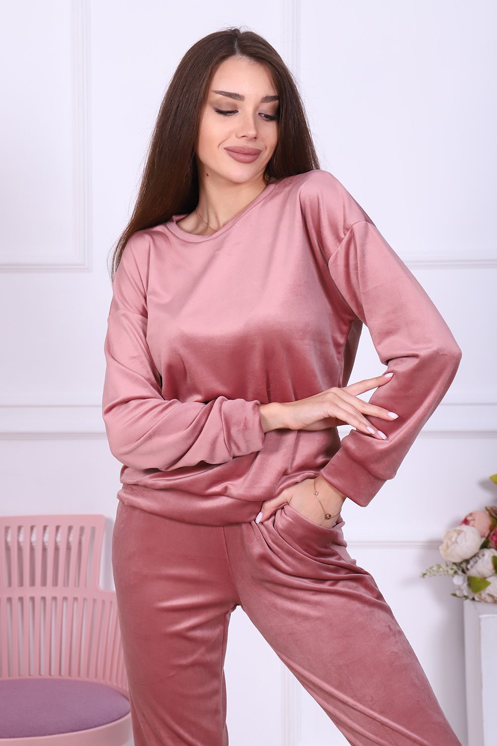 Женский домашний костюм, состоящий из джемпера с длинным рукавом и брюк. Брюки с карманами в боковых швах со скошенным входом для удобства, с широким притачным поясом на резинке, отделан декоративной отстрочкой. Низ брюк на притачной манжете из основной ткани. Джемпер свободного покроя с округлой горловиной чуть зауженный внизу манжетой за счет небольшой сборки. Рукав втачной, низ рукава на притачной манжете шириной 6 см. Костюм выполнен из нежной на ощупь бархатной ткани - иконвелюра, который переливается на свету и очень приятен на ощупь. Изделие не мнется, не требует глажки, что очень удобно в использовании. Можно носить дома, как домашний комплект, как пижаму для сна, а также на выход, как костюм для прогулок в холодное время года, как спортивный костюм, на дачу, для школы и т. д. Большой выбор нежных и насыщенных расцветок на любой вкус! Отличный подарок самым любимым!