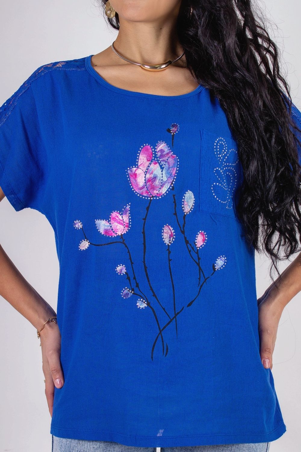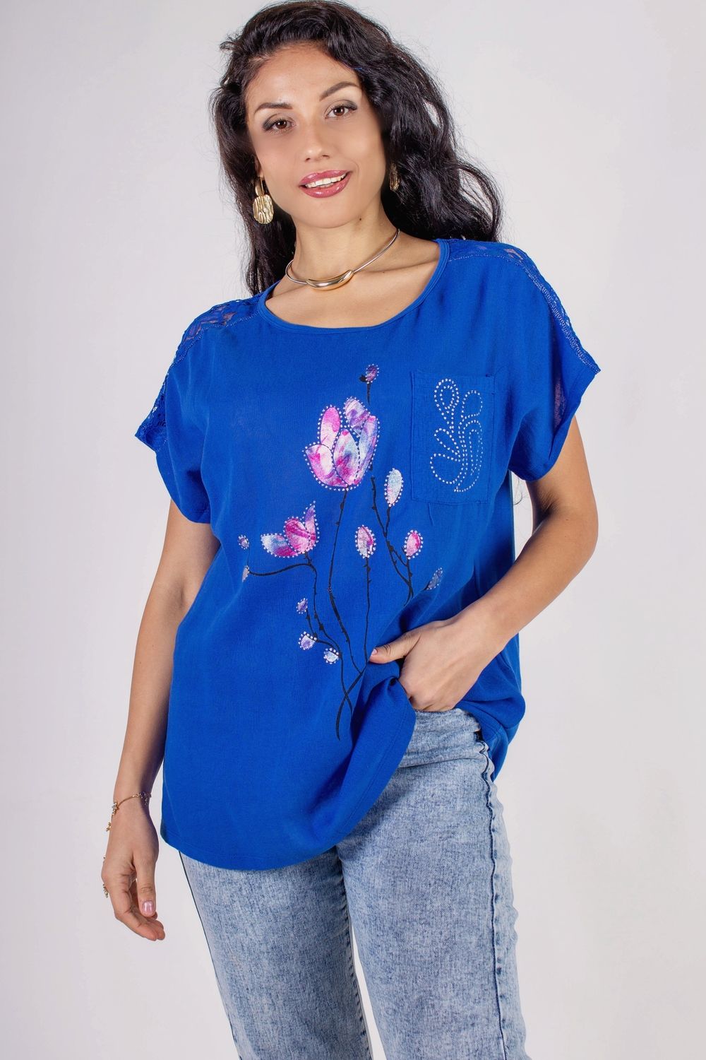На груди располагается кармашек, украшенный серебристым орнаментом. Он не только добавляет акцент, но и выполняет функциональную роль, позволяя всегда иметь под рукой мелкие вещи. Кроме того, блуза дополнена изящной кружевной полоской, которая визуально удлиняет линию рук и придает образу легкости и романтичности.