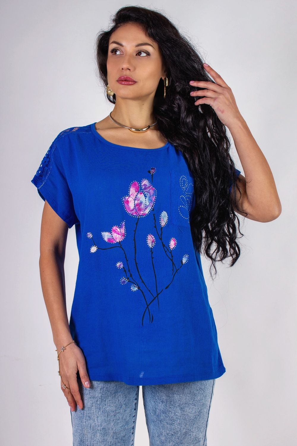 Эта блуза сочетает в себе стиль, комфорт и оригинальность, идеально подходя современным модницам, ценящим индивидуальность в своем гардеробе. Передняя часть изделия выполнена из легкого и дышащего льна, дарящего ощущение свежести на протяжении всего дня, в то время как задняя часть из мягкого хлопкового трикотажа обеспечивает уют и свободу движений.