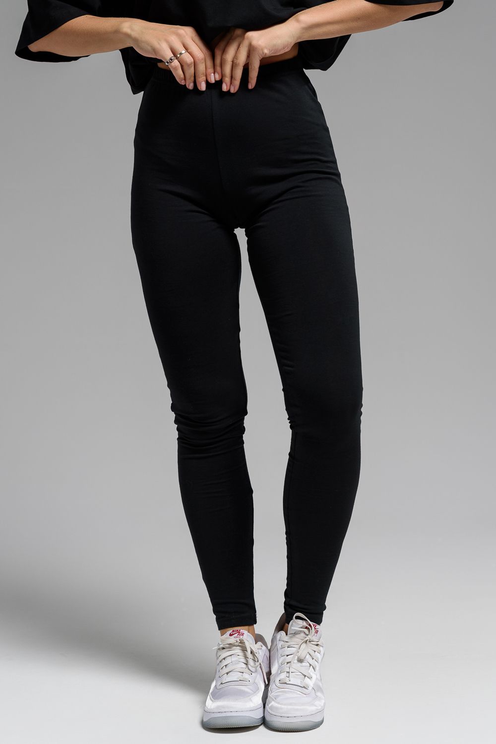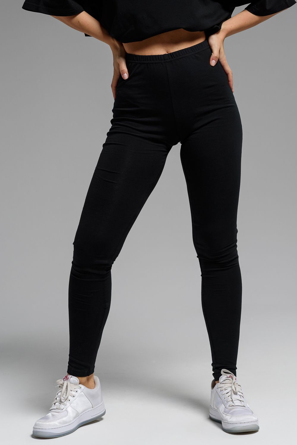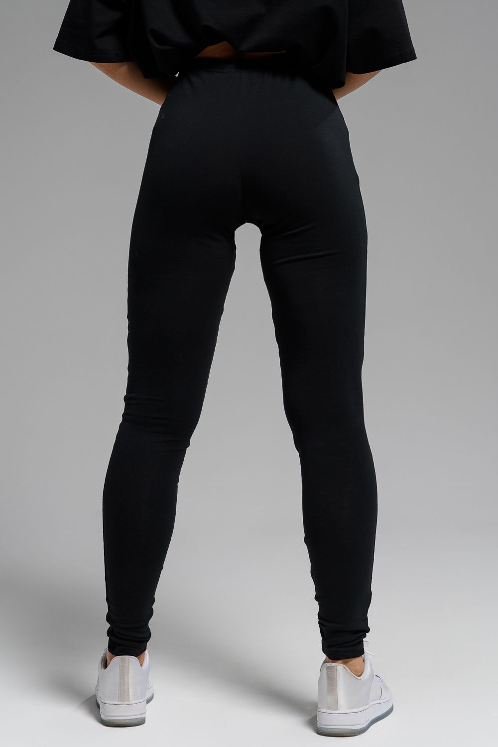 Леггинсы из кулирки с лайкрой. Черная однотонная расцветка, длина до щиколоток, на поясе эластичная резинка.