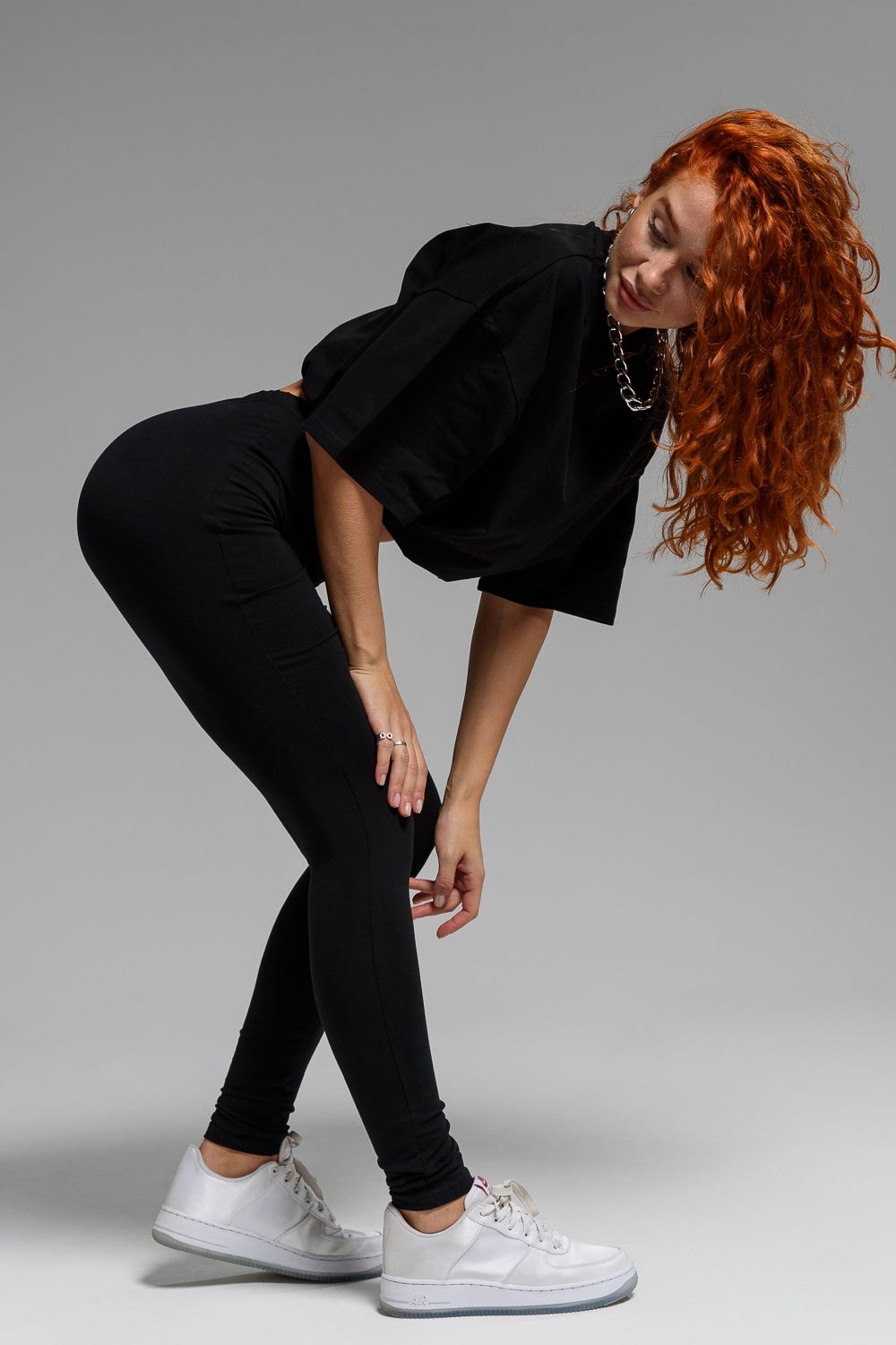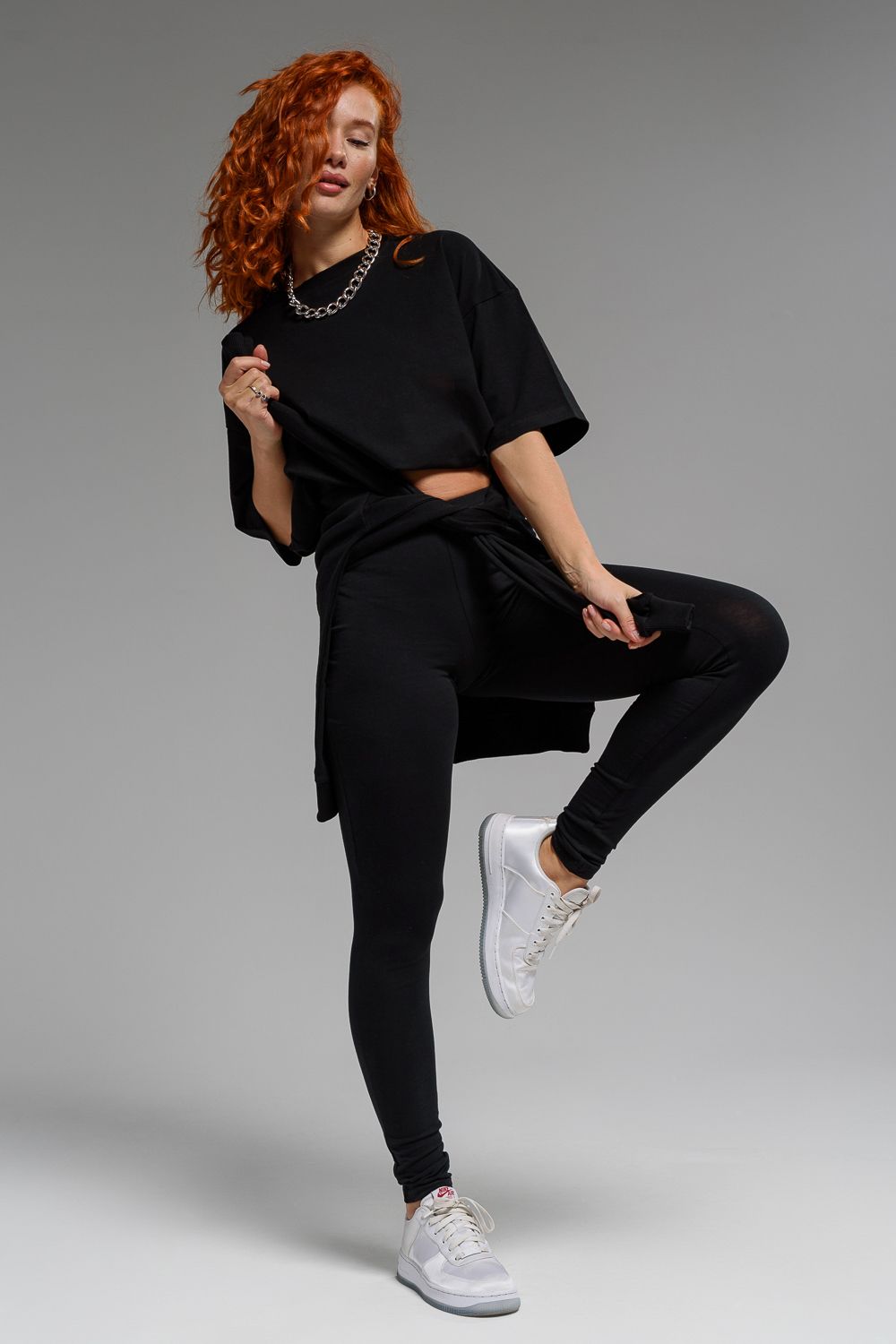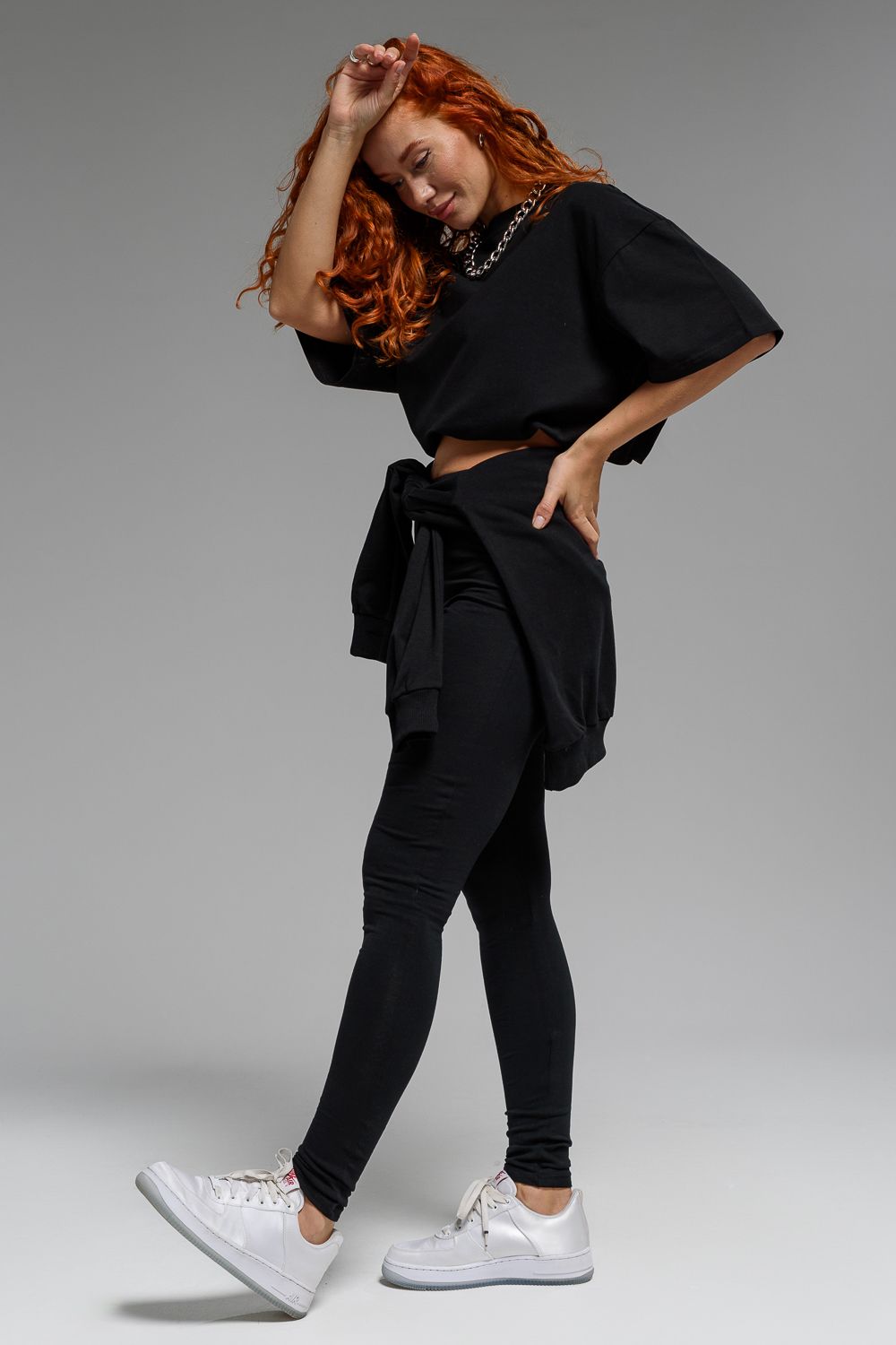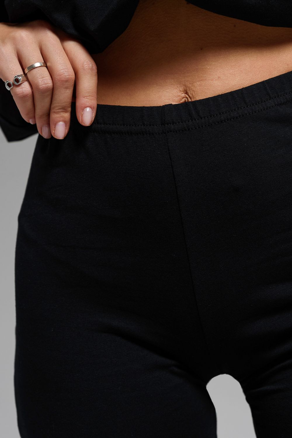 Леггинсы из кулирки с лайкрой. Черная однотонная расцветка, длина до щиколоток, на поясе эластичная резинка.