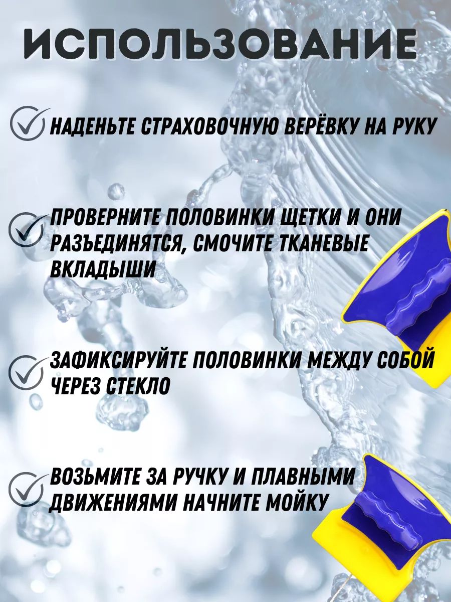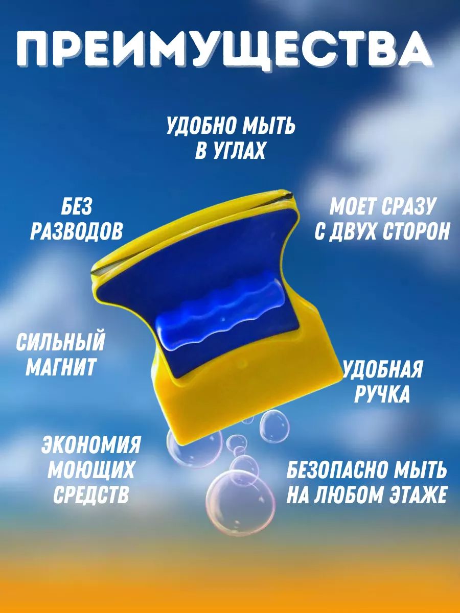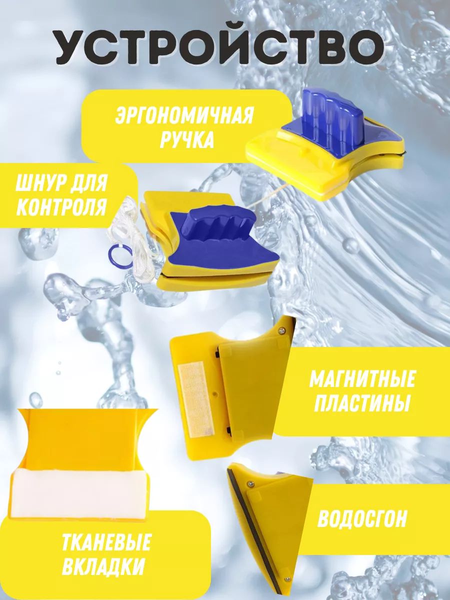 Надоел бесконечный уход за стеклами, окнами и зеркалами? Хочется взглянуть на мир из окна без разводов? Тогда выбирай удобное приспособление для дома и дачи - магнитная двухсторонняя щетка для окон. Магнитная щетка для мытья с двух сторон имеет усиленные магниты и надёжно крепится на стекло. Подходит только для однослойного стекла. Не подойдёт для двух- и трехкамерных пластиковых окон!!! Желтая щетка для мытья окон окномойка рассчитана на толщину стеклопакета до 10 мм. Наше средство для мытья стекол является недорогой и не менее качественной альтернативой, чем робот мойщик окон. Мойщик окон робот имеет существенные недостатки в виде стоимости, массы и ограниченной мобильности, в то время как магнитная щетка для стекол имеет ряд преимуществ: не высокая цена, простота обслуживания с ней справится даже ваша бабушка, более быстрая уборка за счет очистки окна одновременно с двух сторон. Вы моете окно с внутренней стороны, вторая щетка оттирает загрязнения с внешней стороны. Теперь мытье окон будет занимать гораздо меньше времени и сил благодаря окномойки!