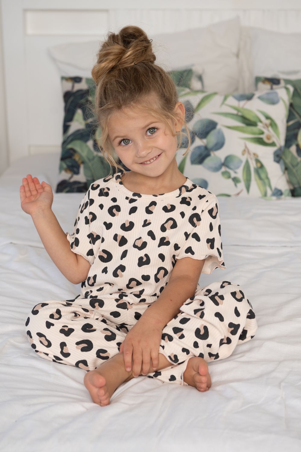 Детская пижама «Маркиза» выполнена из мягкого хлопкового трикотажа с трендовым леопардовым принтом. Лёгкая, приятная к телу ткань дарит комфорт и свободу движений. Укороченные рукава и свободные брюки обеспечивают удобство и уют во время сна.