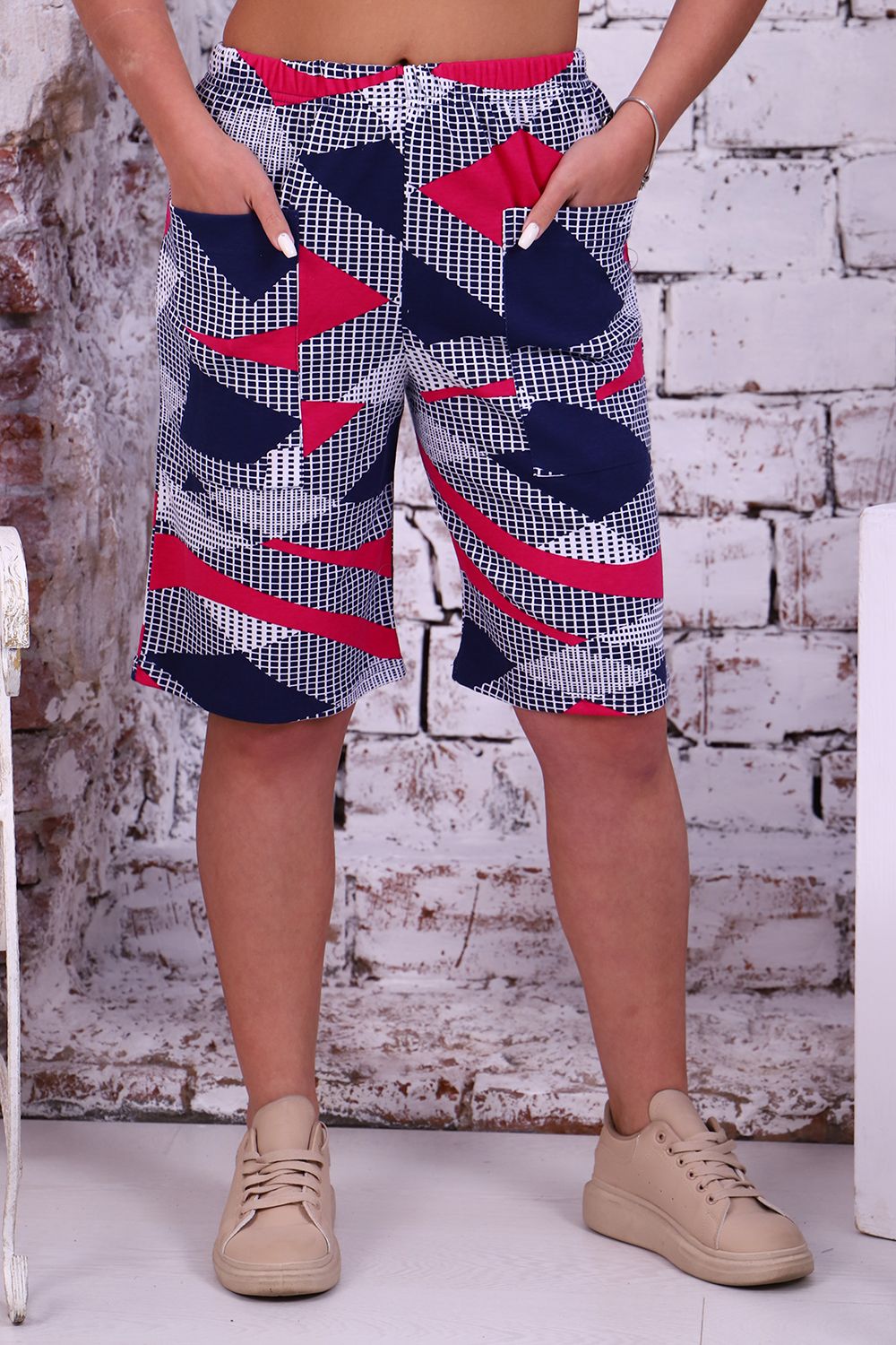 Шорты женские из интерлока. Шорты длиной выше колена, на притачном поясе с накладными карманами.