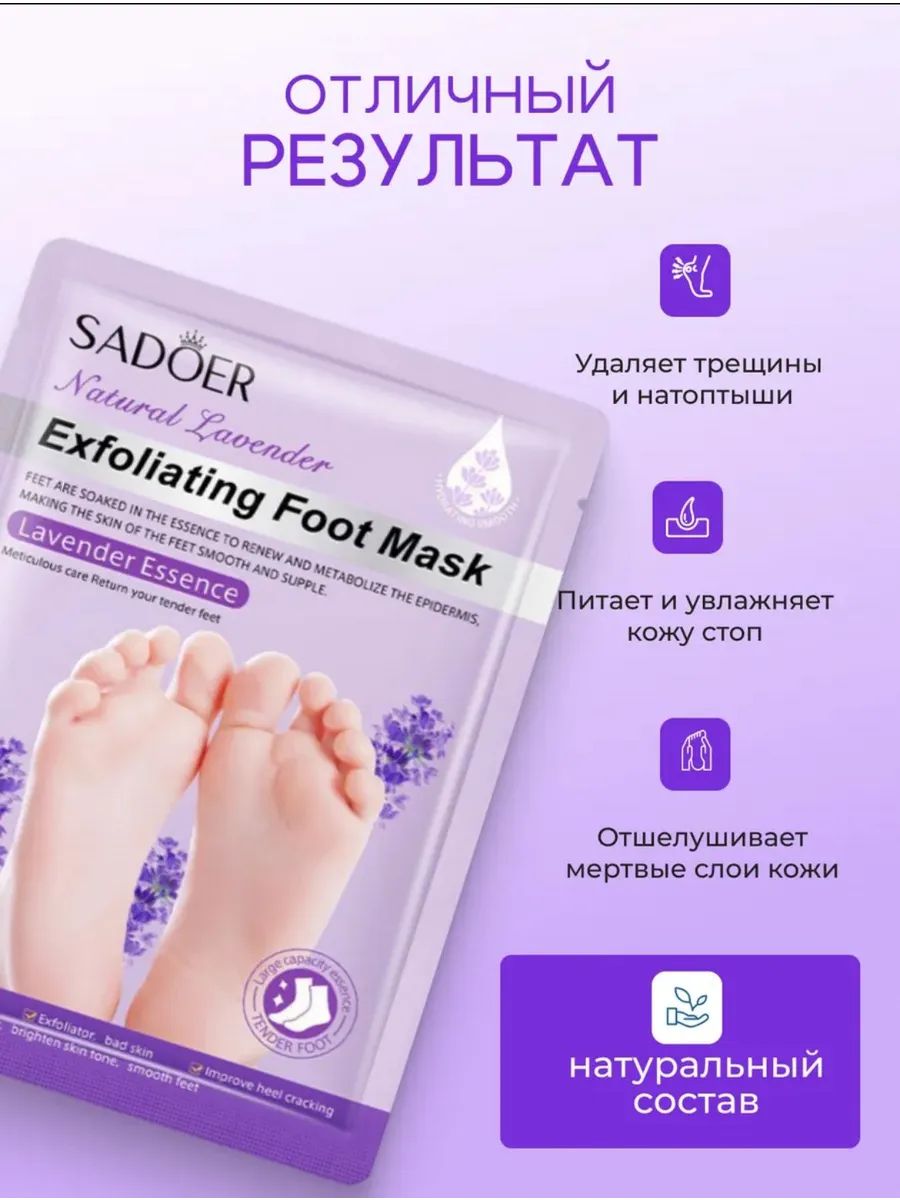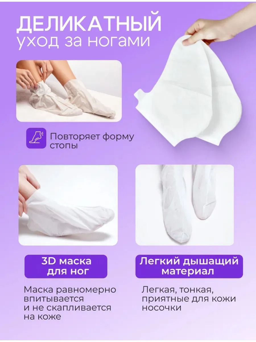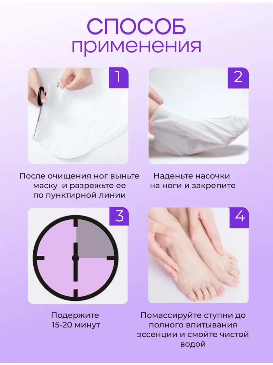 Маска специально разработана для эффективного увлажнения сухой кожи ног. Масло увлажняет верхние слои эпидермиса, что не только повышает эластичность, но и восстанавливает защитные свойства и местный иммунитет кожных покровов. Удаляет омертвевшую кожу ног и мозоли. Применение: на чистые, сухие ступни надеть носочки и оставьте на 20-30 минут, затем снять, а остатки средства равномерно распределите по коже ног.