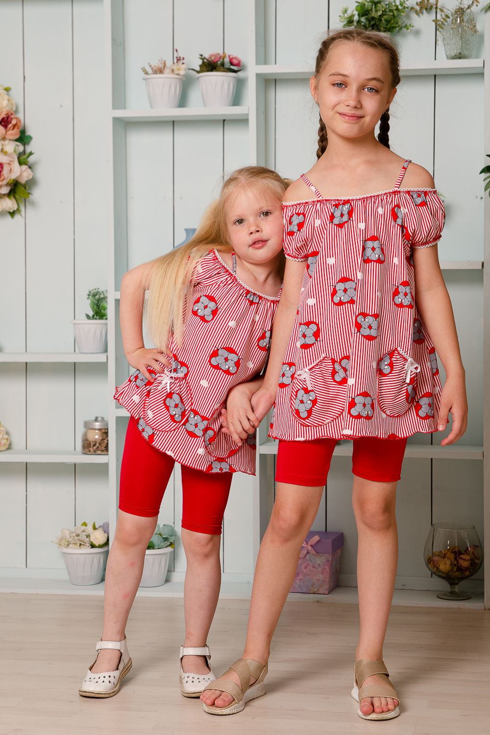 Майка детская летняя. Свободного А-силуэта на тонких бретелях. С двумя декоративными кармашками, на которых настрочены бантики из атласной ленты. Горловина и рукава собраны на кружевную резинку. Все срезы в изделии обработаны декоративной краеобметочной строчкой.