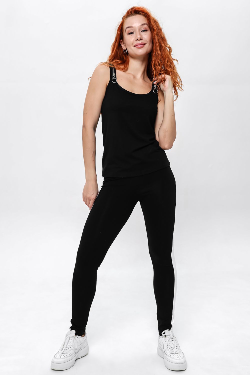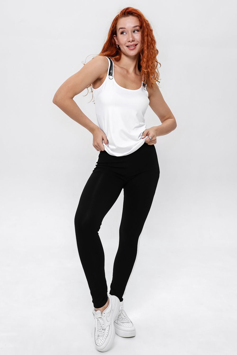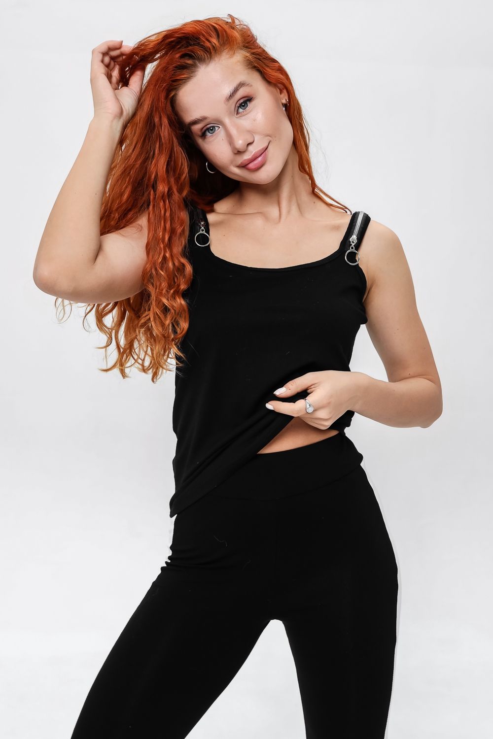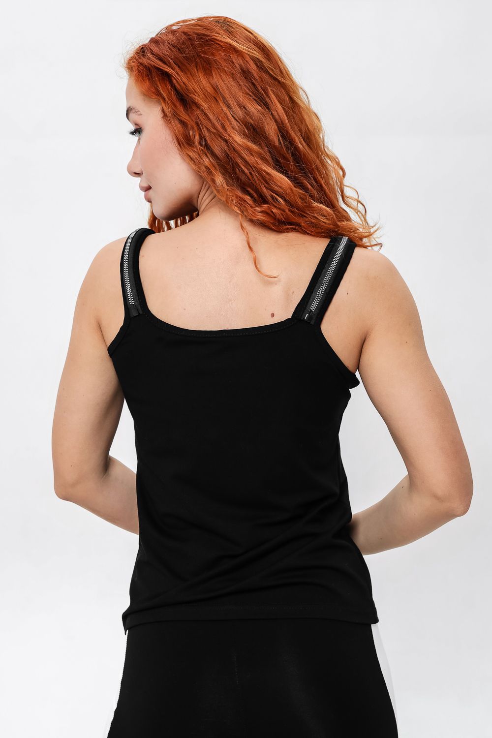 Майка прилегающего силуэта, средней длины, с округлой горловиной. Бретели выполнены в виде молний. Горловина и проймы обработаны бейкой из основного полотна