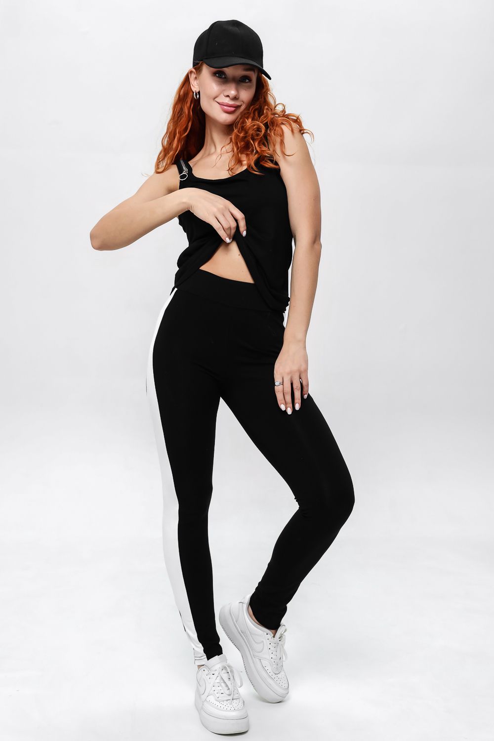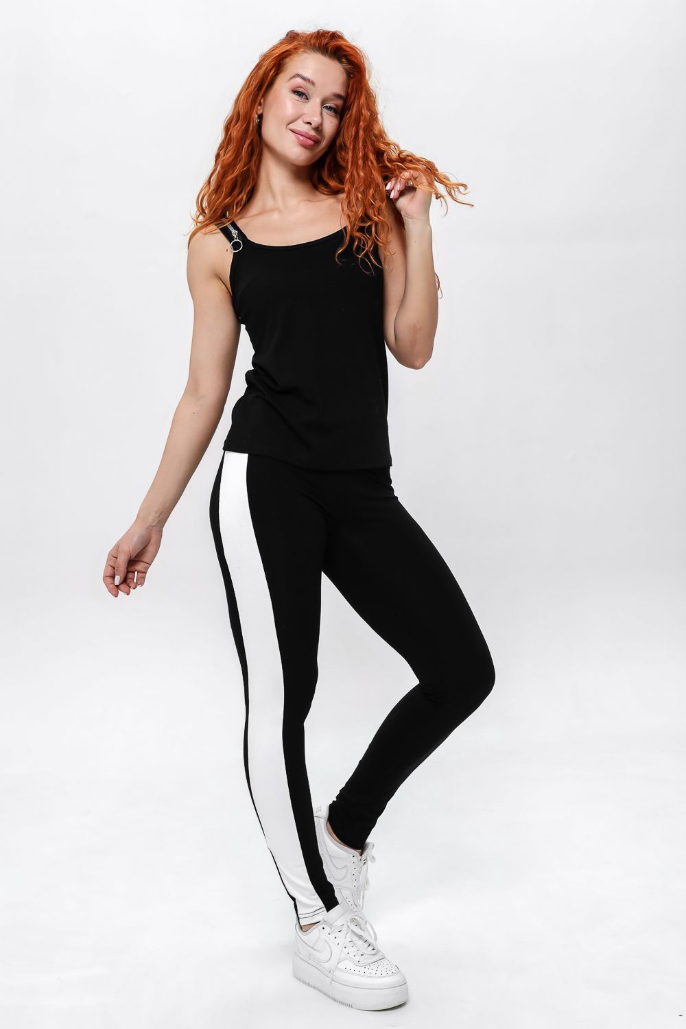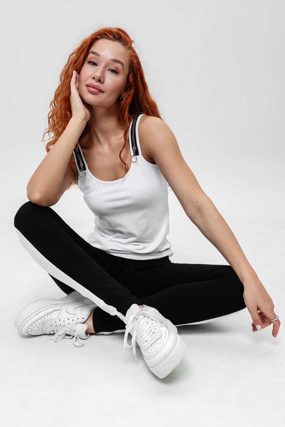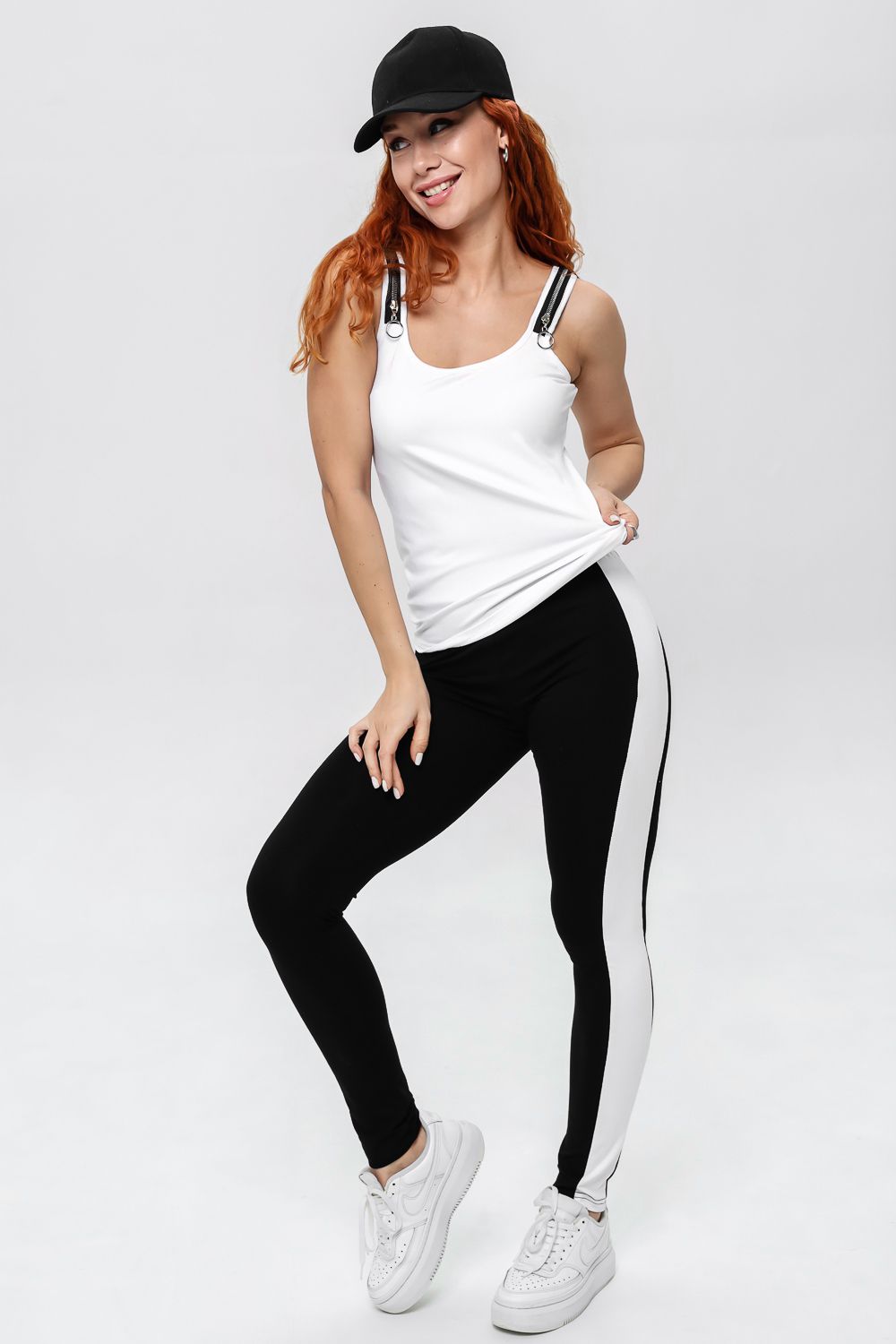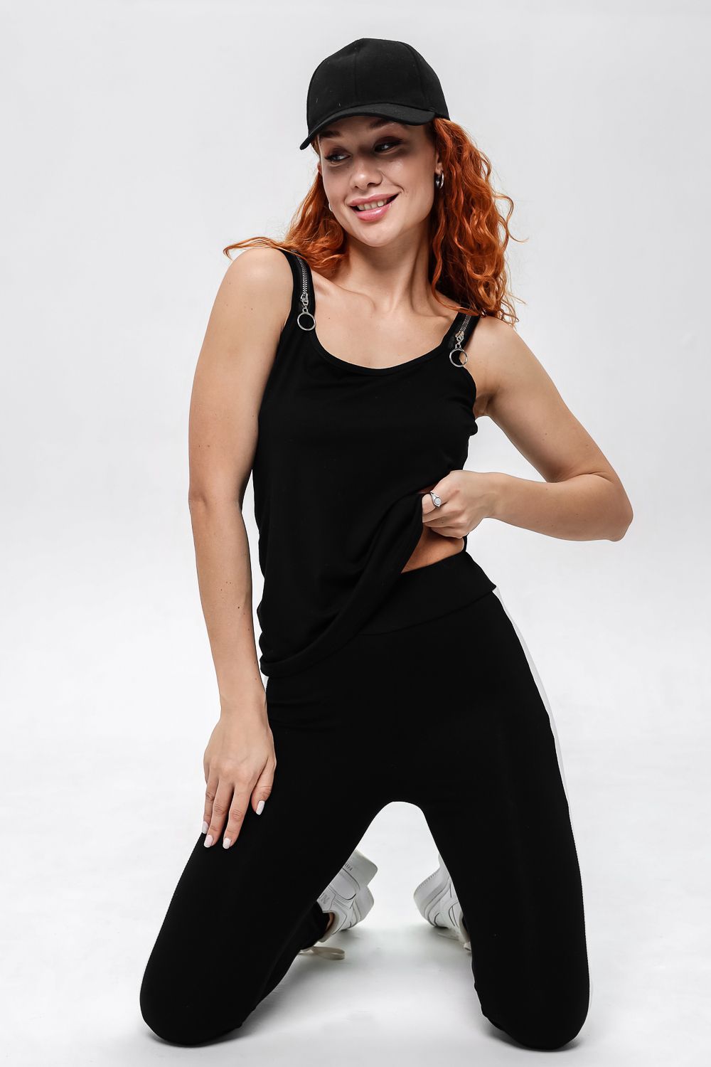 Майка прилегающего силуэта, средней длины, с округлой горловиной. Бретели выполнены в виде молний. Горловина и проймы обработаны бейкой из основного полотна