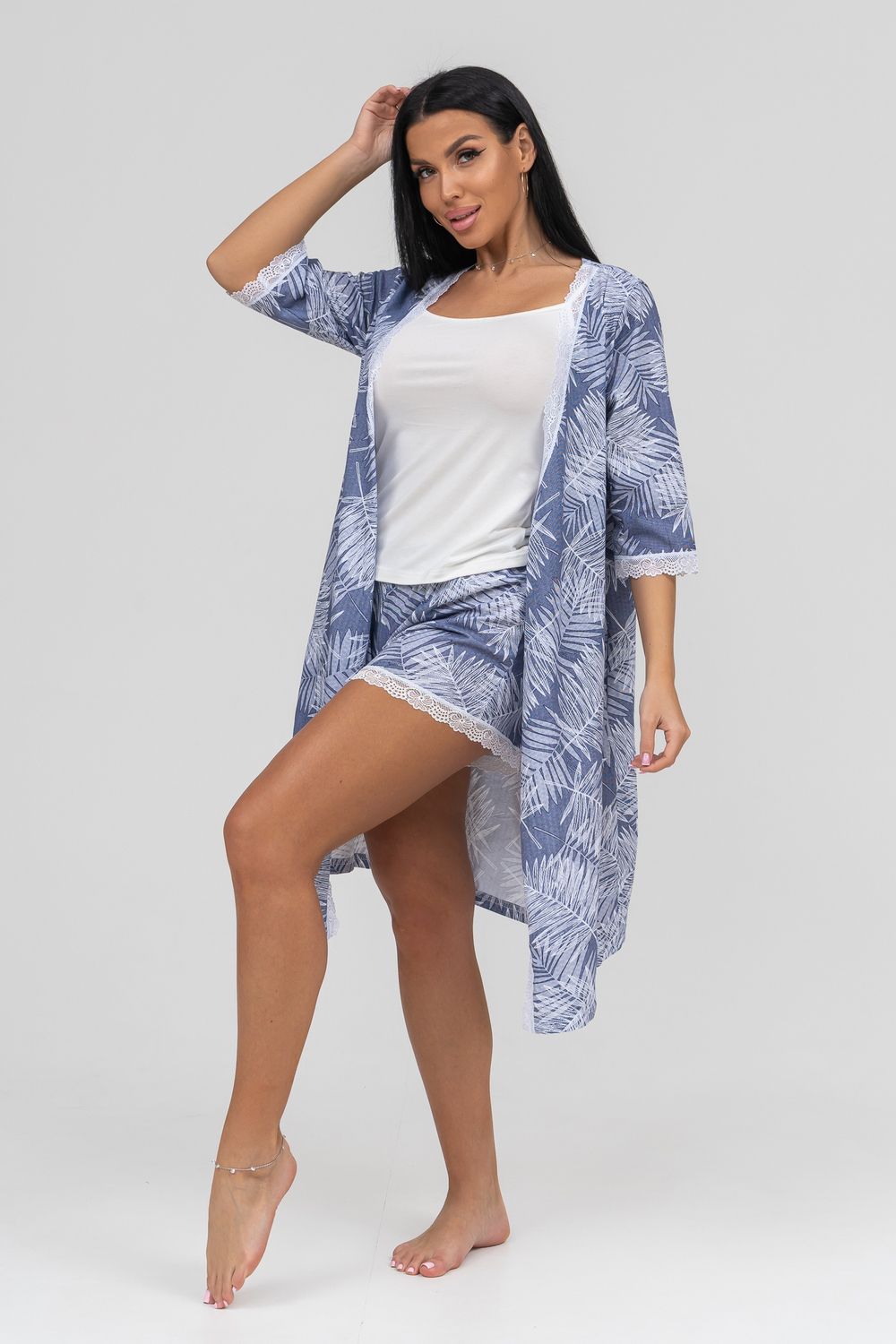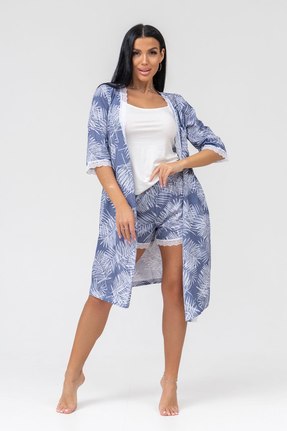 Комплект из топа и шорт. Удлиненный топ на бретелях из вискозы (95% вискоза, 5% лайкра), низ шорт из кулирки (100% хлопок) украшен ажурным кружевом.