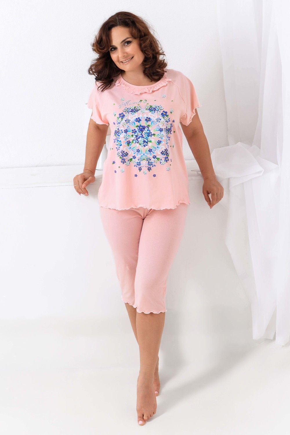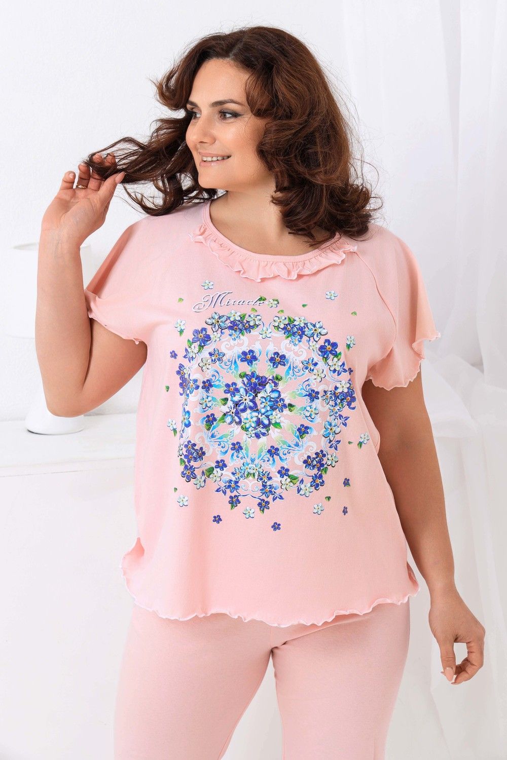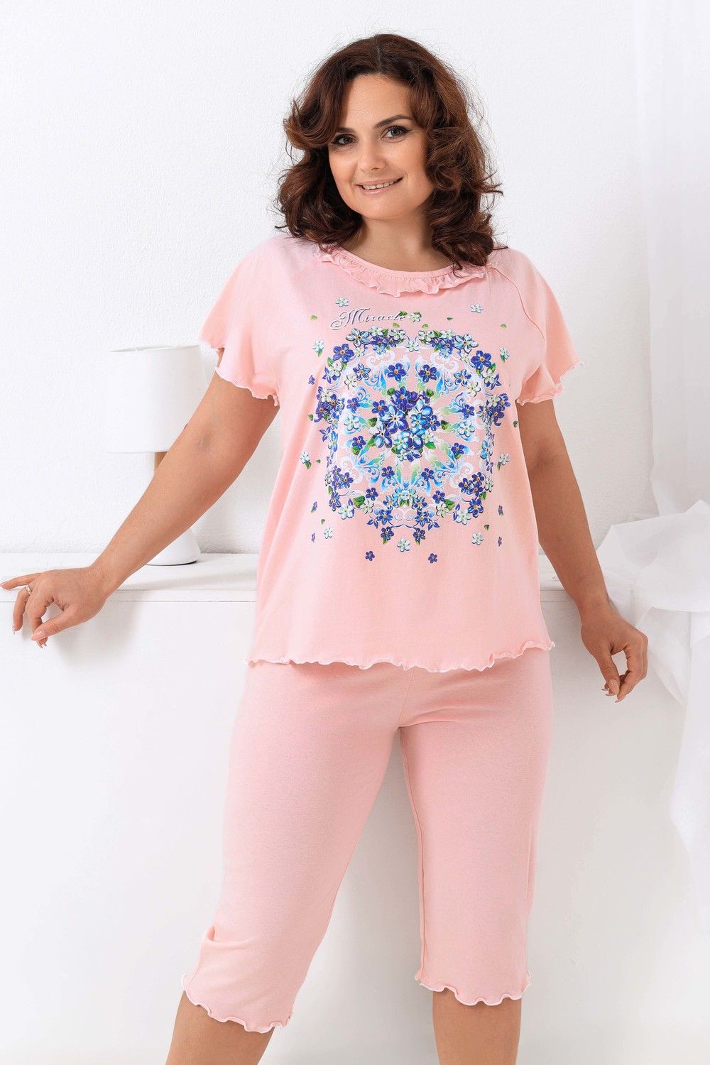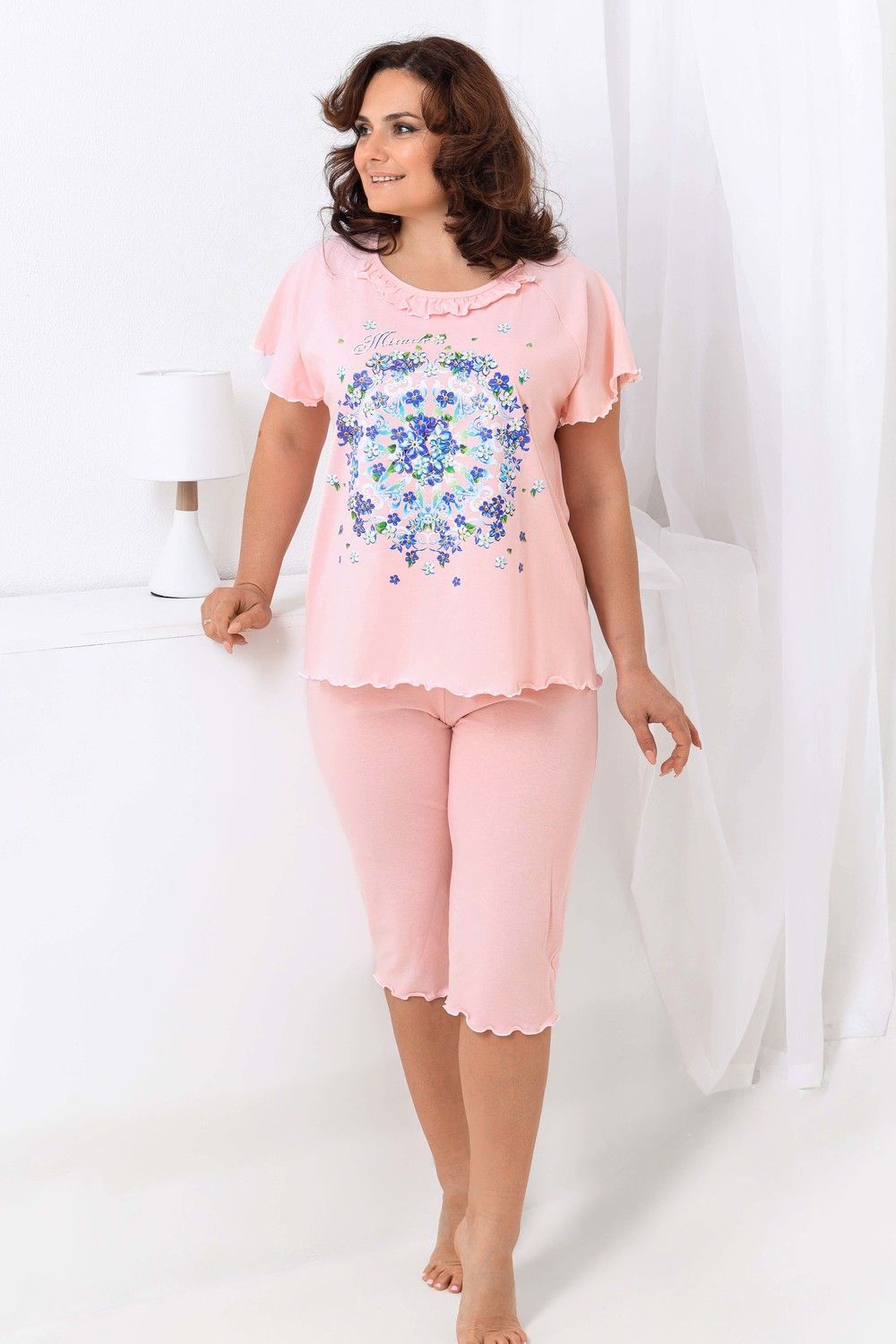 Пижама женская с симпатичной рюшей по горловине. Очень свободный и удобный крой. Рукав-реглан не стесняет движение рук. Обработка рукава и низа изделия в виде лёгкой волны придаёт лёгкость и воздушность. Шикарный принт в виде орнамента из россыпи цветов. Оттенок ментола может отличаться от фото.