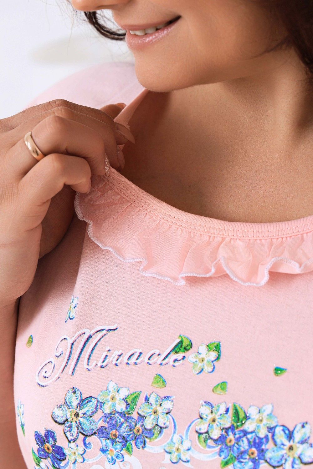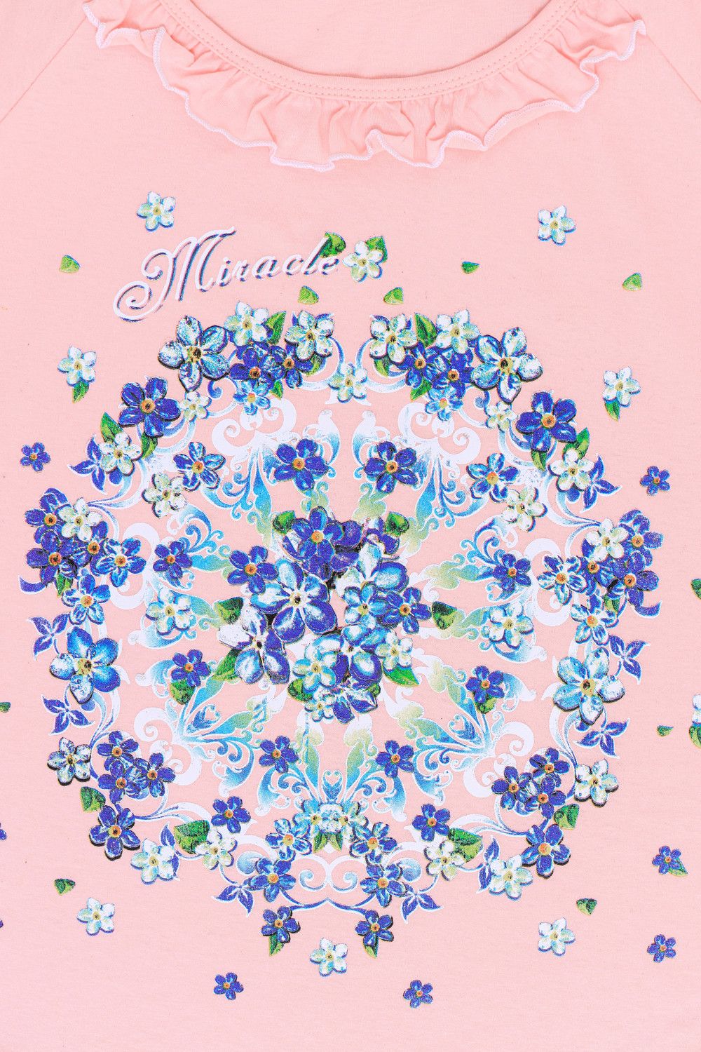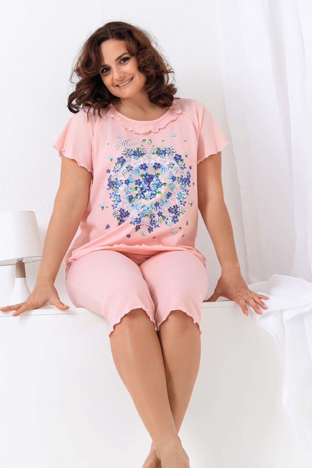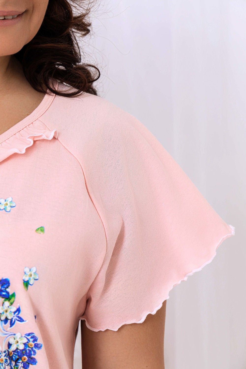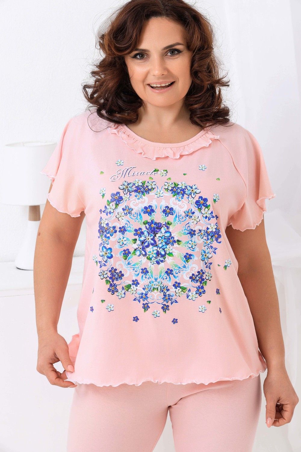 Пижама женская с симпатичной рюшей по горловине. Очень свободный и удобный крой. Рукав-реглан не стесняет движение рук. Обработка рукава и низа изделия в виде лёгкой волны придаёт лёгкость и воздушность. Шикарный принт в виде орнамента из россыпи цветов. Оттенок ментола может отличаться от фото.