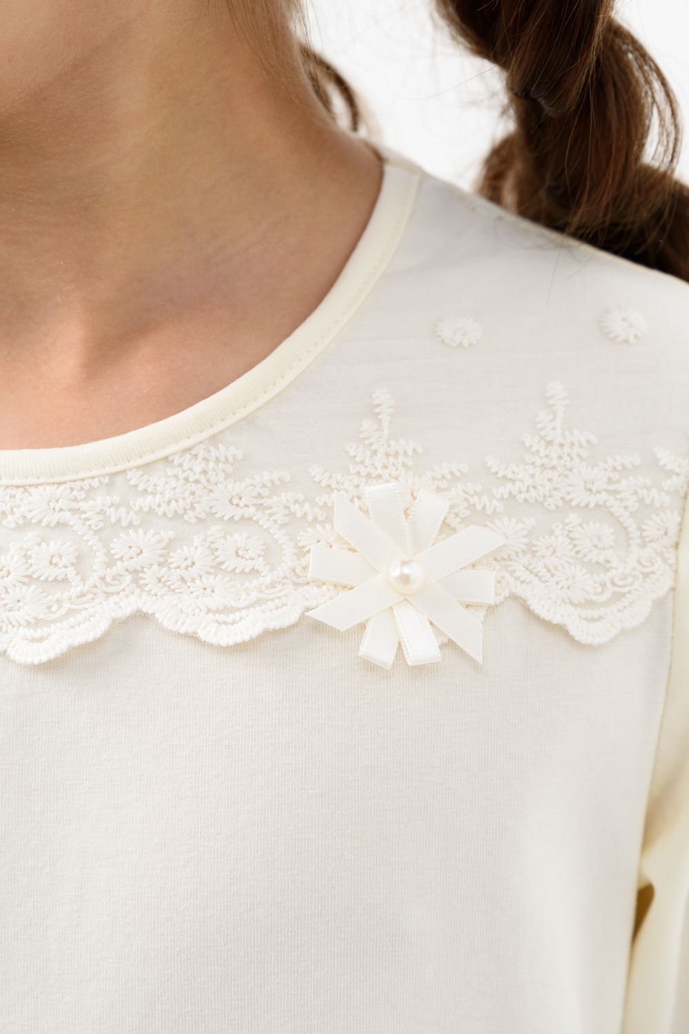 Блузка школьная для девочки с трикотажными длинными рукавами, круглым вырезом горловины, без застежки, прилегающего силуэта, на деталь переда настрочена кружевная кокетка, спереди на кружево сбоку прикреплен декоративный элемент. Сшита из однотонного мягкого хлопкового трикотажного материала с добавлением в состав хлопка 92% и лайкры 8 %. Школьная форма украсит и дополнит любой образ не только в школу, но и для повседневной носки, на день рождения, фотосессию и для особых случаев. Блузка отлично сидит по фигуре, движения в нем комфортные, позволяет выглядеть ребенку изящно. Отлично сохраняют цвет и форму при активной носке и после многократных стирок. Используемый материал блузки мягкий и приятный телу, устойчив к износу, не садится, не образует катышек на поверхности, имеет эффектный внешний вид.